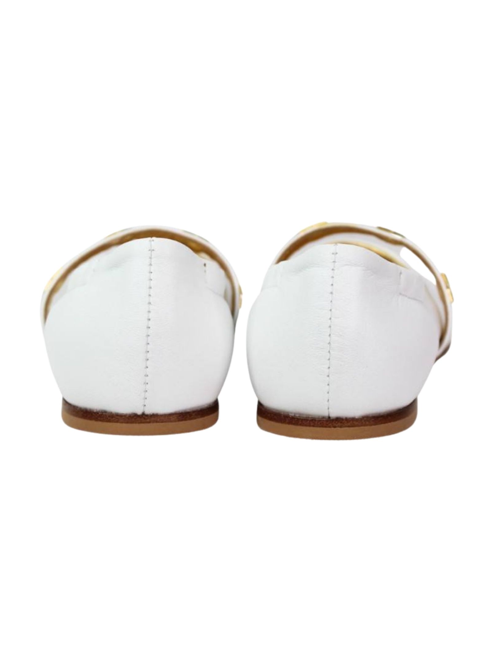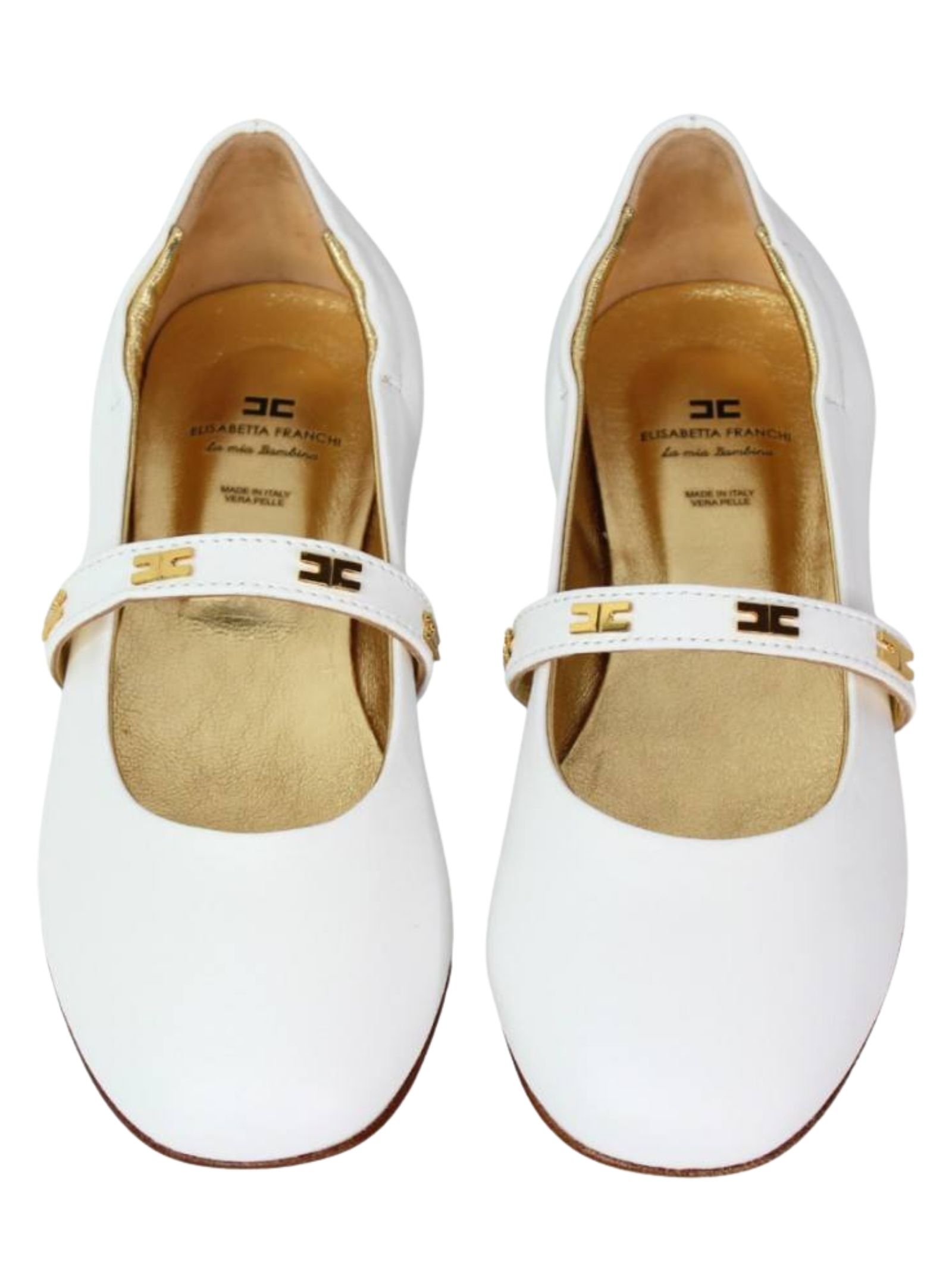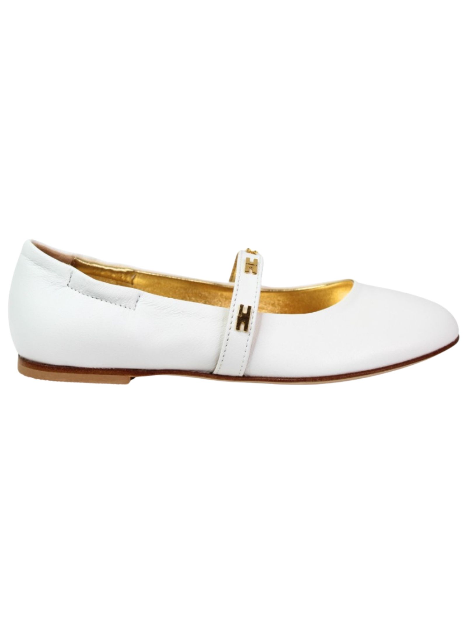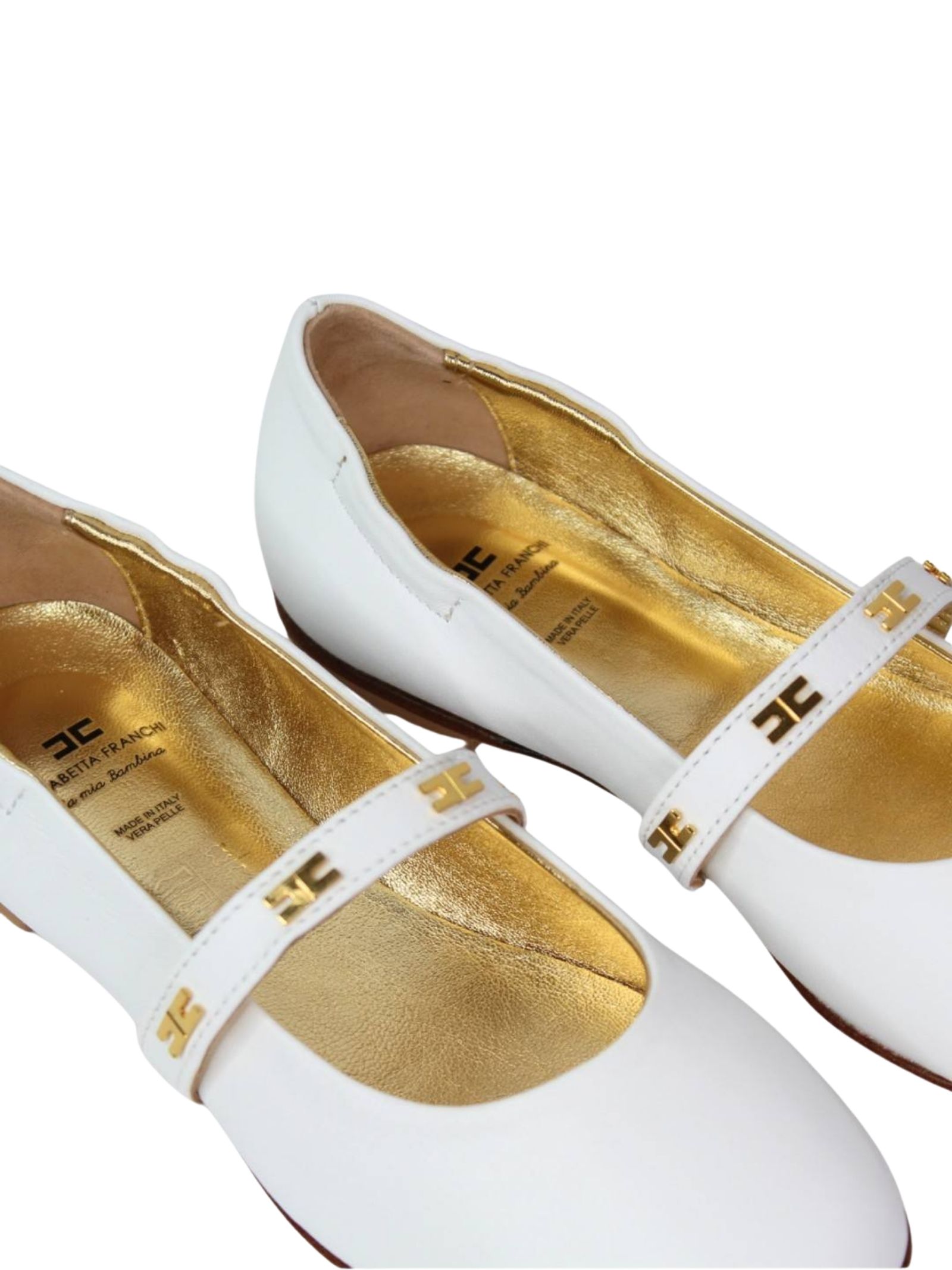 Elisabetta Franchi Kids ballerine di colore bianco, realizzate in vera pelle, banda applicata con applicazione logo in metallo color oro, design punta tonda, suola in gomma. Made in Italy