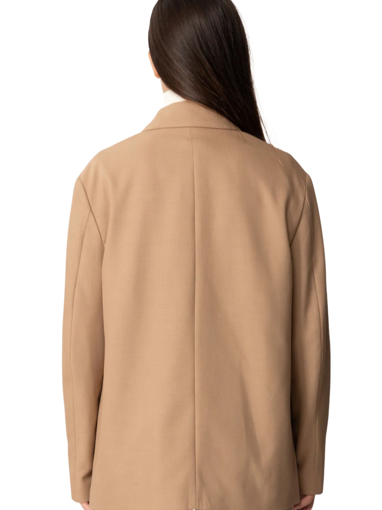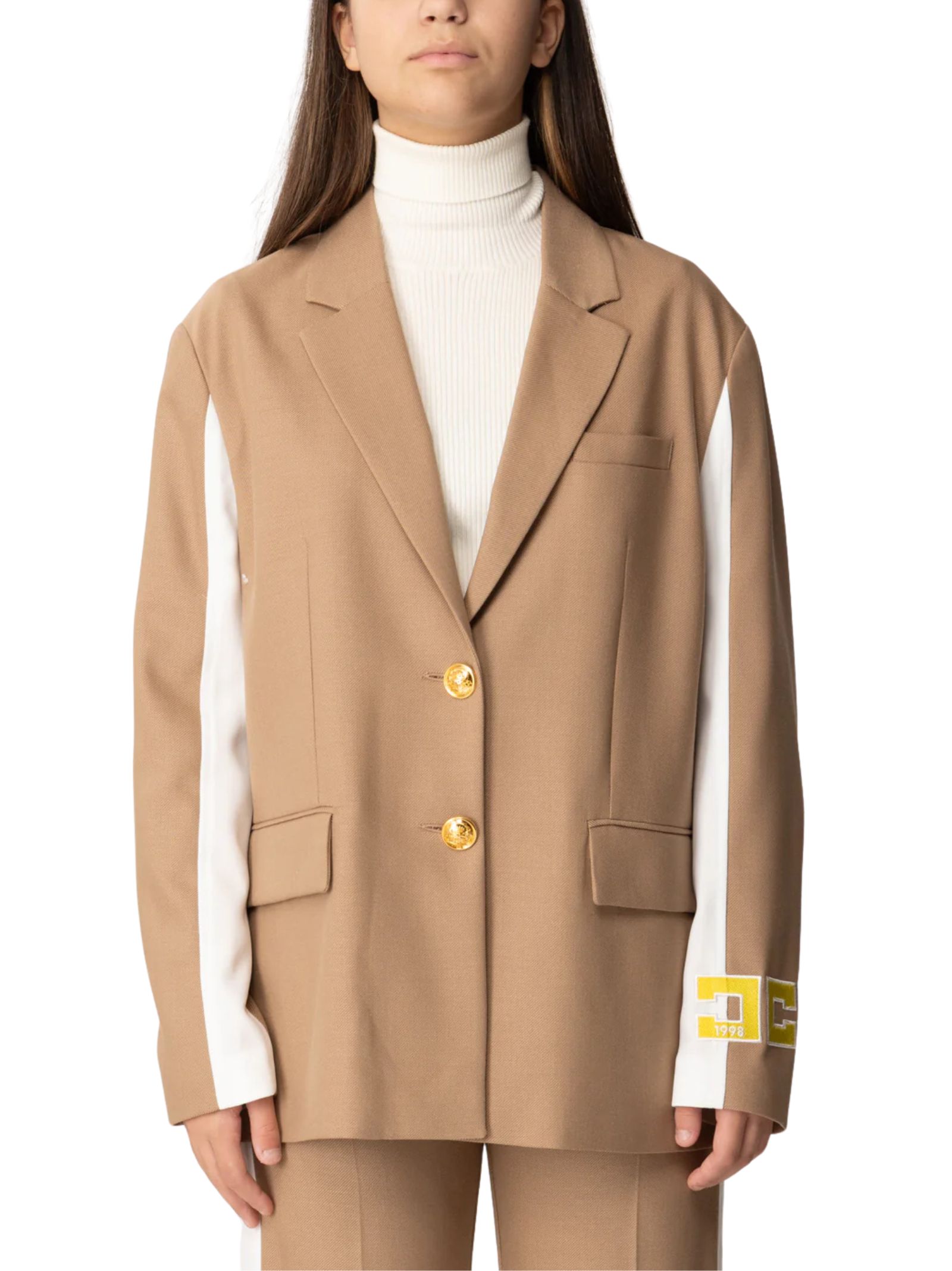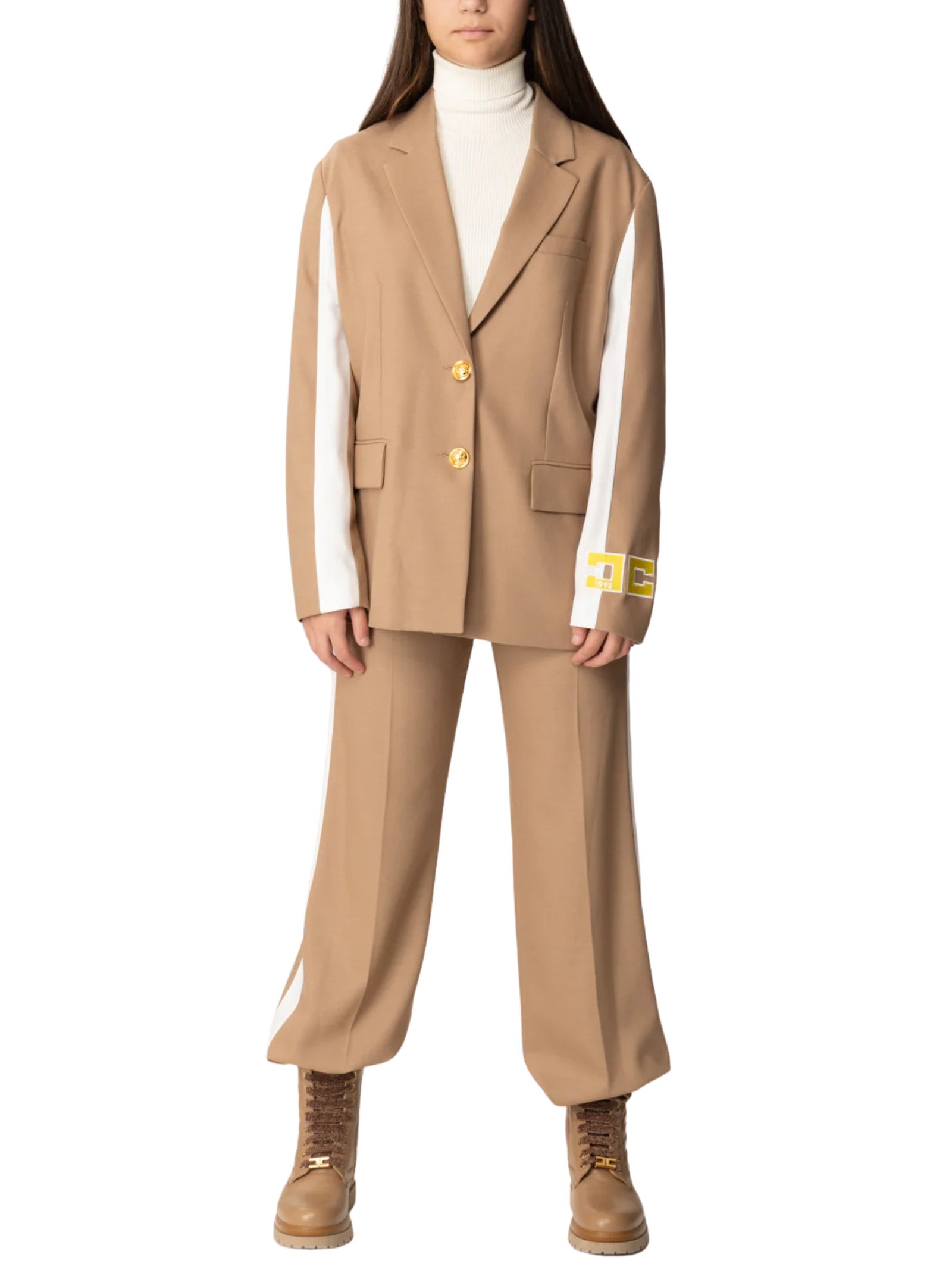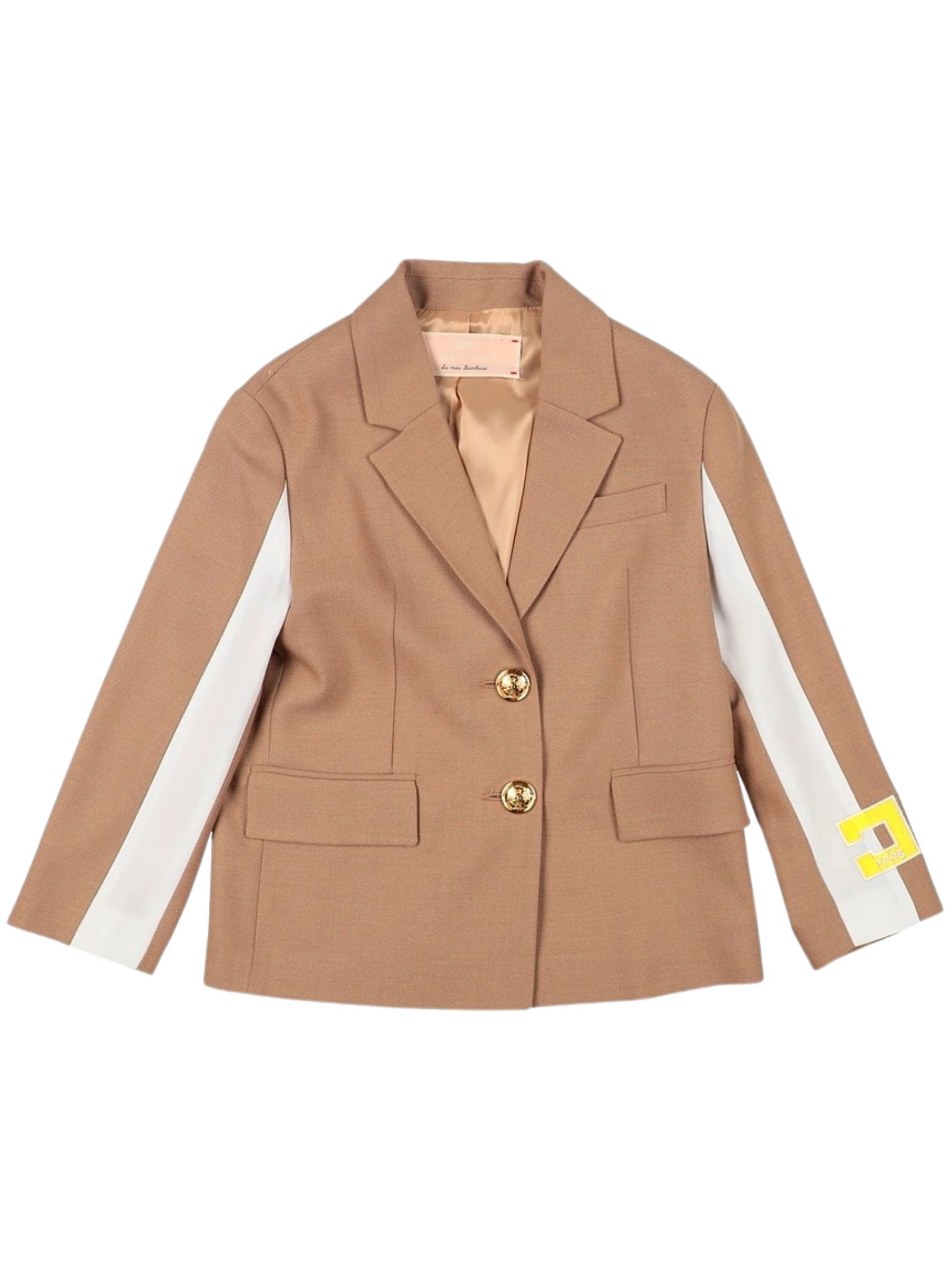 Elisabetta Franchi Kids giacca di colore beige, bande laterali a contrasto bianco, design con due bottoni, due tasche con patta, dettaglio logo ricamato a contrasto. Composizione: 54% lana 30% poliestere 16% viscosa. Made in Italy