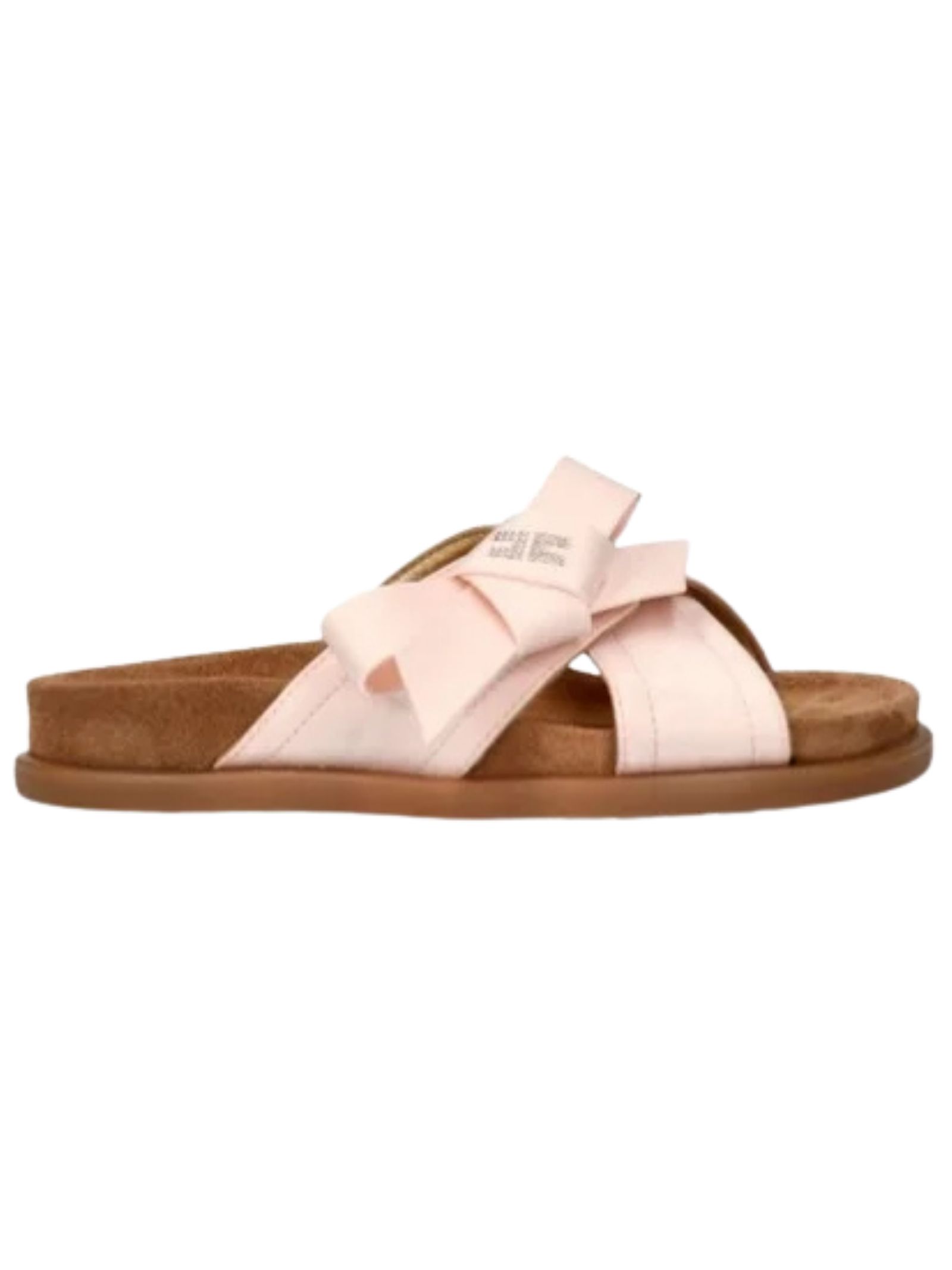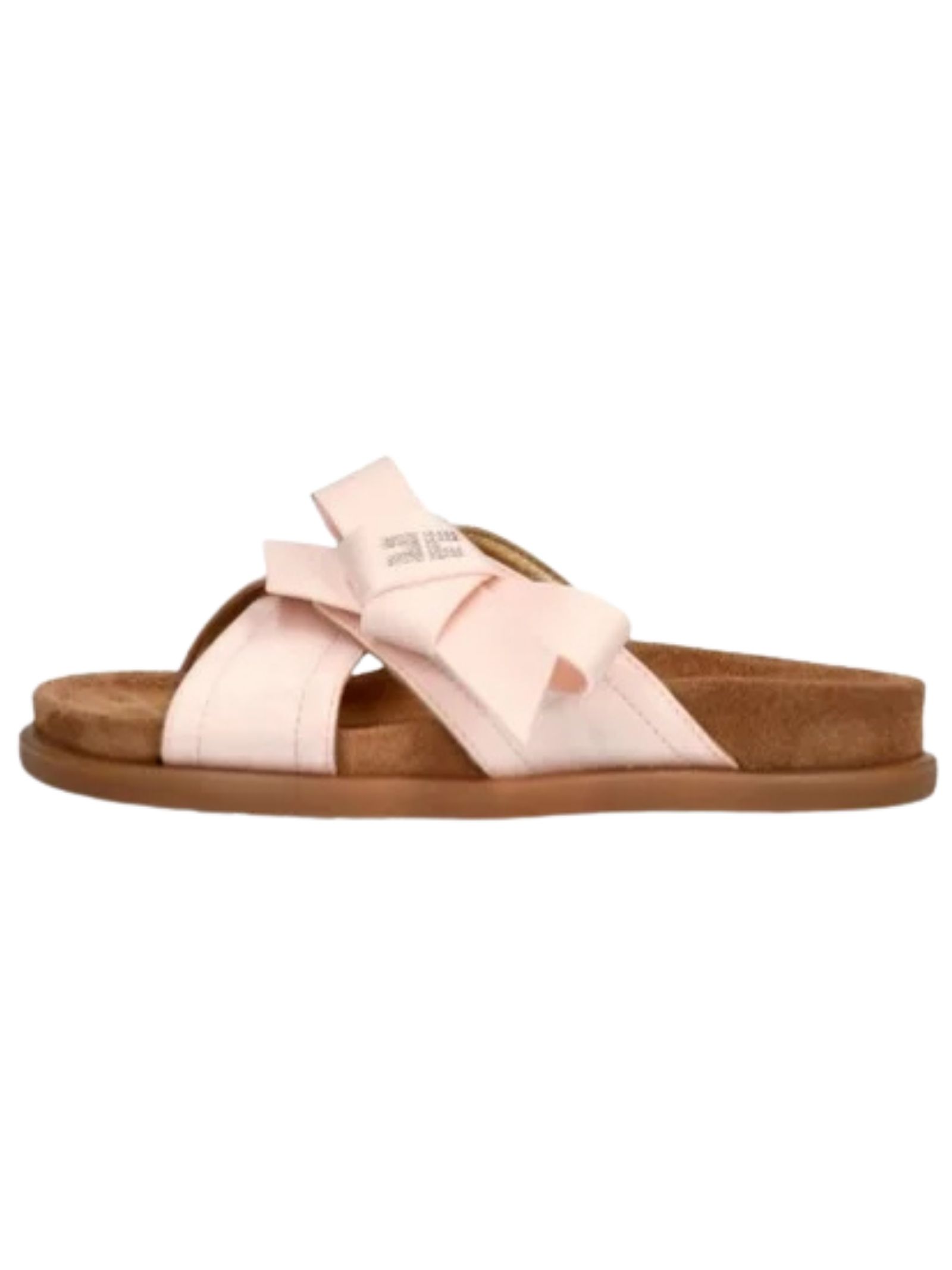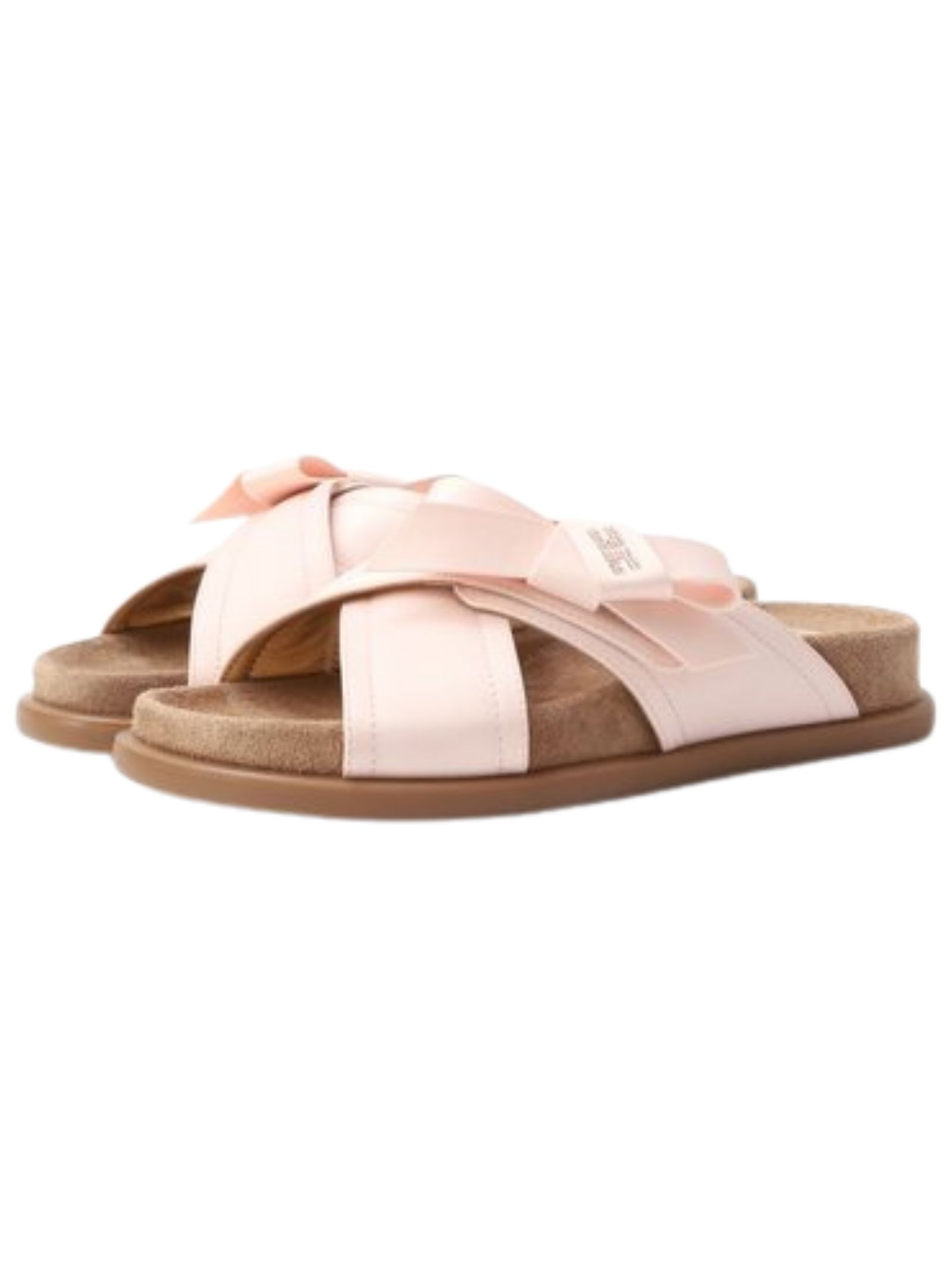 Ciabatte rosa Elisabetta Franchi Kids, realizzate in vera pelle rivestita in tessuto effetto raso, caratterizzate da un design incrociato, un fiocco laterale con micrologo in strass e una suola in gomma. Made in Italy.