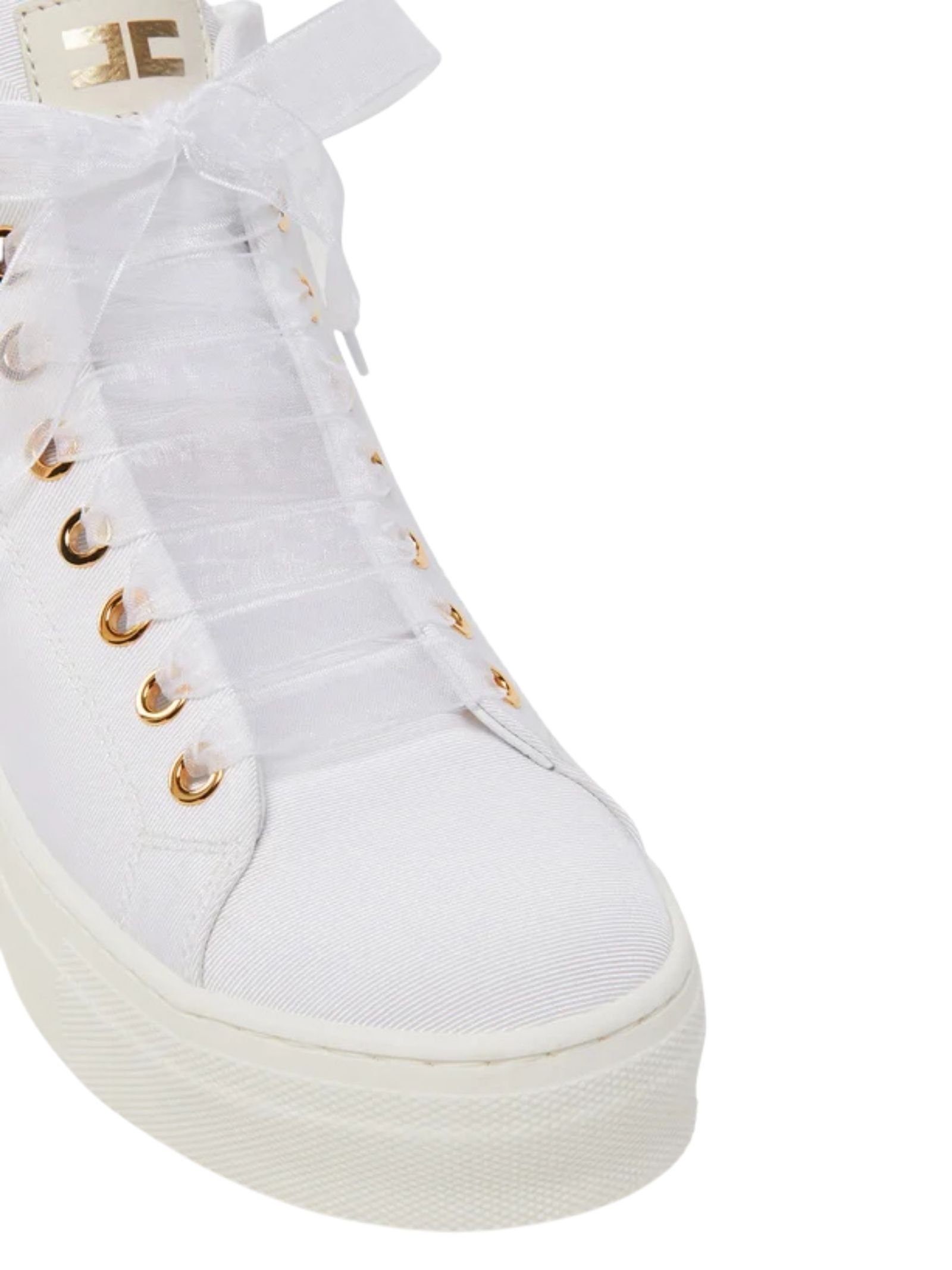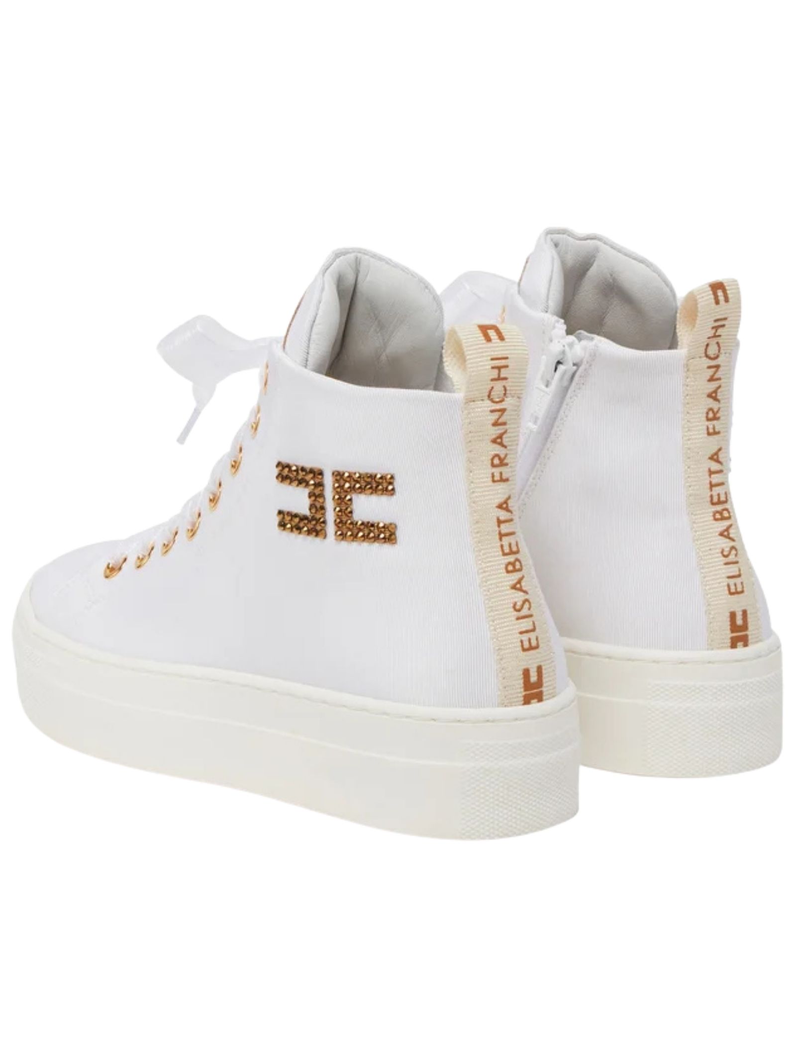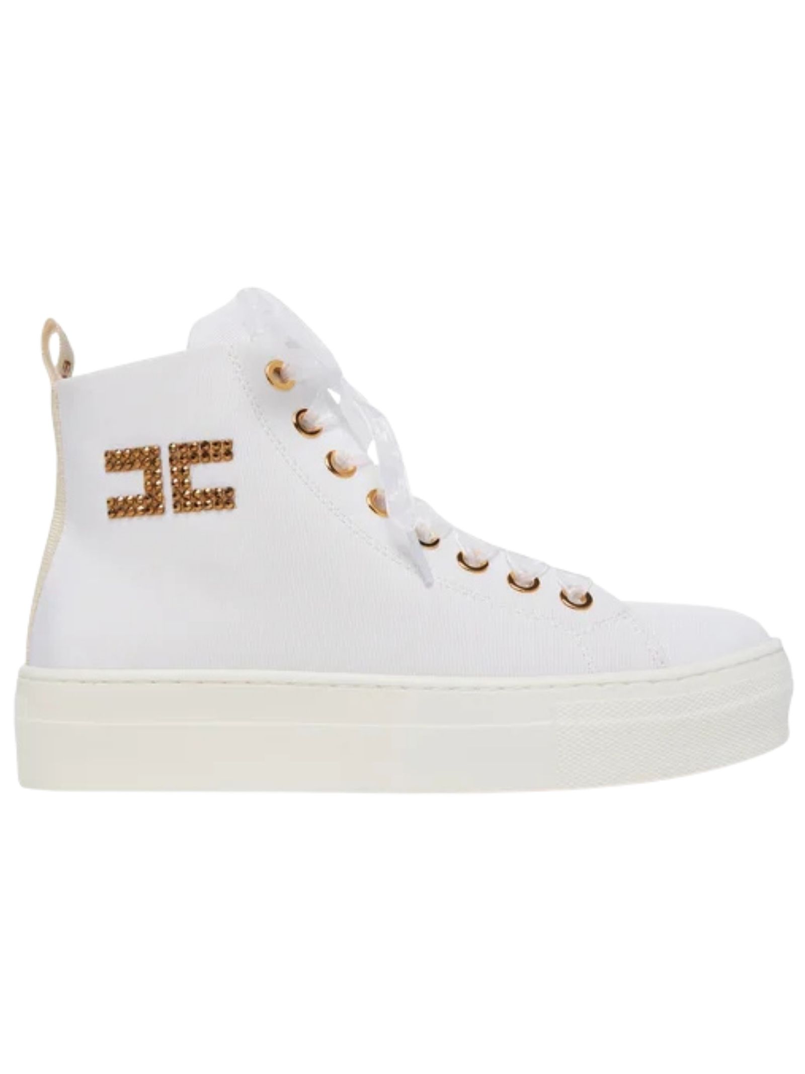 Elisabetta Franchi Kids scarpe in pelle rivestite in tessuto di colore bianco, dettagli a contrasto oro, modello alto con punta tonda, chiusura frontale con lacci in seta, logo in strass a contrasto, fodera in pelle, suola alta in gomma Made in Italy