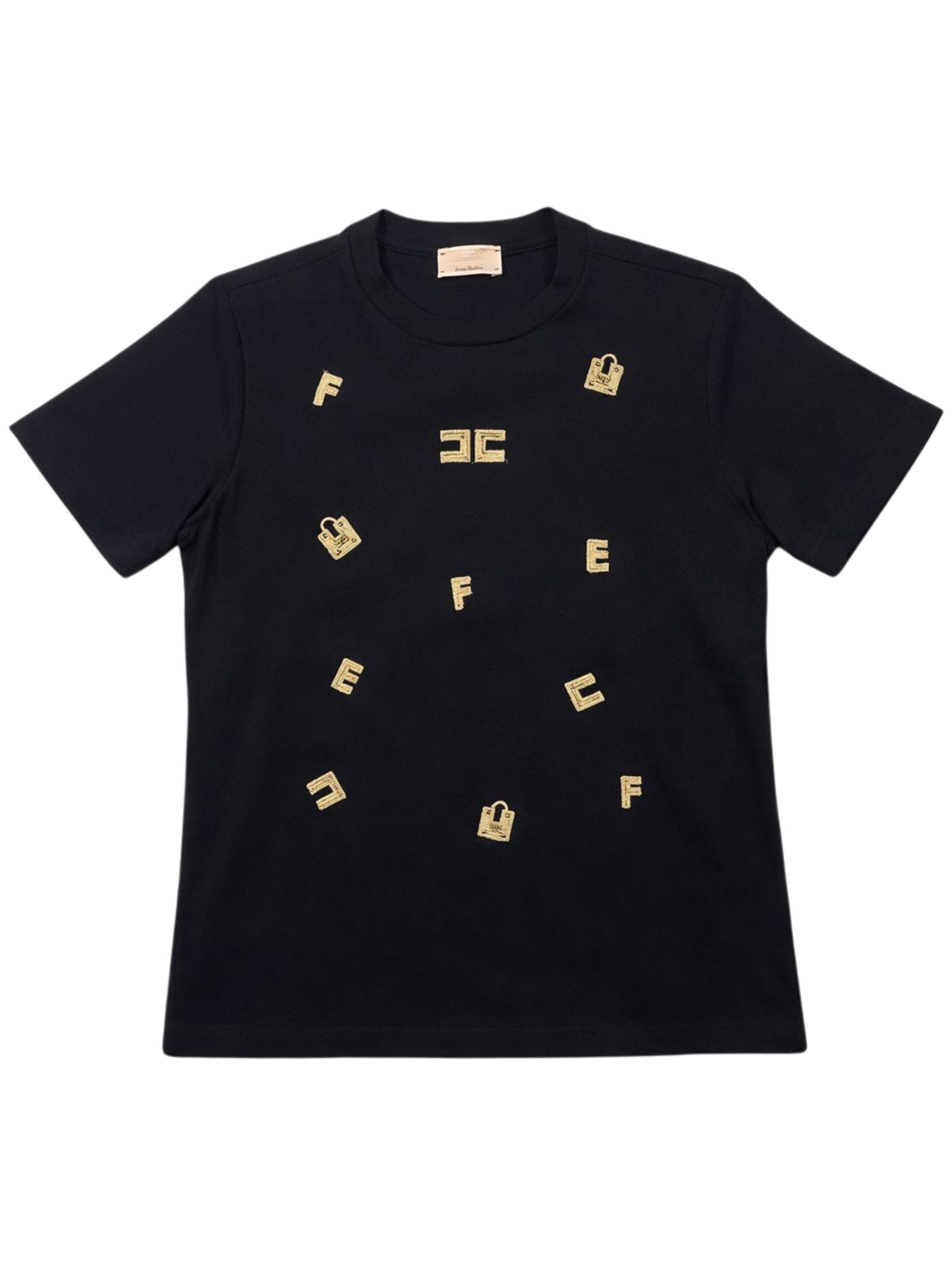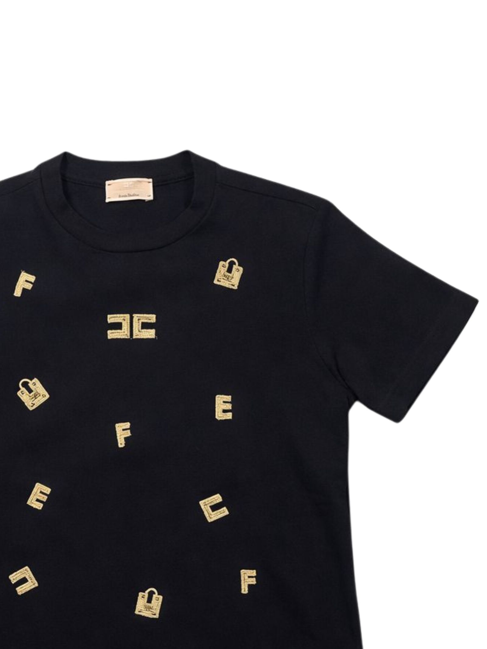 Elisabetta Franchi Kids t-shirt di colore nero, modello girocollo, mezze maniche, dettaglio ricami sparsi sulla parte frontale a contrasto oro con logo, orlo dritto, vestibilità regolare. Composizione: 94% cotone 6% elastan. Made in Italy