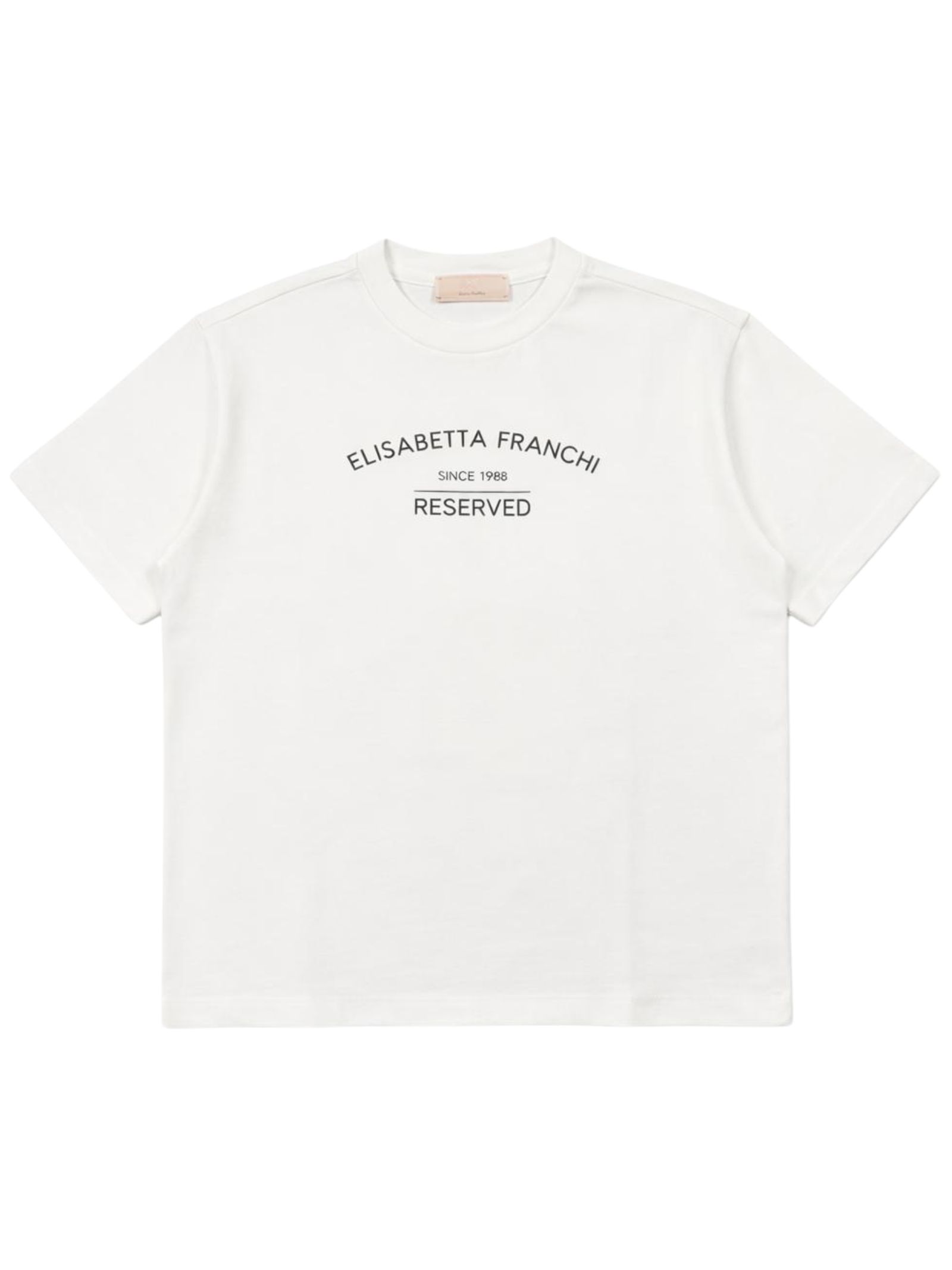 Elisabetta Franchi Kids t-shirt di colore panna, modello girocollo, mezze maniche, stampa logo centrale a contrasto, orlo dritto, vestibilità ampia. Composizione: 94% cotone 6% elastan. Made in Italy