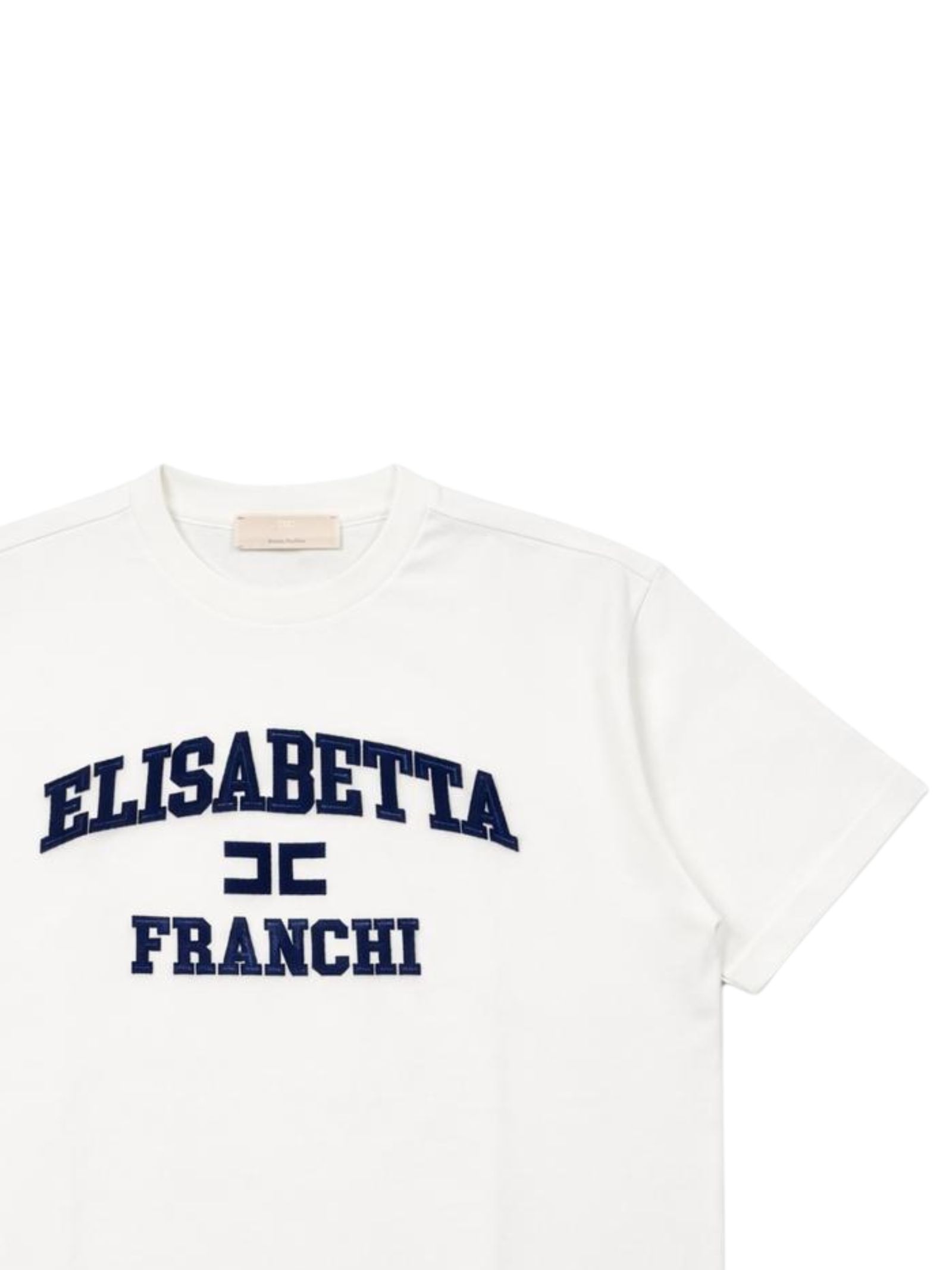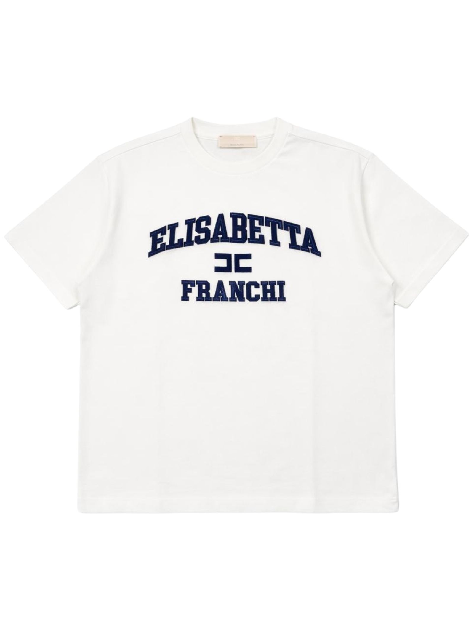 Elisabetta Franchi Kids t-shirt di colore panna, modello girocollo, mezze maniche, ricamo logo centrale in rilievo a contrasto blu/bordeau, orlo dritto, vestibilità ampia. Composizione: 94% cotone 6% elastan. Made in Italy