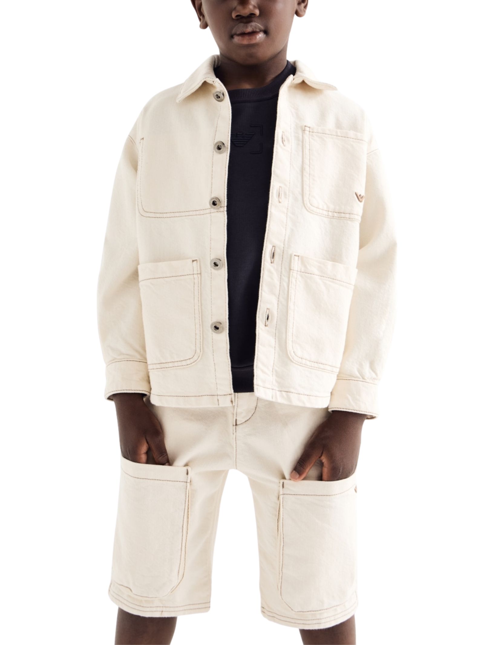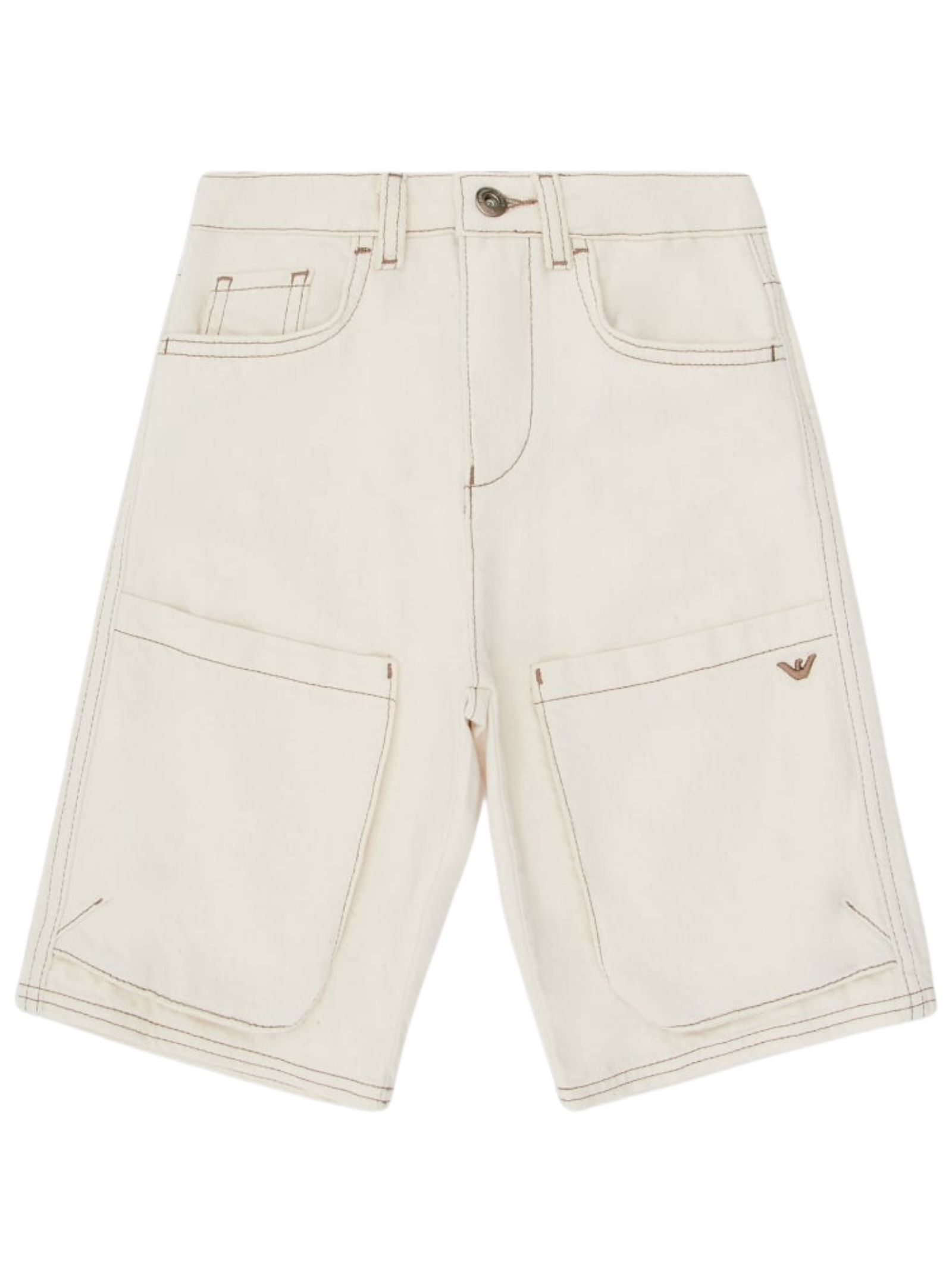 Emporio Armani Junior bermuda di colore sabbia, modello 5 tasche, vita regolare, applicazione logo in metallo, due tasconi frontali, vestibilità regolare. Composizione: 100% Cotone