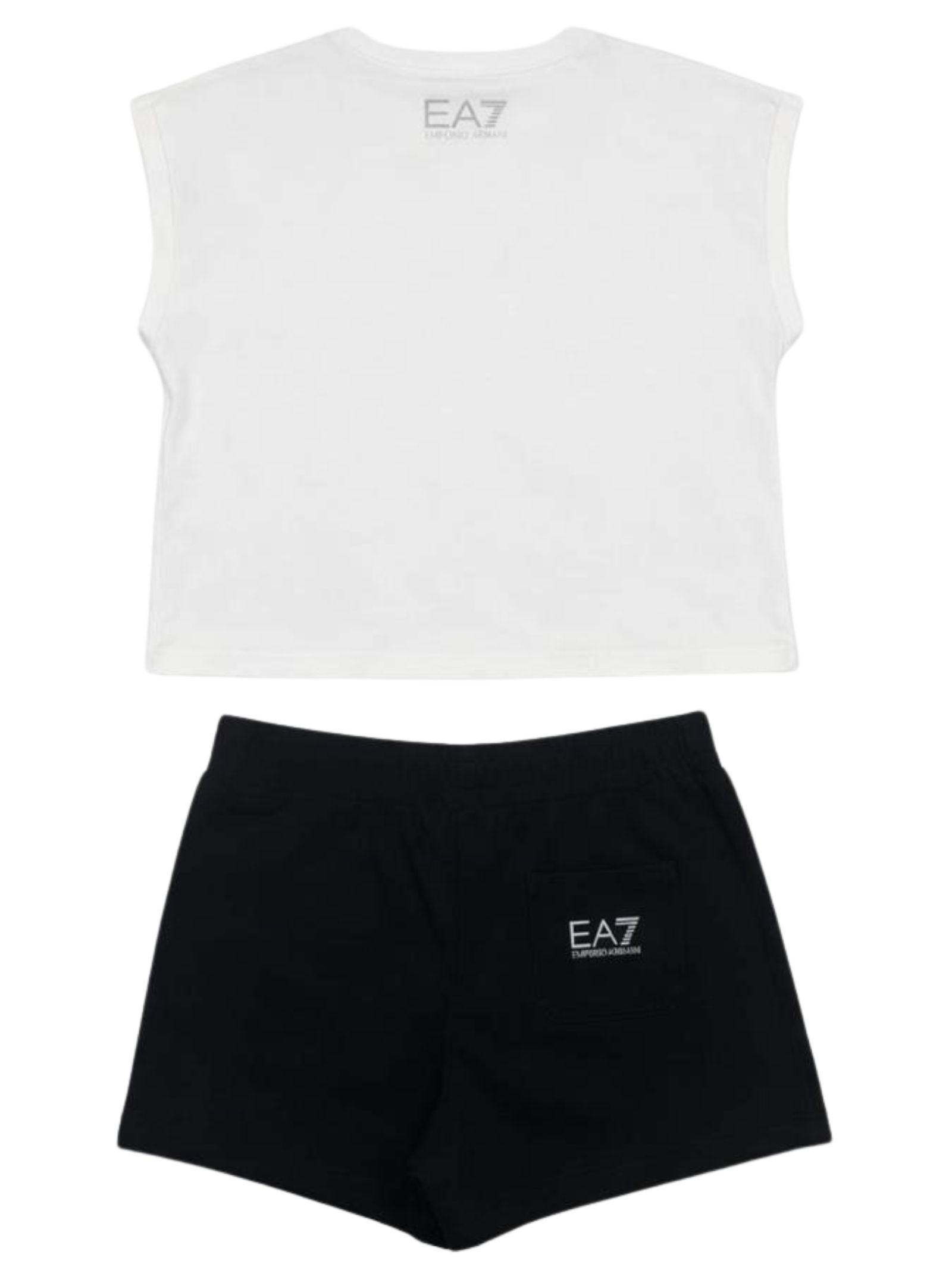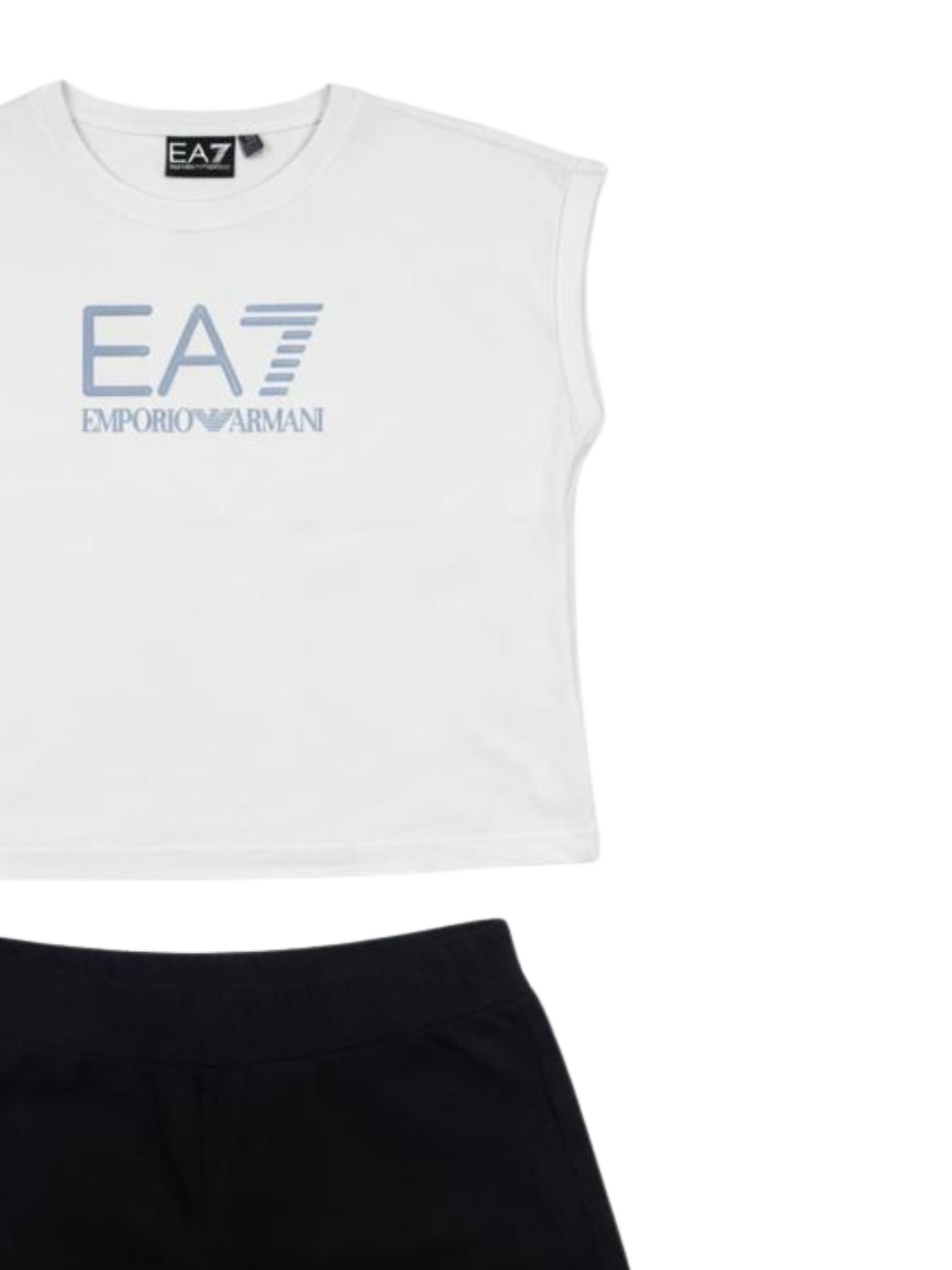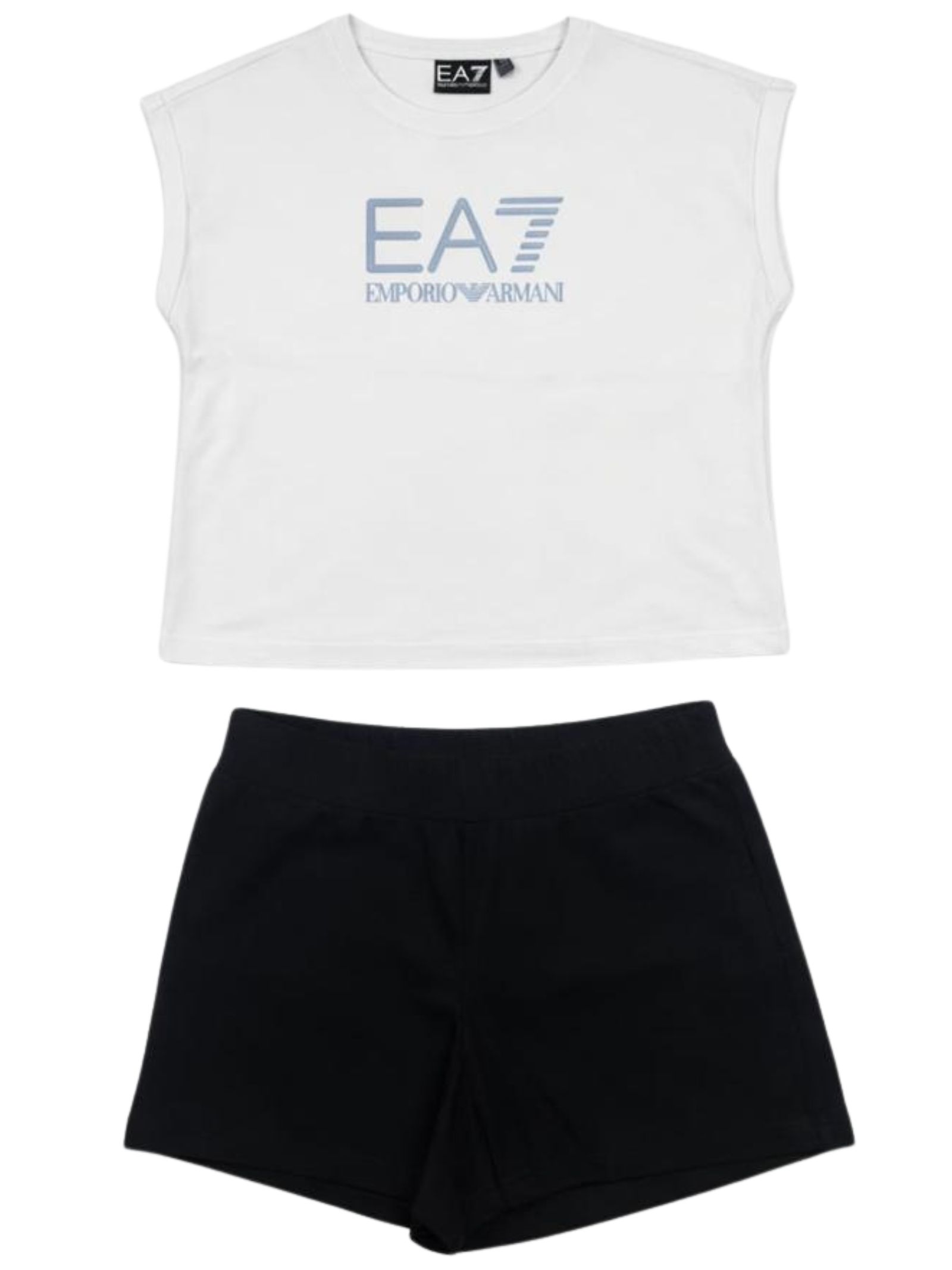 Emporio Armani Junior completo di colore bianco/nero, composto da t-shirt girocollo, mezza manica accennata, logo a contrasto; shorts abbinati con elastico in vita e una tasca sul retro, vestibilità regolare. Composizione: 100% cotone