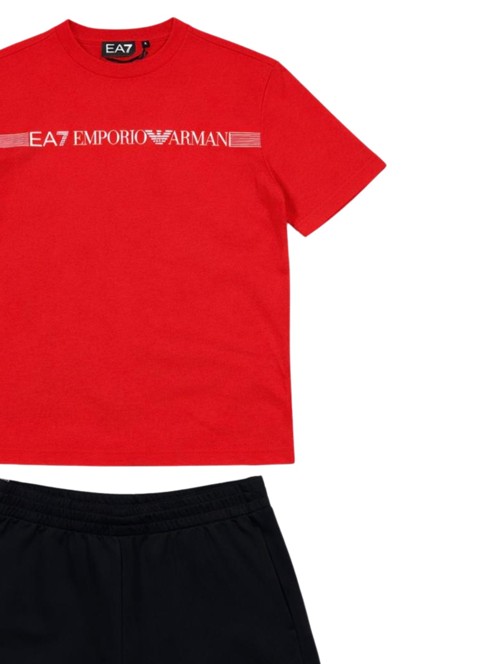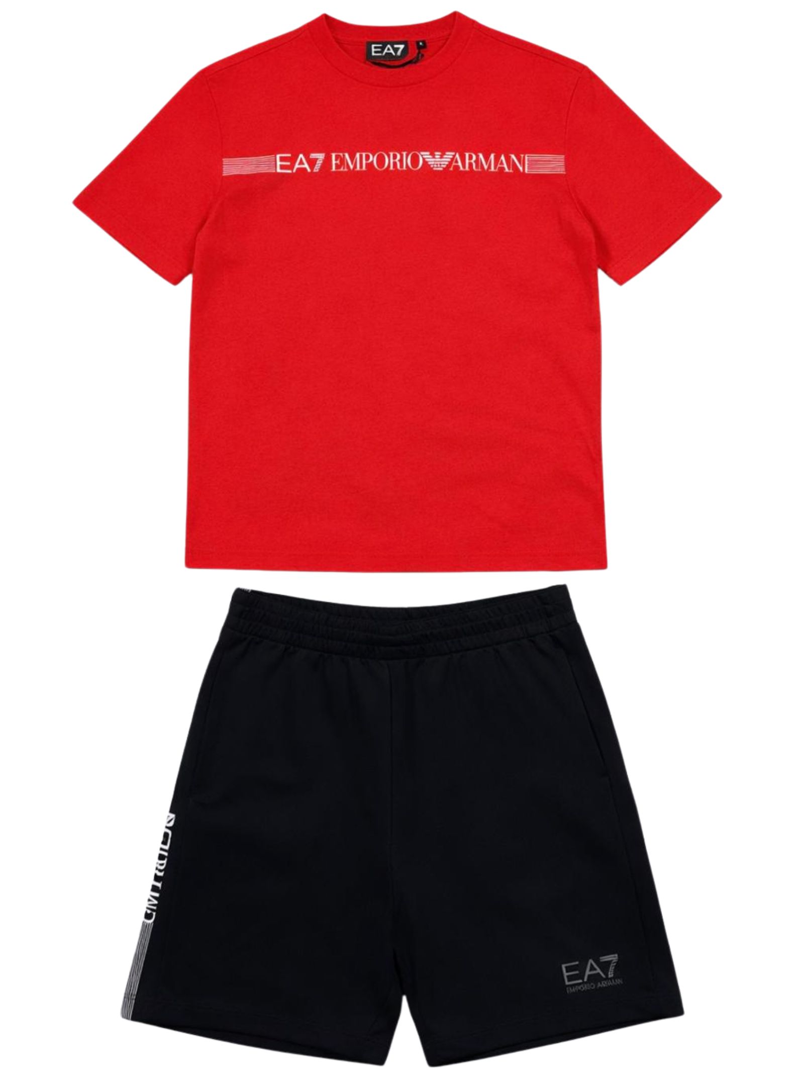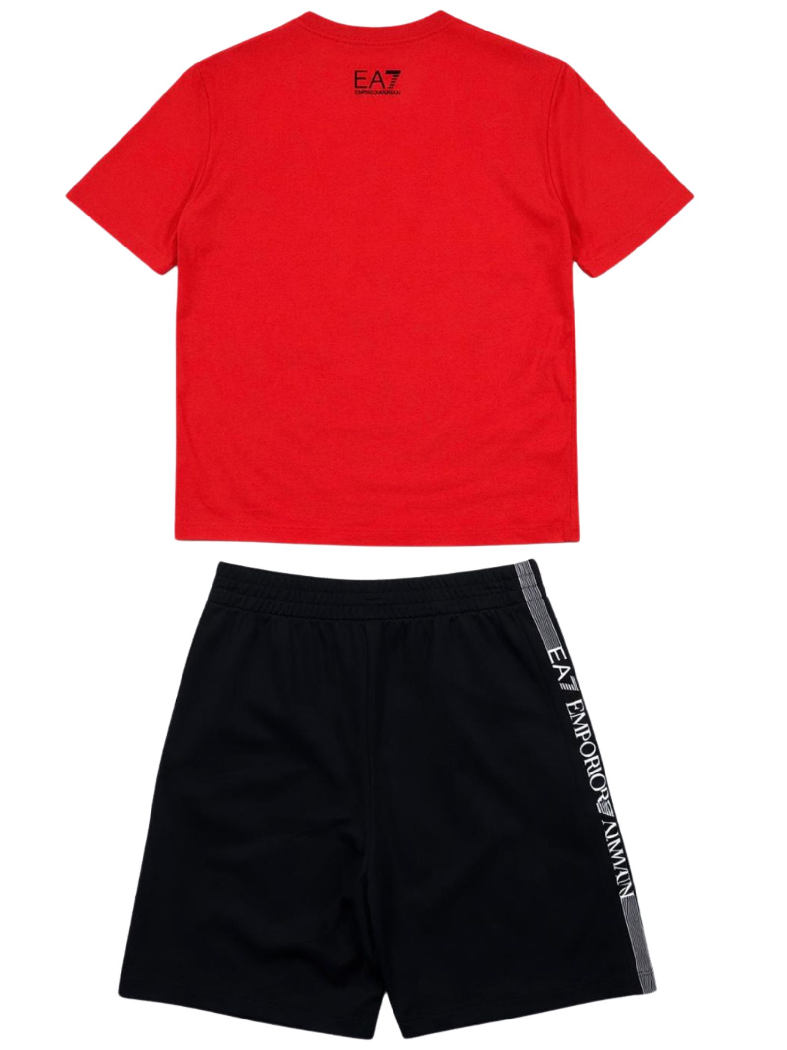 Emporio Armani Junior completo di colore rosso/nero, composto da composto da t-shirt girocollo, mezza manica, logo a contrasto; bermuda con elastico in vita, stampa a contrasto con logo, due tasche laterali, vestibilità regolare. Composizione: 100% Cotone