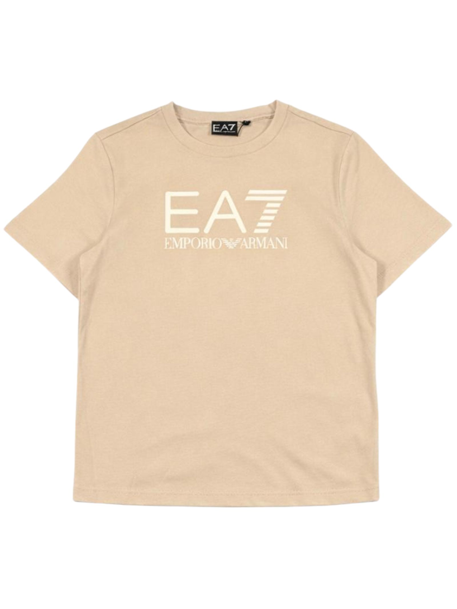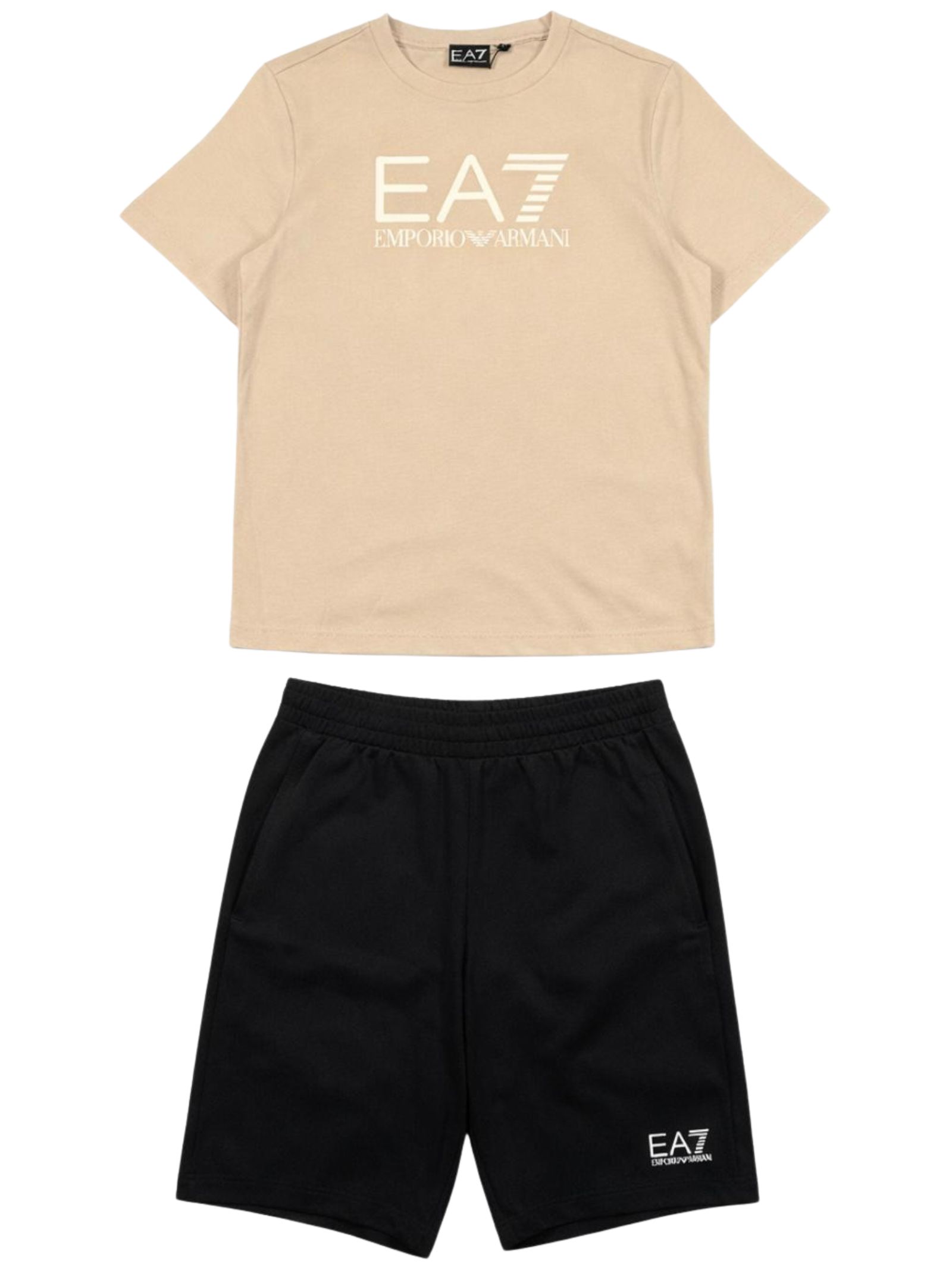 Emporio Armani Junior completo di colore sabbia/nero, composto da t-shirt girocollo, mezza manica, logo a contrasto; bermuda con elastico in vita, stampa a contrasto con logo, due tasche laterali, vestibilità regolare. Composizione: 100% Cotone
