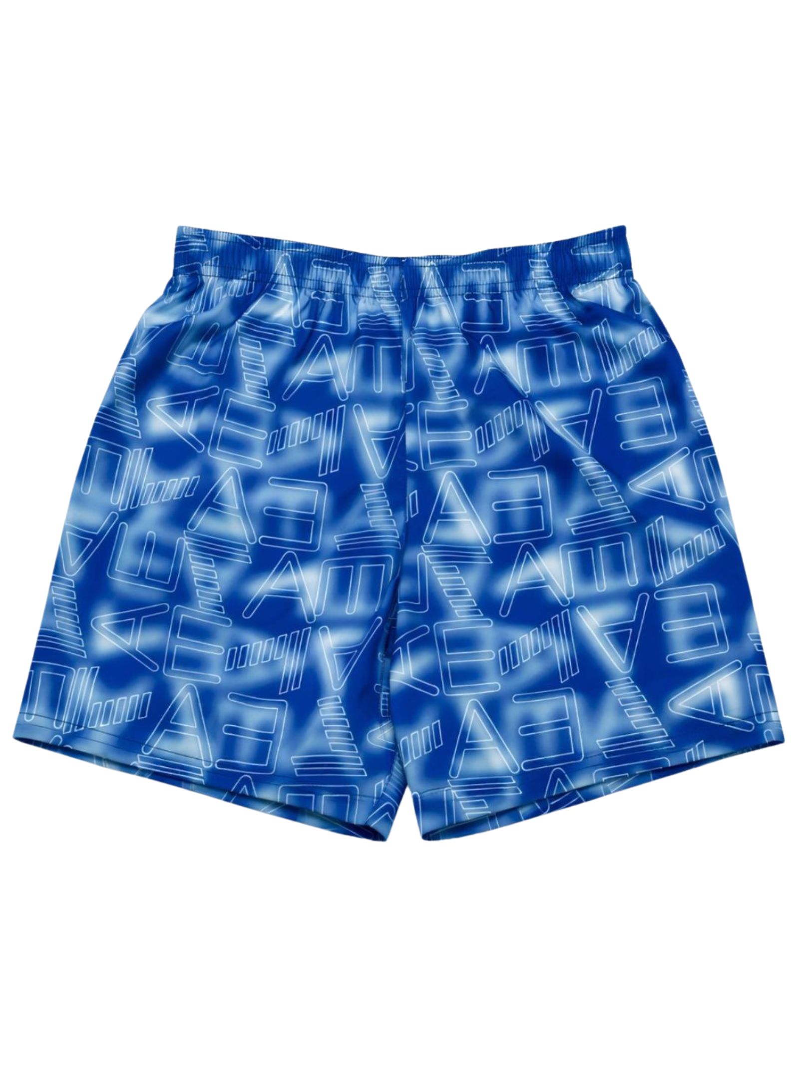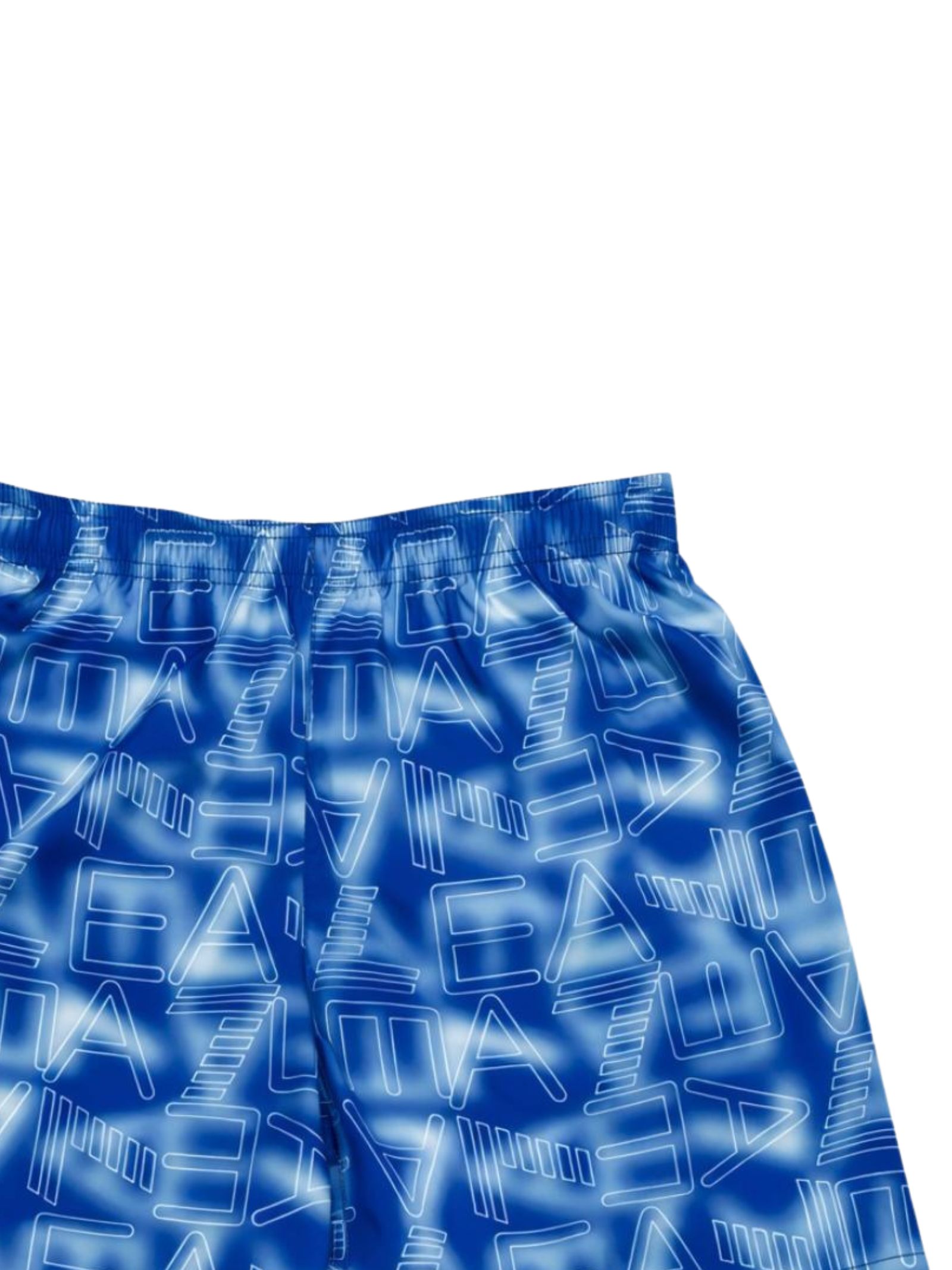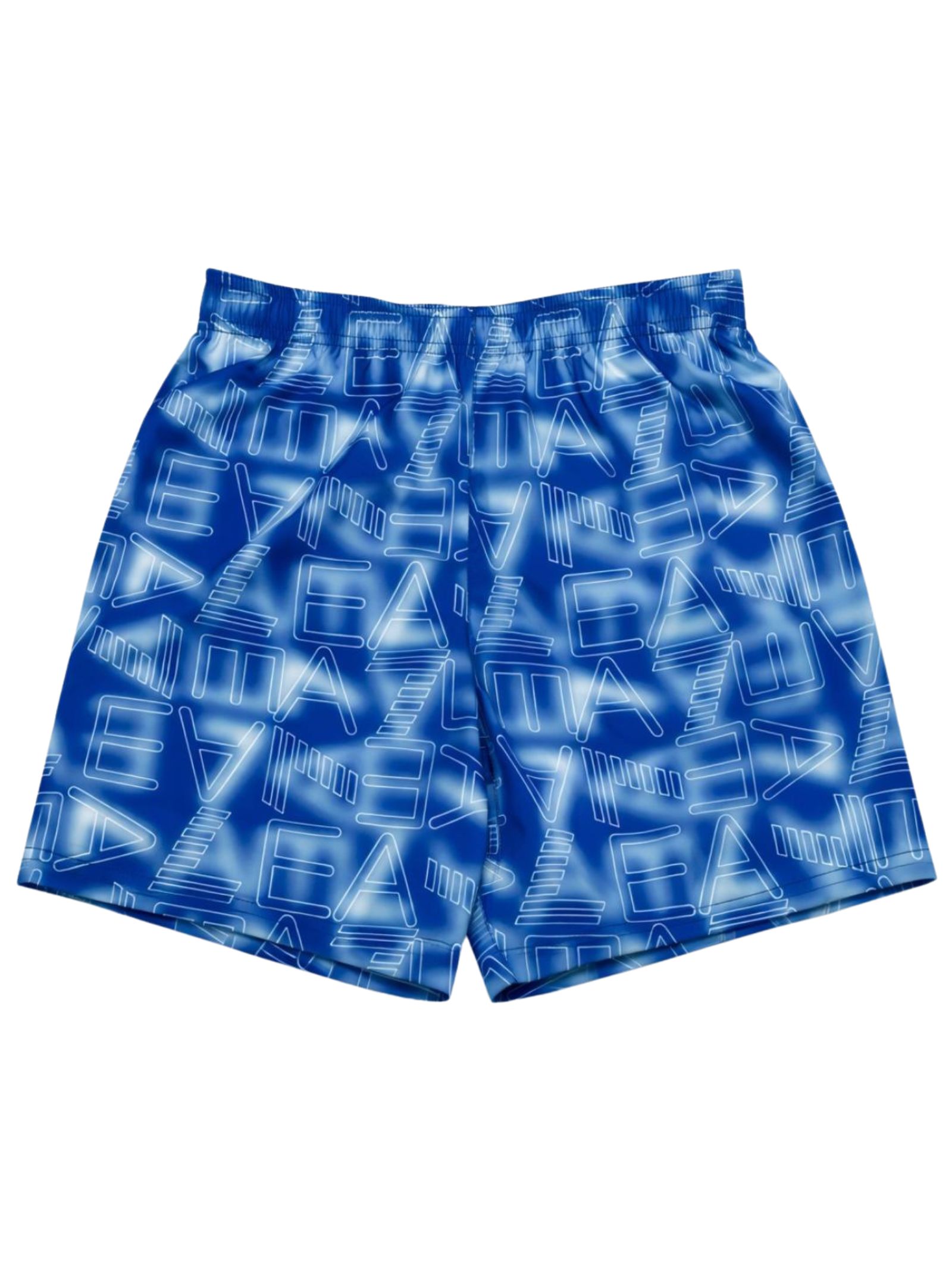 Emporio Armani Junior costume da bagno di colore azzurro, stampa logo all-over a contrasto bianco, modello boxer, elastico in vita, slip interno, tasca sul retro. Composizione: 100% poliestere