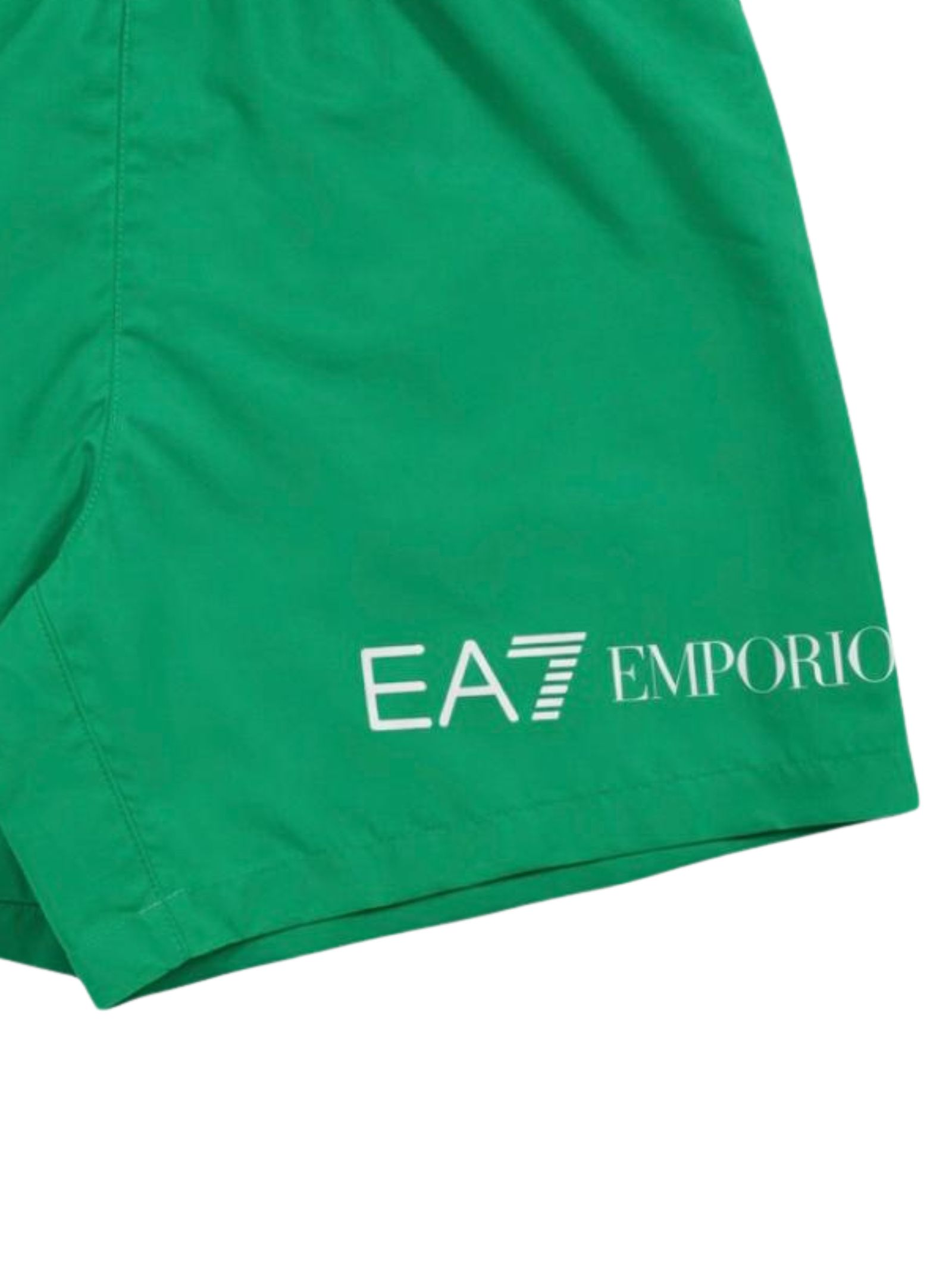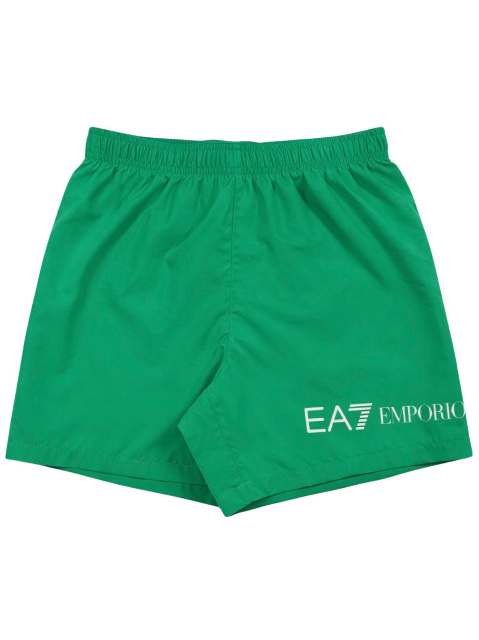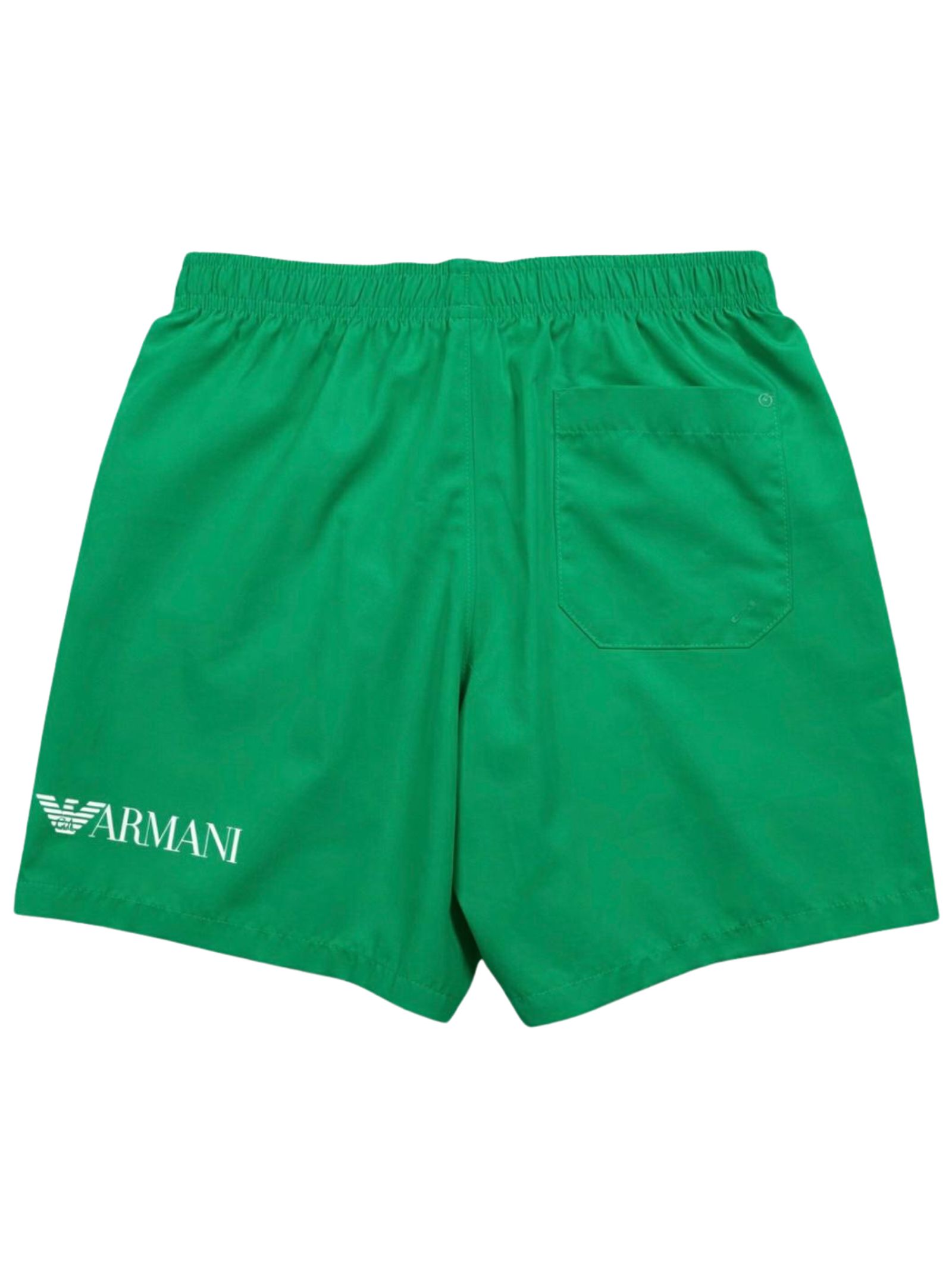 Emporio Armani Junior costume da bagno di colore verde, stampa logo laterale a contrasto bianco, modello boxer, elastico in vita, slip interno, tasca sul retro. Composizione: 100% poliestere