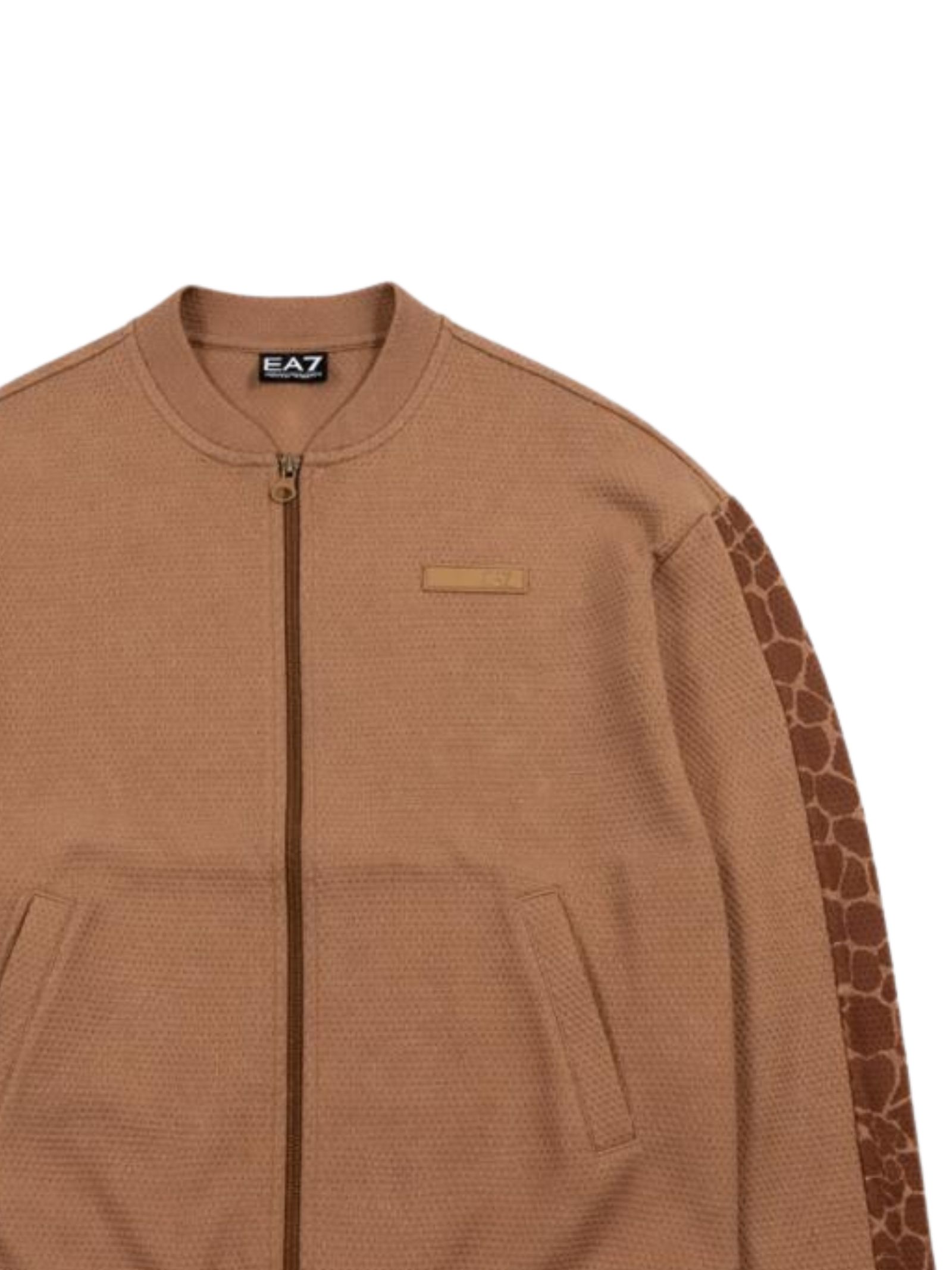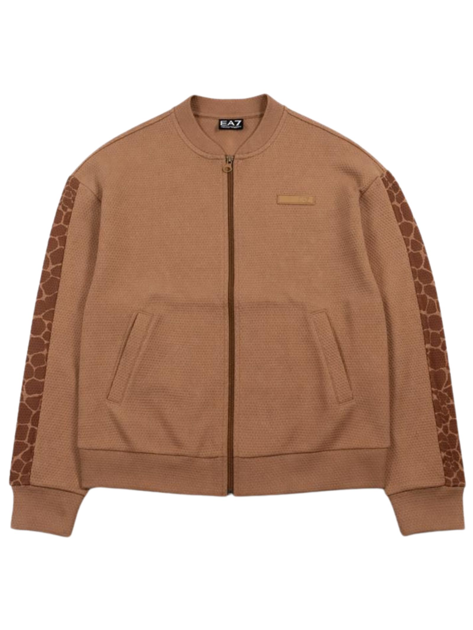 Emporio Armani Junior felpa di colore beige, realizzata in cotone effetto nido d'ape, modello con zip centrale, maniche lunghe con stampa a contrasto, due tasche laterali, vestibilità regolare. Composizione: 100% cotone