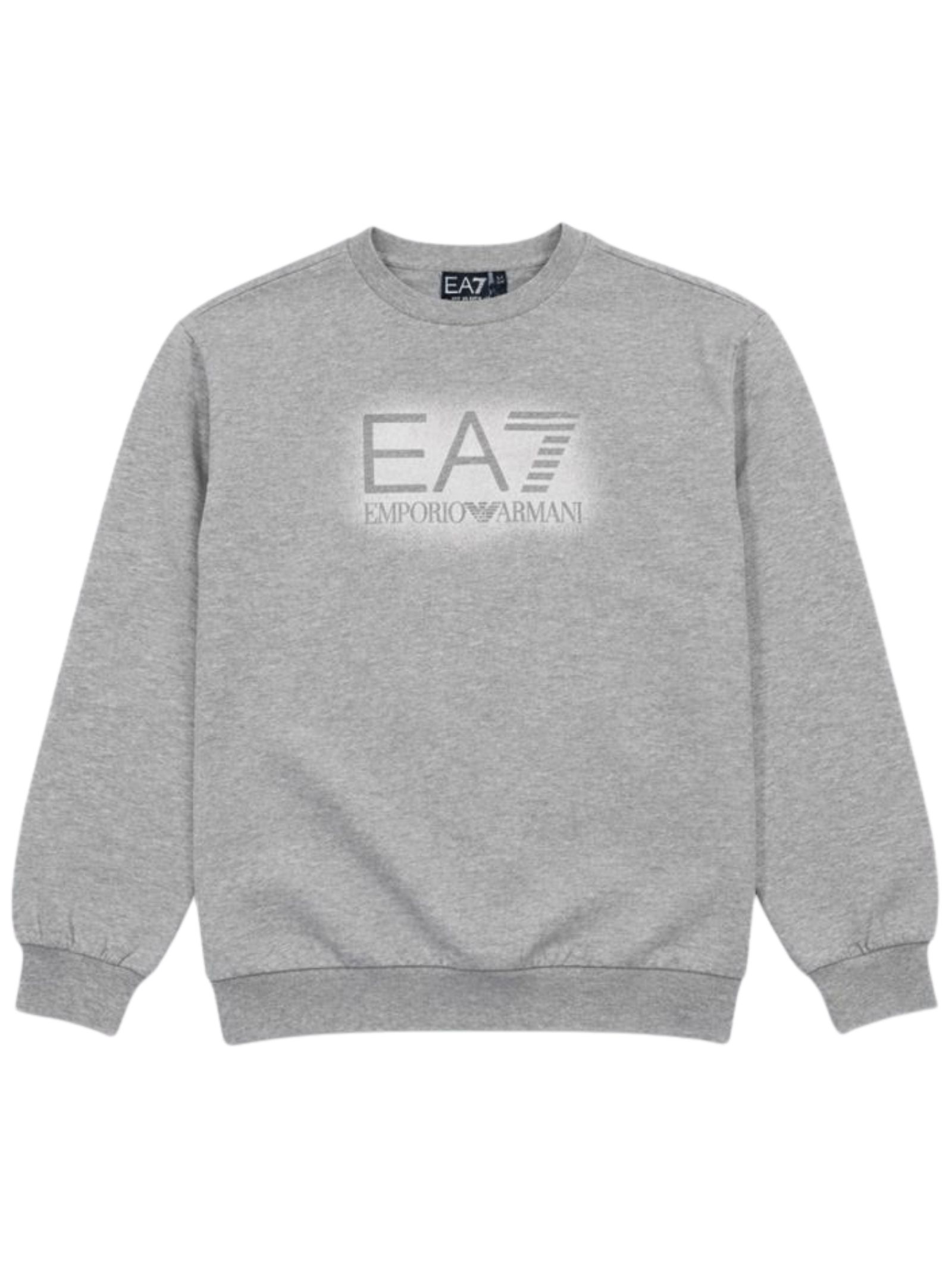 Emporio Armani Junior felpa di colore grigio, modello con cappuccio, maniche lunghe, stampa a contrasto con logo, vestibilità regolare. Composizione: 95% Cotone 5% Elastan