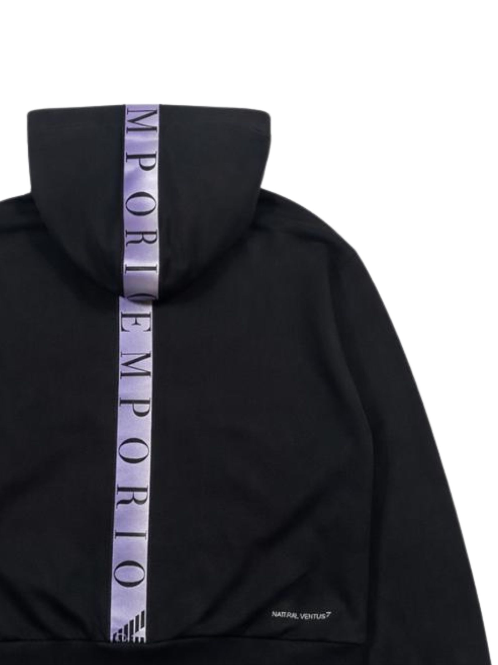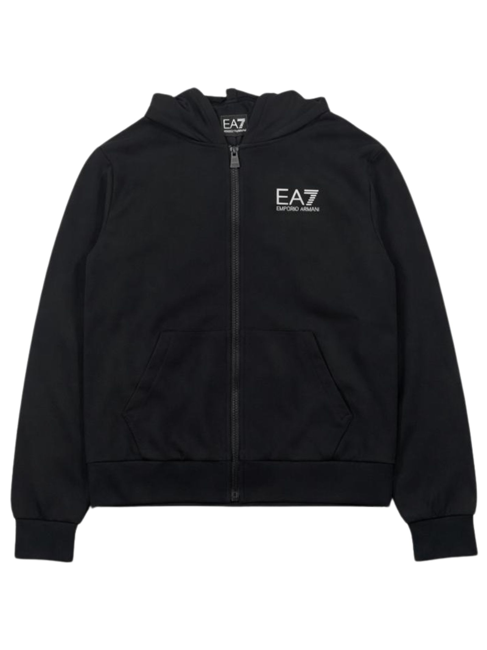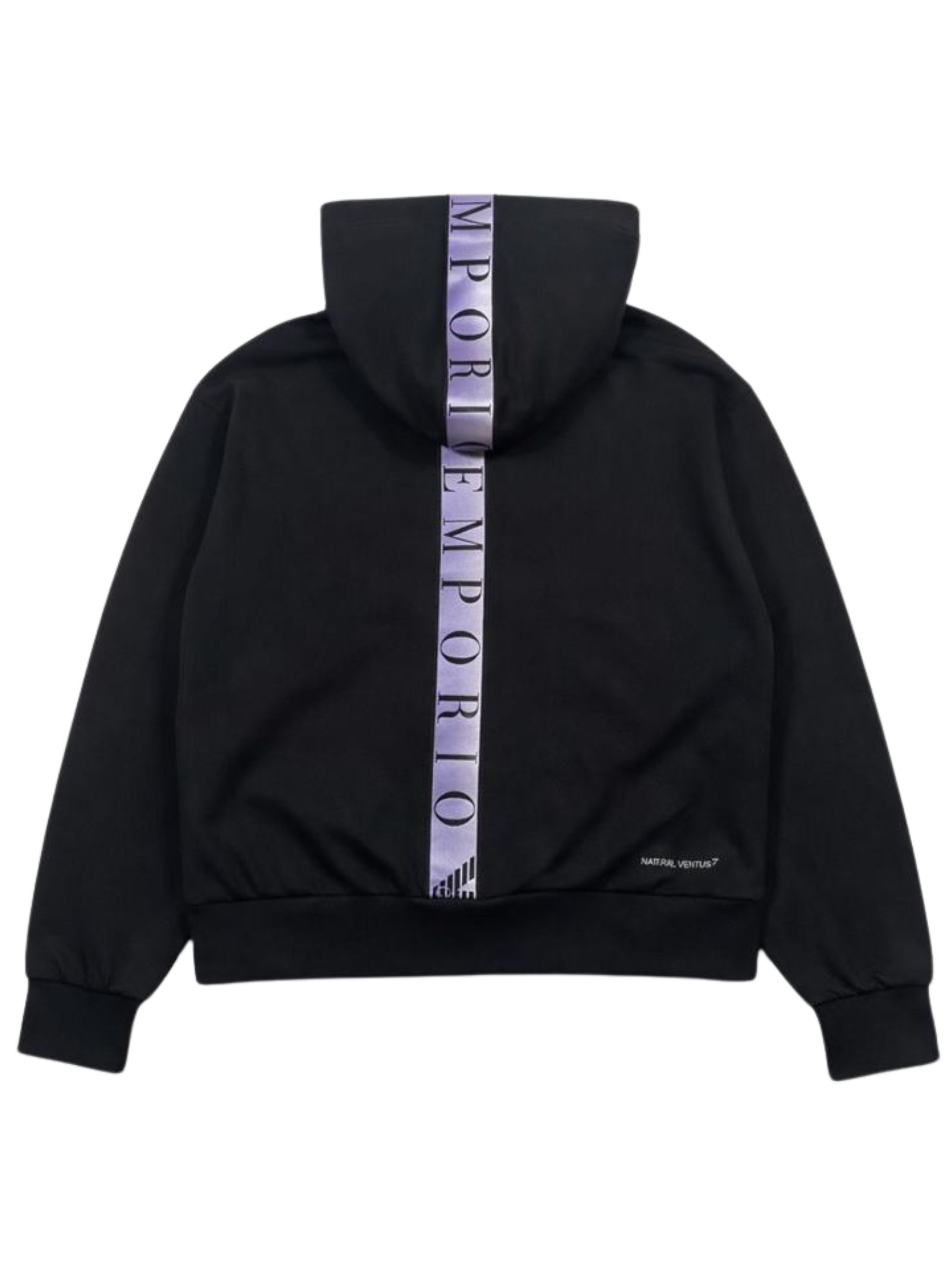Emporio Armani Junior felpa di colore nero, modello con cappuccio, maniche lunghe, banda con logo a contrasto sul retro, stampa logo sul petto, vestibilità regolare. Composizione: 50% poliestere 24% cotone 23% modal 3% elastan