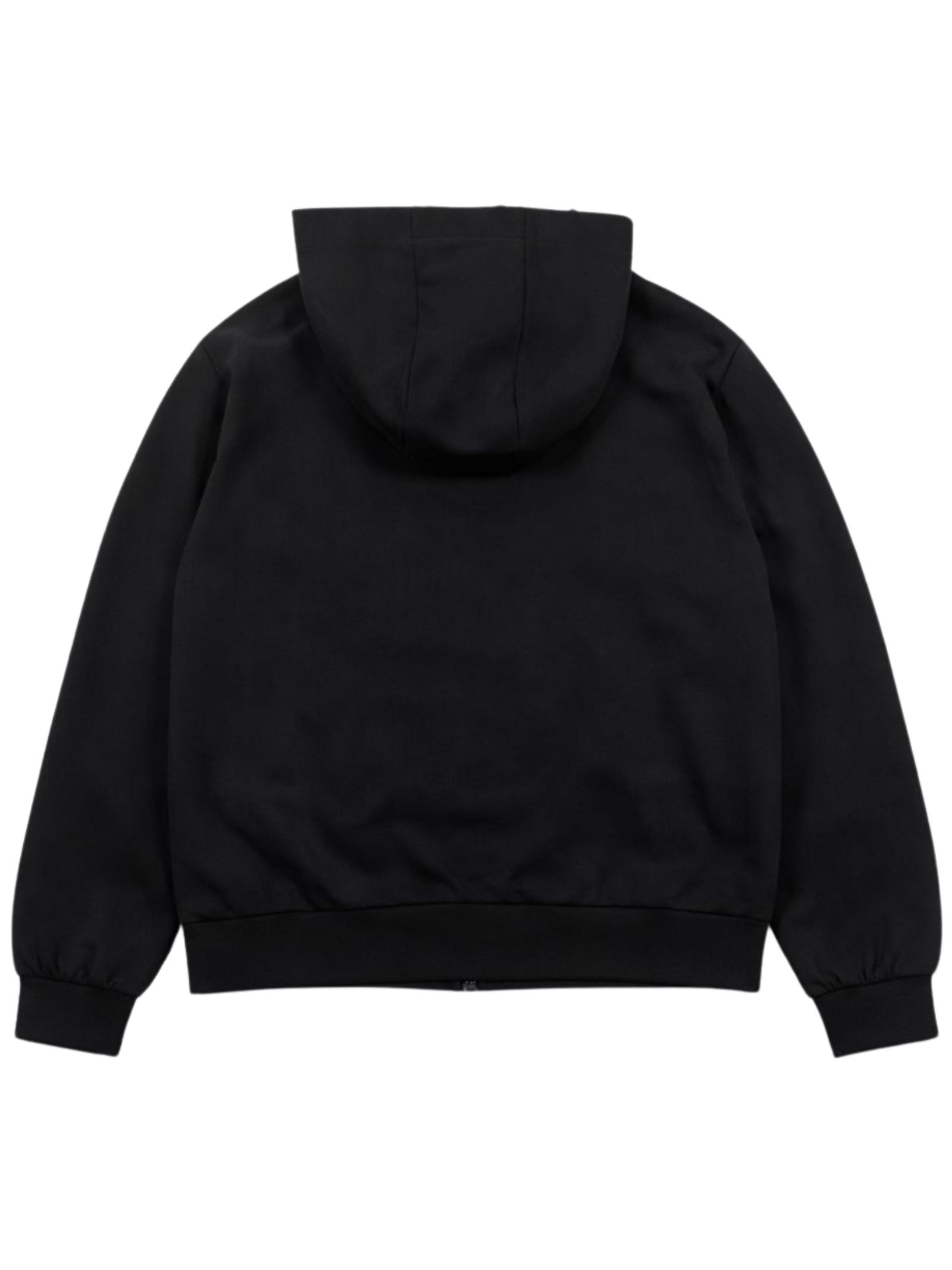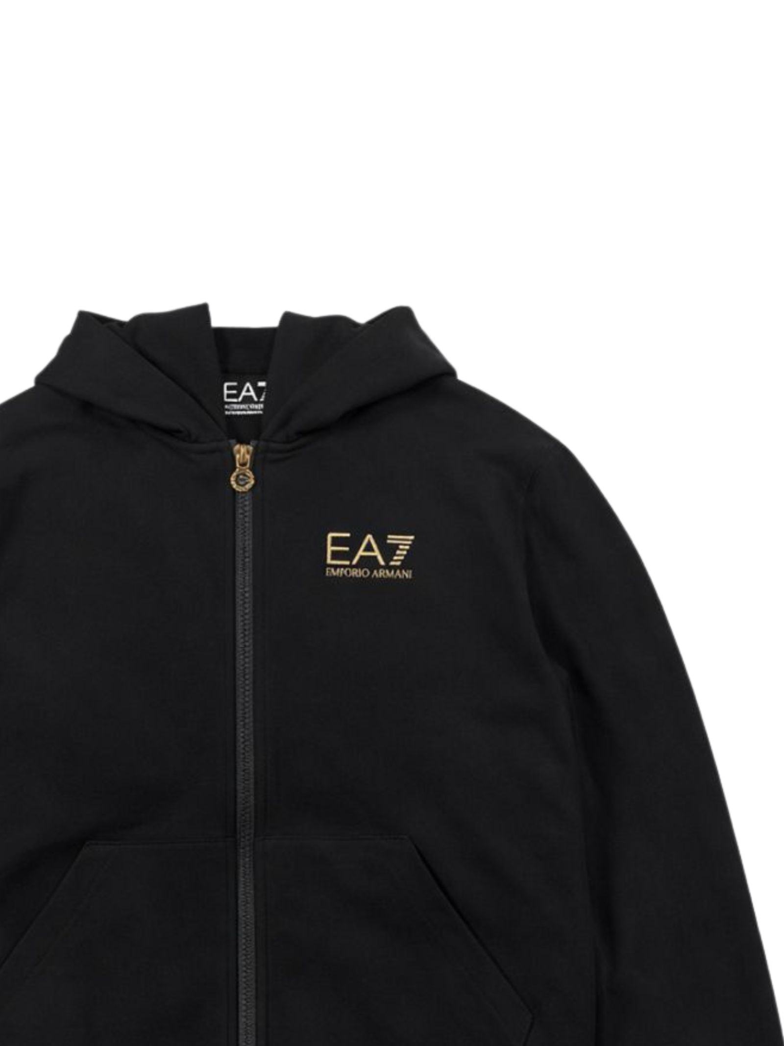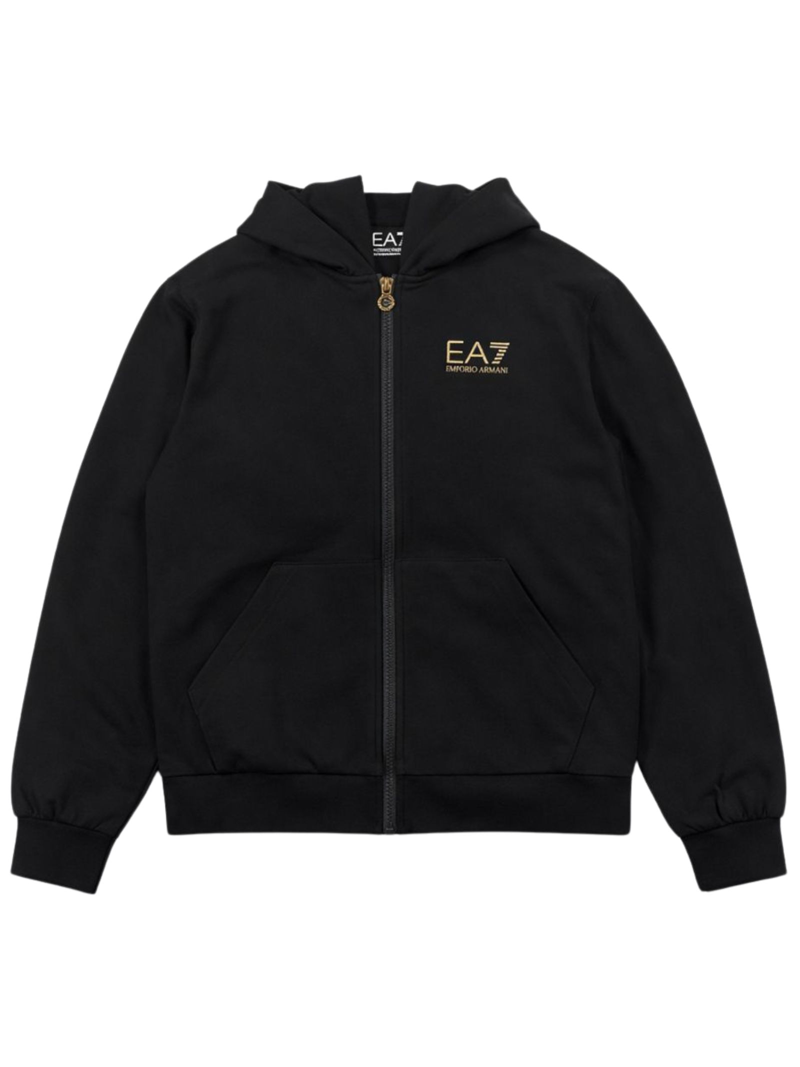 Emporio Armani Junior felpa di colore nero, modello con cappuccio, maniche lunghe, stampa logo a contrasto oro laminato, due tasche, vestibilità regolare. Composizione: 95% cotone 5% elastan