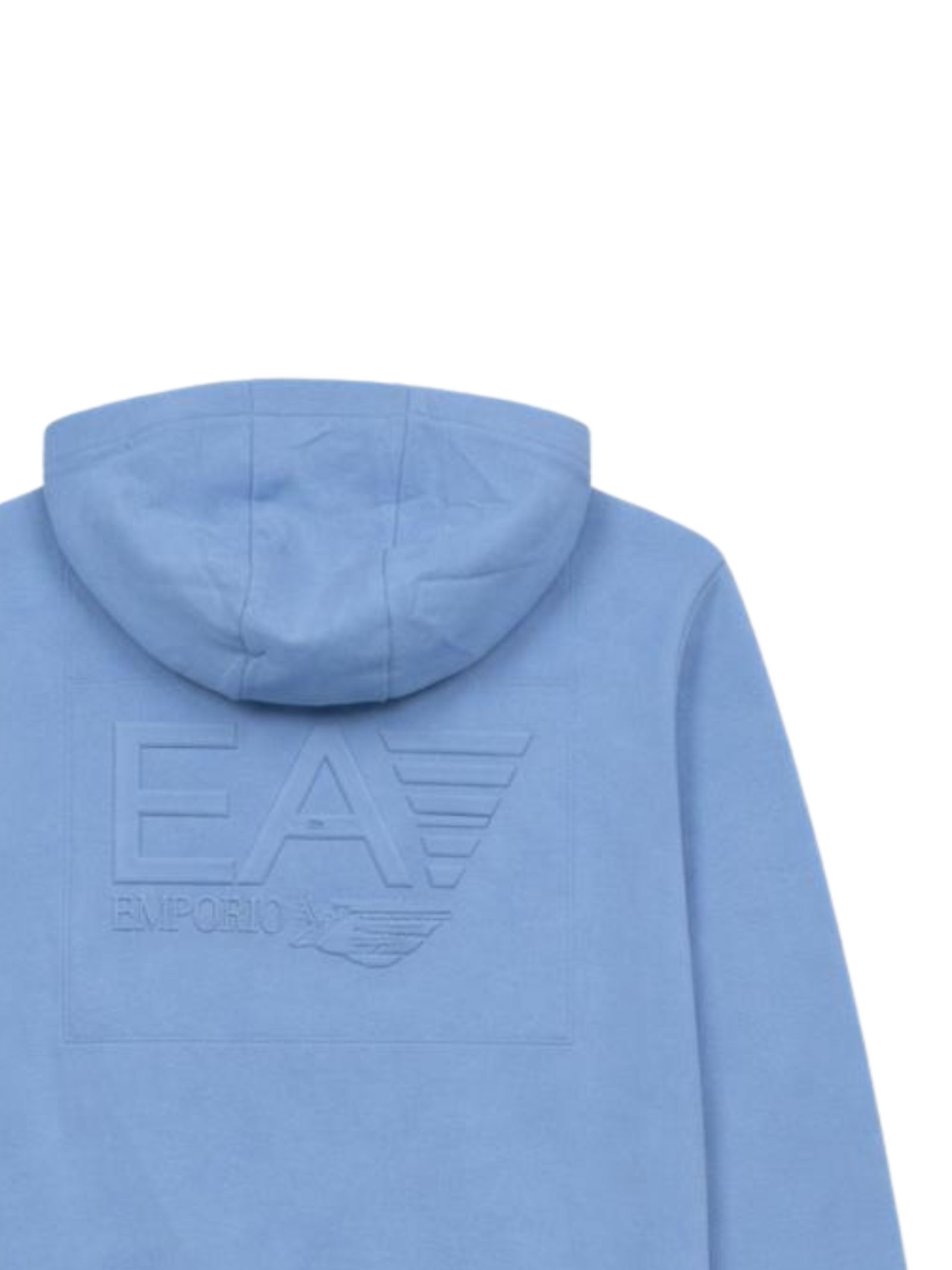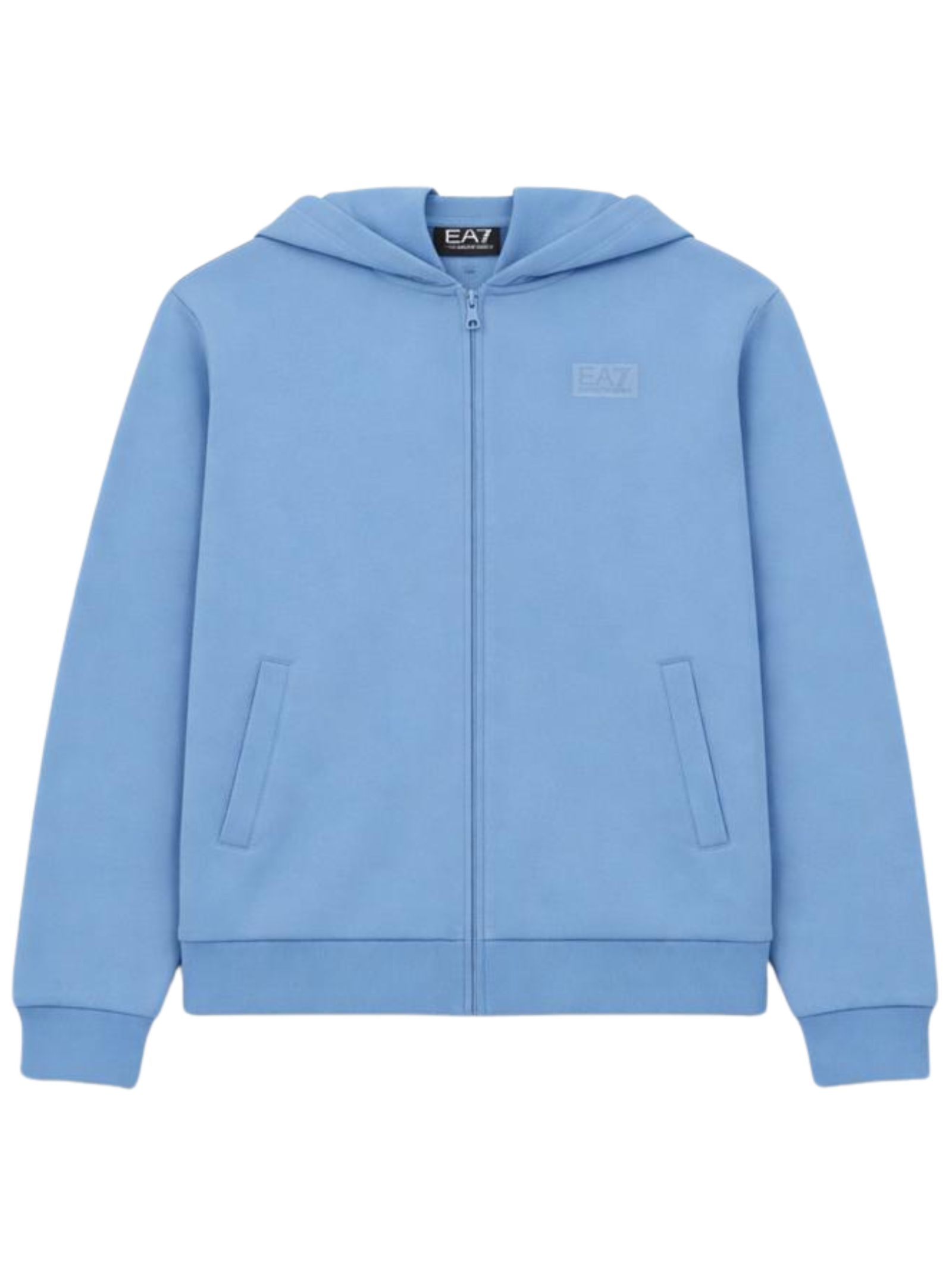 Emporio Armani Junior felpa di colore azzurro, modello con cappuccio, zip centrale, maniche lunghe, logo su entrambi i lati, due tasche laterali, vestibilità regolare. Composizione: 100% cotone