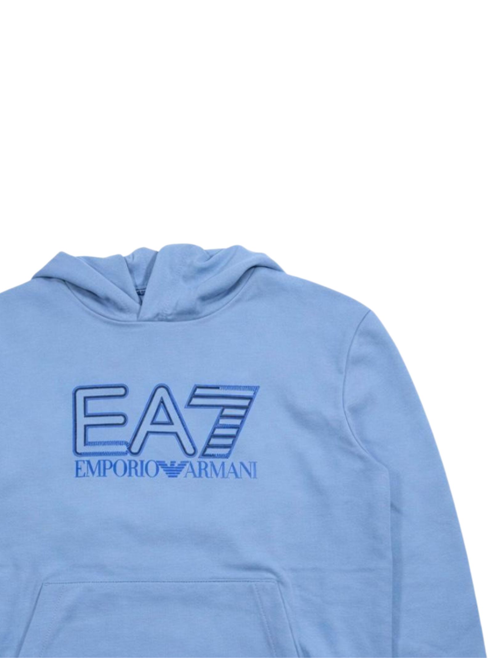 Emporio Armani Junior felpa di colore azzurro, modello con cappuccio, maniche lunghe, logo a contrasto, due tasche laterali, vestibilità regolare. Composizione: 100% cotone
