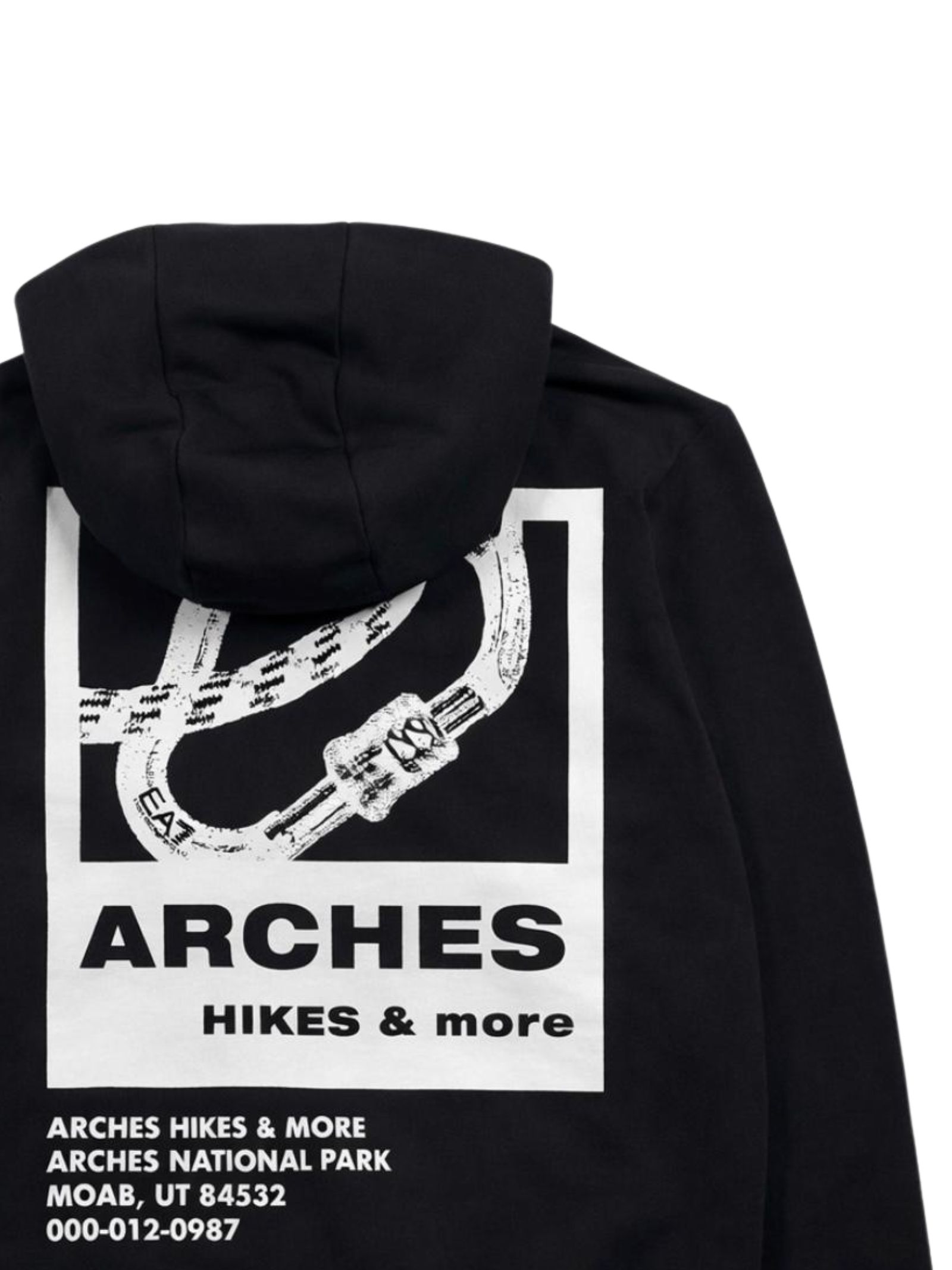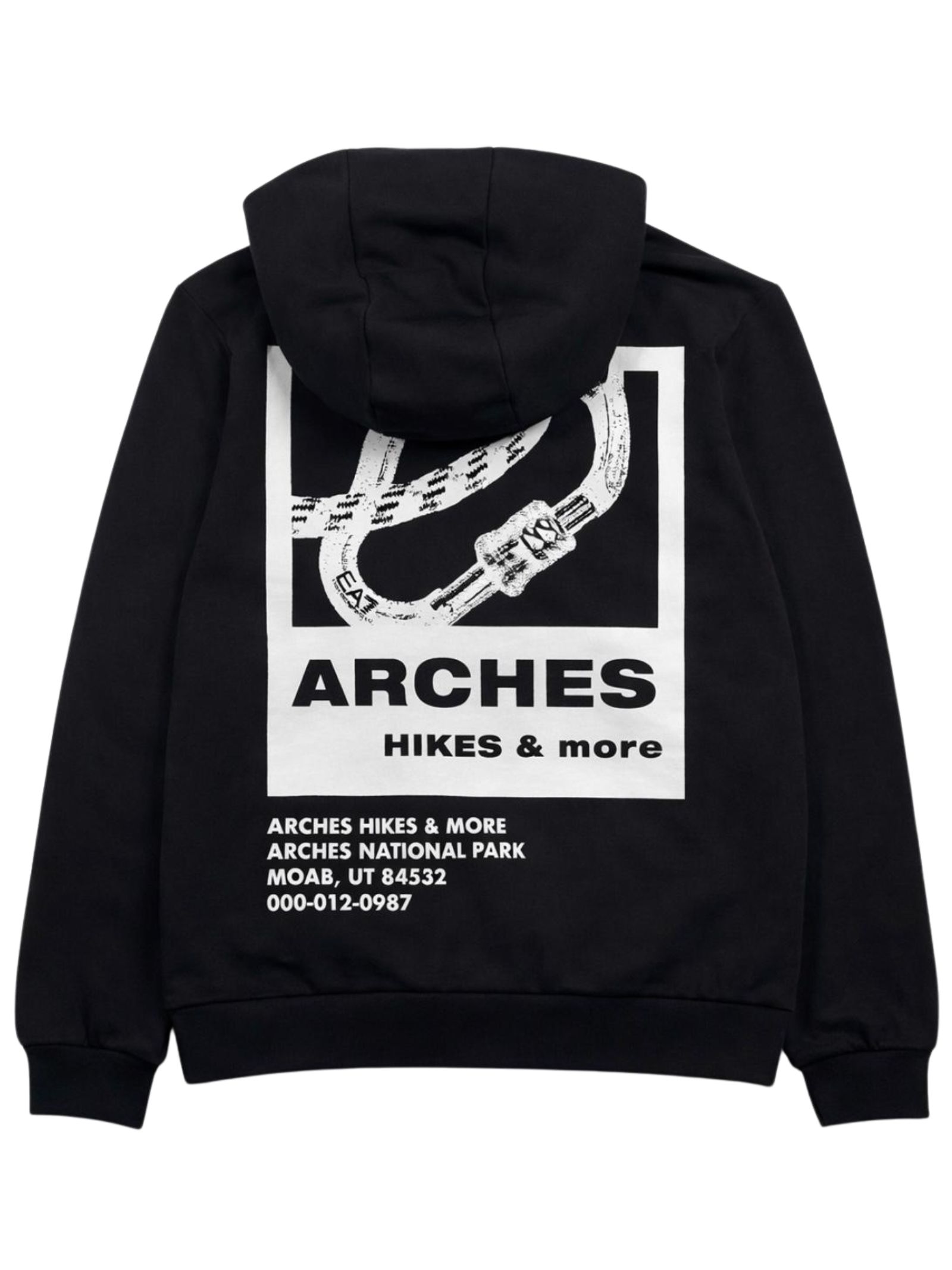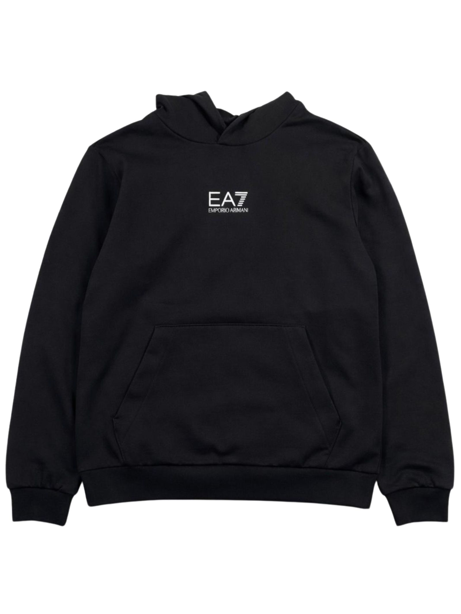 Emporio Armani Junior felpa di colore nero, modello con cappuccio, maniche lunghe, due tasche laterali, logo a contrasto bianco, stampa sul retro, vestibilità regolare. Composizione: 100% Cotone