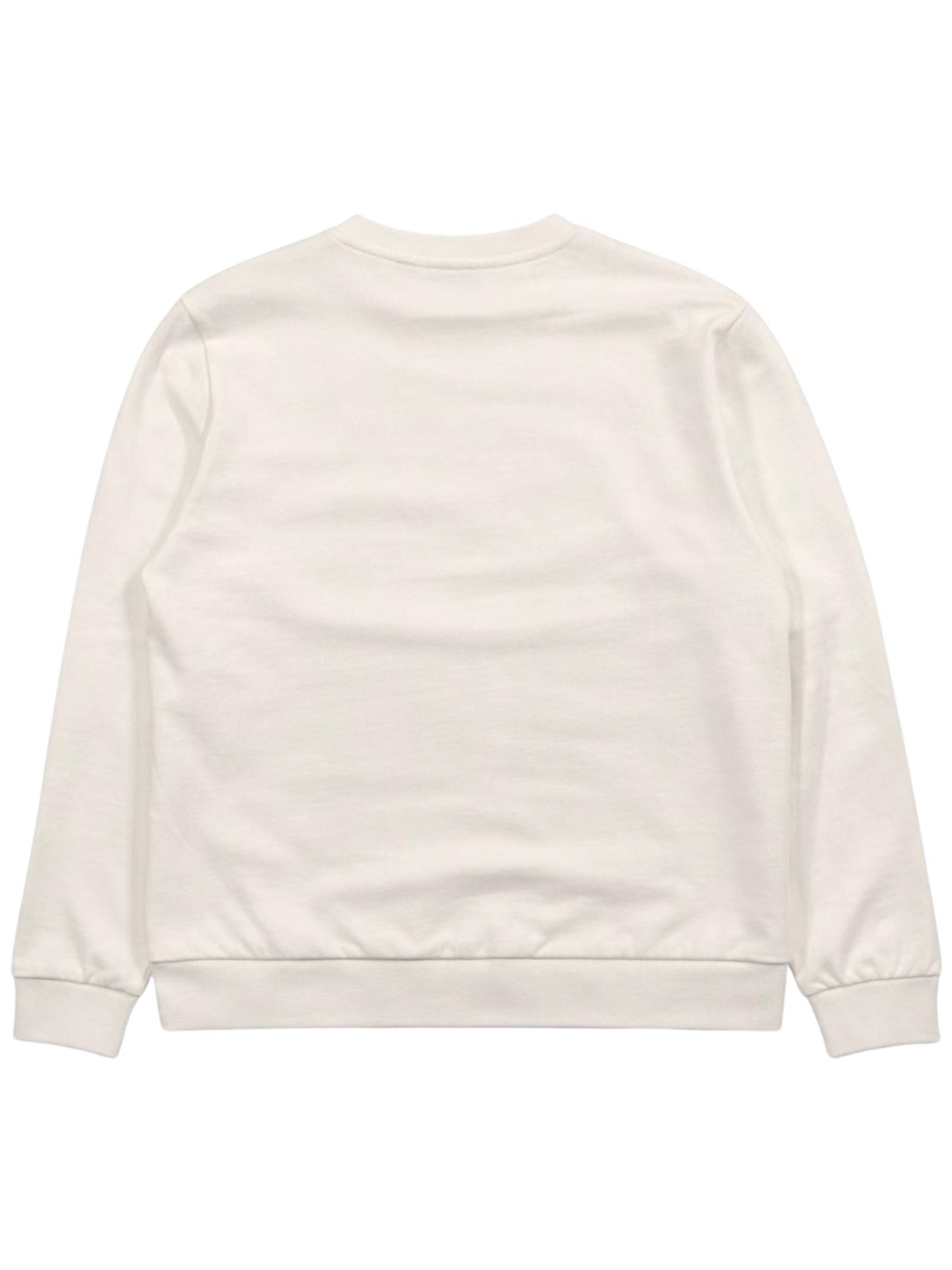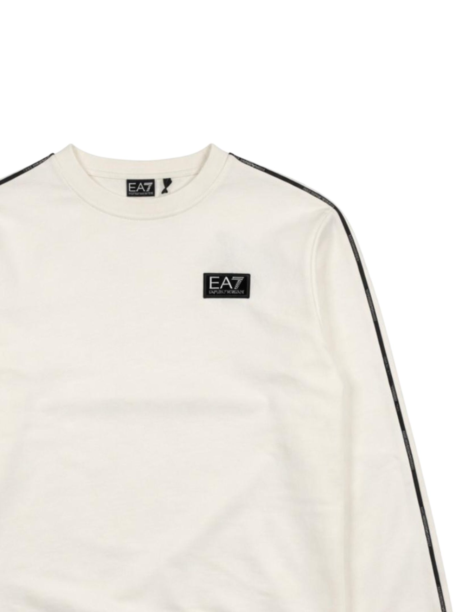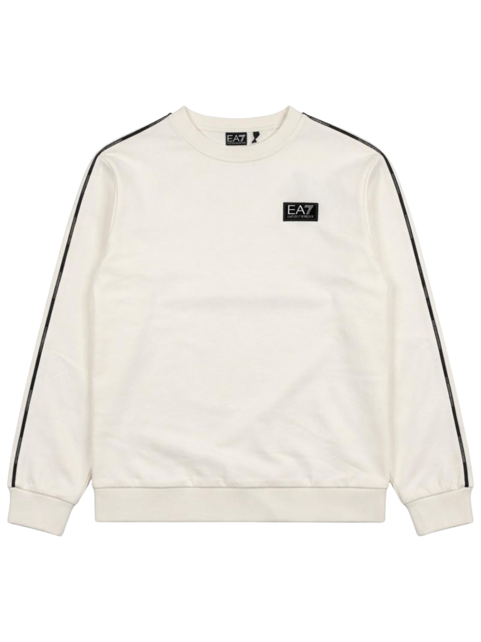 Emporio Armani Junior felpa di colore panna, modello girocollo, maniche lunghe, banda sottile con logo a contrasto lungo le maniche, logo gommato sul petto, vestibilità regolare. Composizione: 88% cotone 12% poliestere