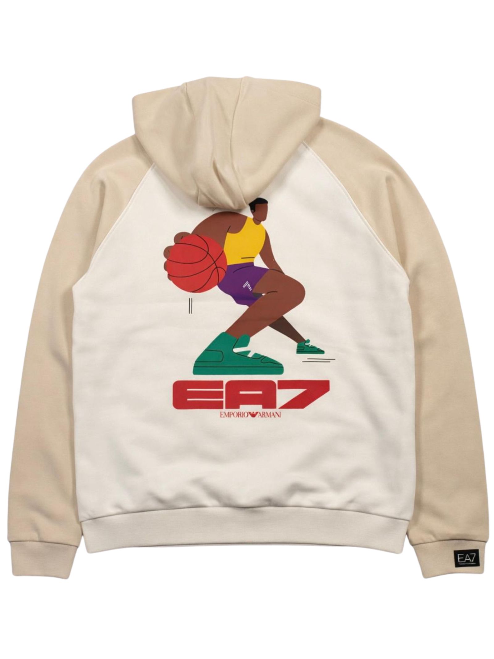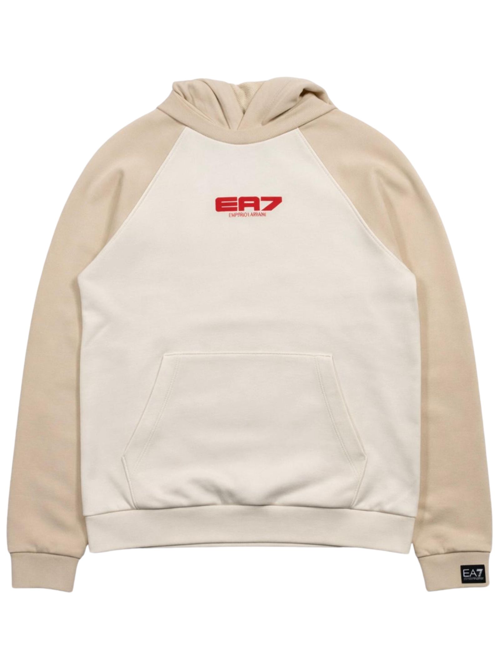 Emporio Armani Junior felpa di colore panna, dettagli a contrasto beige, modello con cappuccio, maniche lunghe, due tasche a marsupio, logo a contrasto rosso, maxi stampa sul retro a contrasto multicolor, vestibilità regolare. Composizione: 100% Cotone