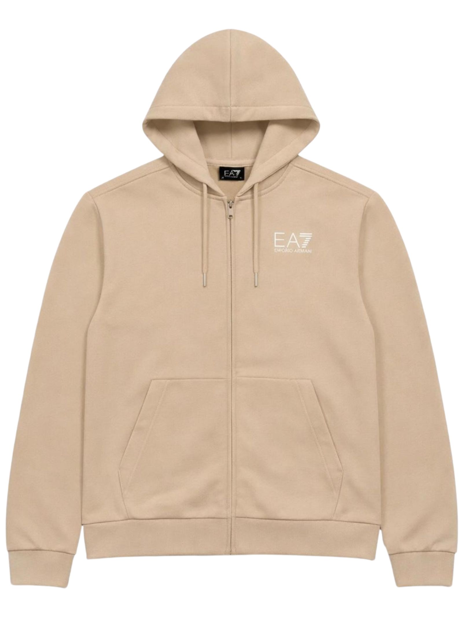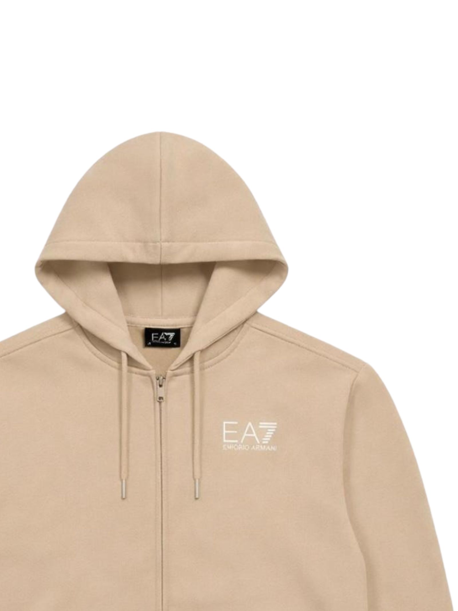 Emporio Armani Junior felpa di colore sabbia, modello con cappuccio, maniche lunghe, zip centrale, due tasche a marsupio, logo a contrasto bianco, vestibilità regolare. Composizione: 100% Cotone