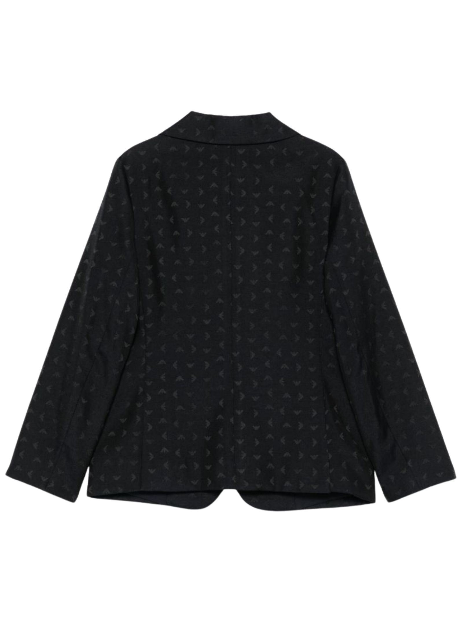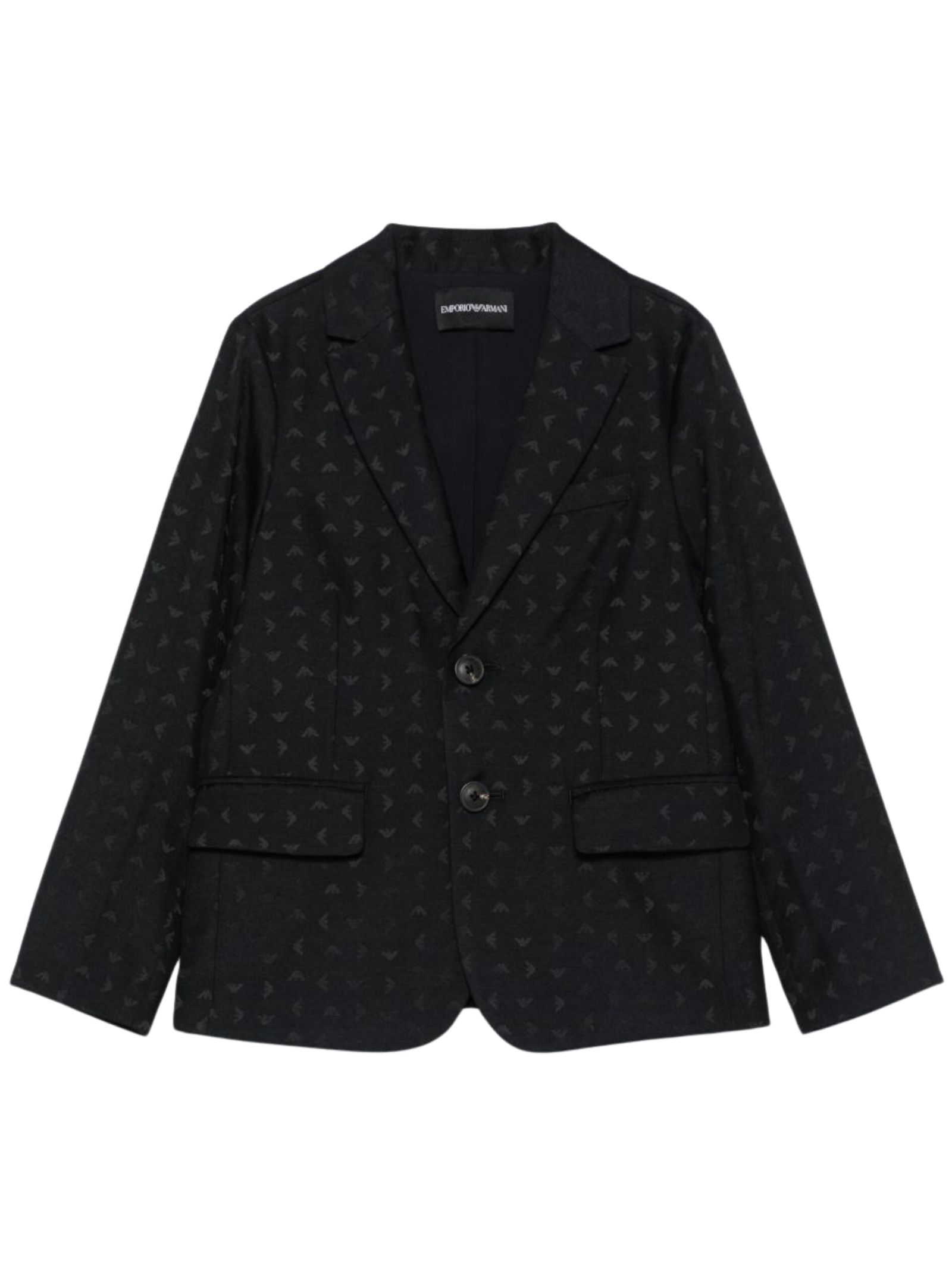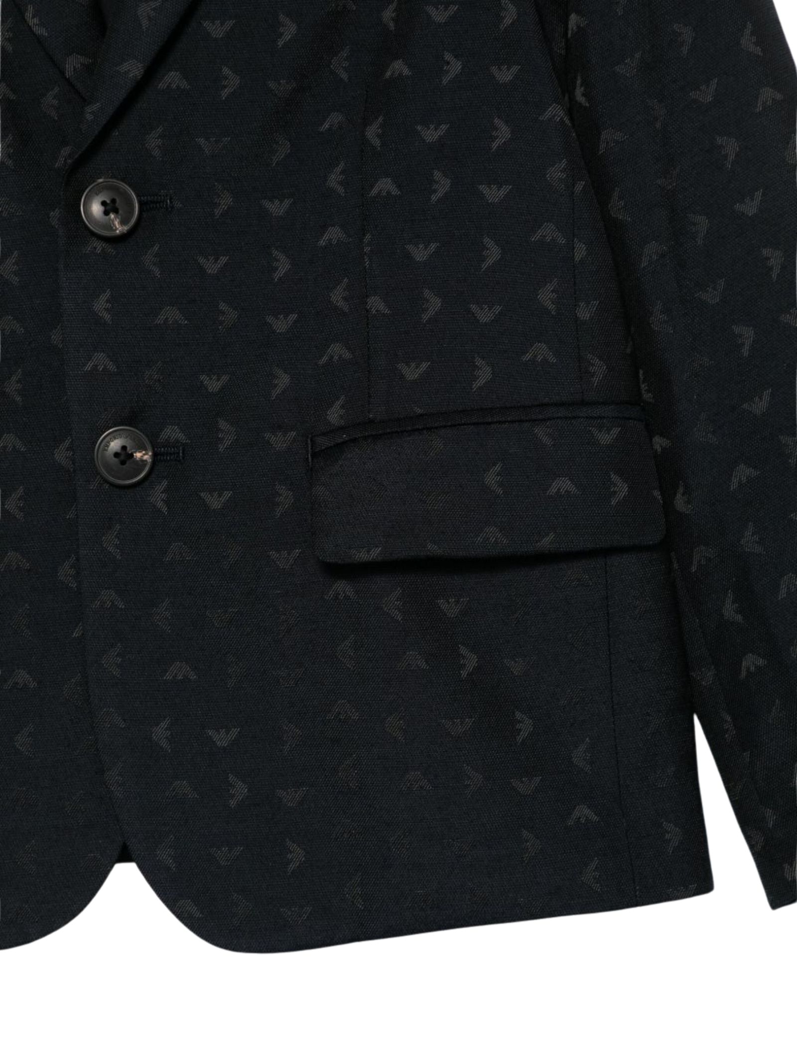 Emporio Armani Junior giacca di colore blu notte, caratterizzata da logo a contrasto all-over, chiusura frontale con bottoni, tasca a filetto sul petto, due tasche laterali con patta, maniche lunghe, vestibilità regolare. Composizione: 45% poliestere 32% acrilica 19% viscosa 4% lana. Fodera: 100% poliestere
