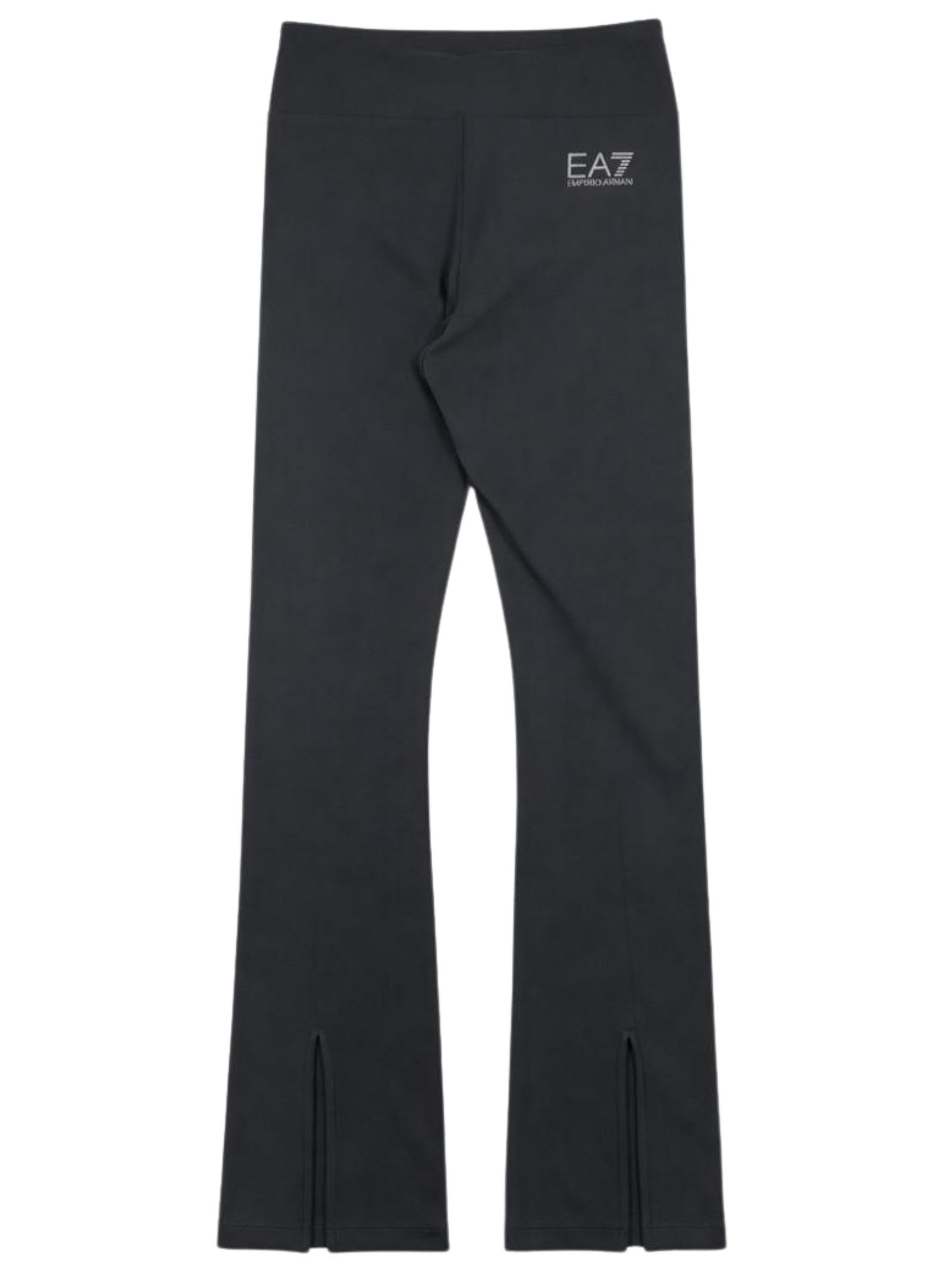 Emporio Armani Junior leggins di colore grigio, realizzato in morbido cotone elastico, logo a contrasto argento laminato, modello con elastico in vita, leggermente a zampa con spacchi, design aderente. Composizione: 92% cotone 8 % elastan