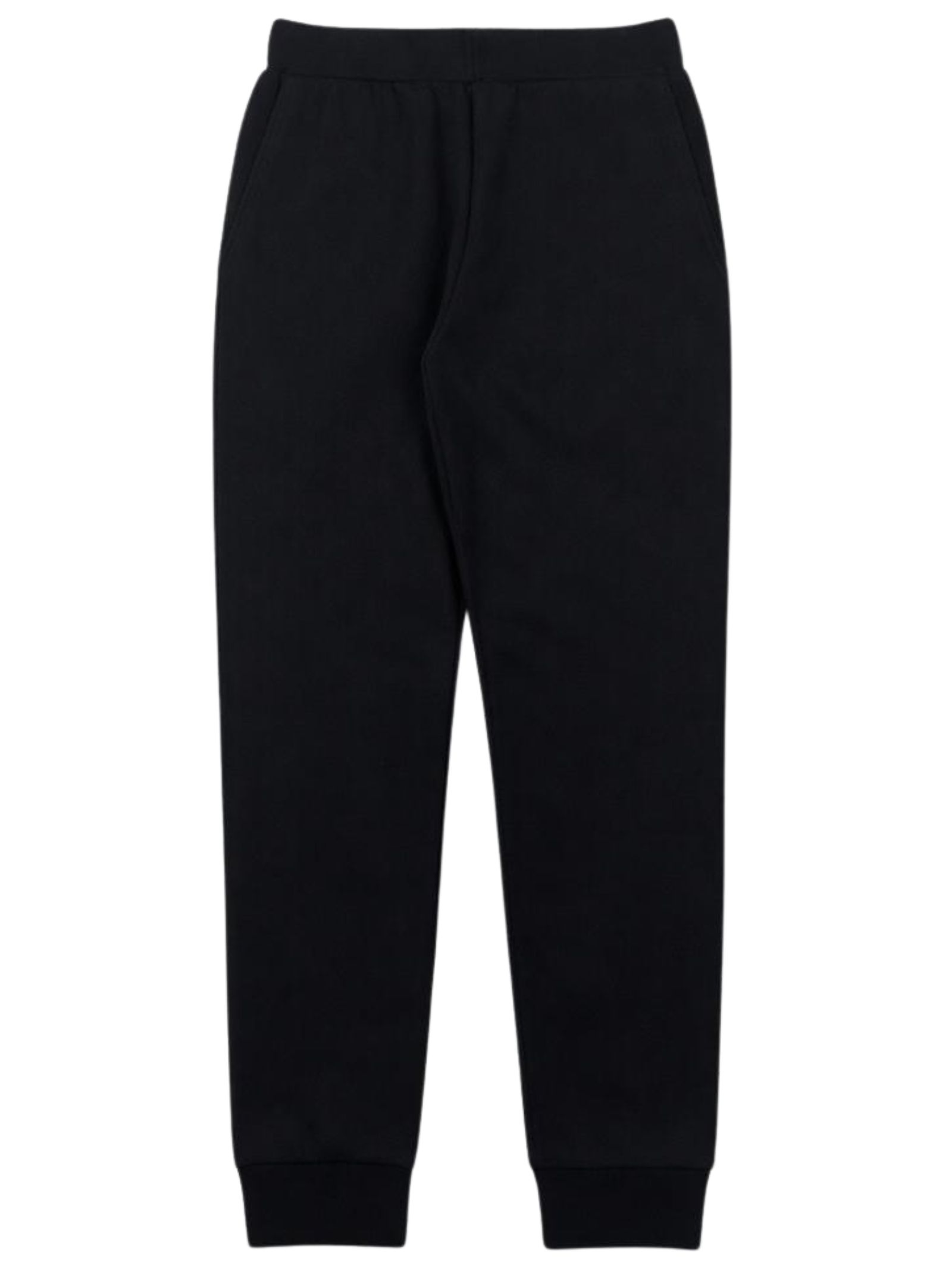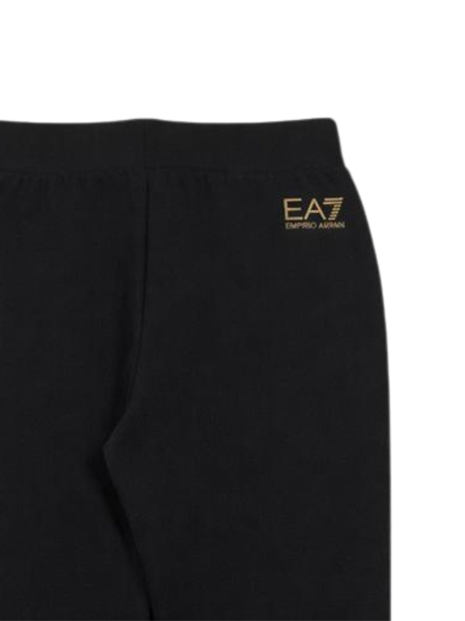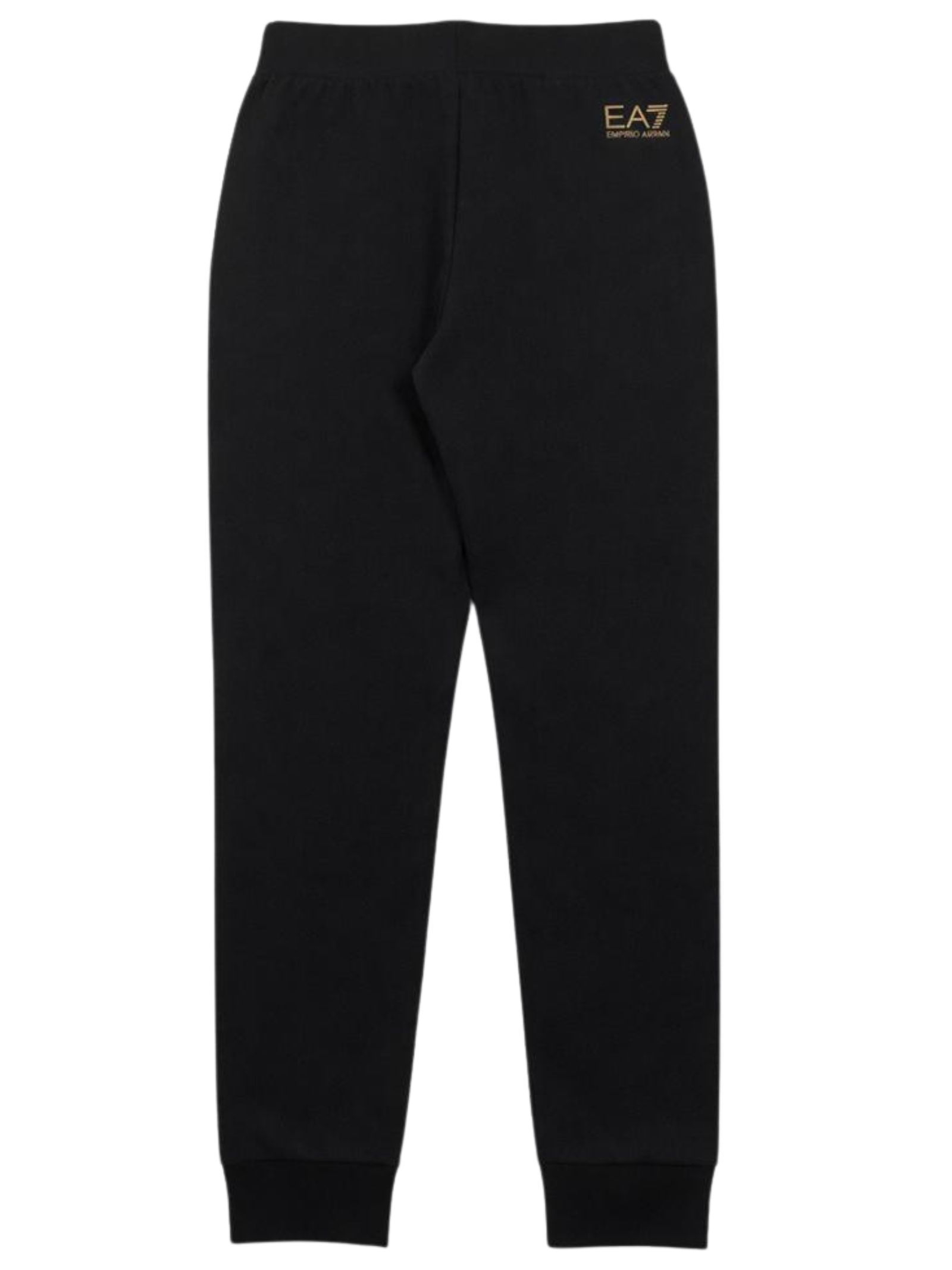 Emporio Armani Junior pantalone di colore nero, modello con elastico in vita, stampa logo a contrasto oro laminato, caviglie elastiche, vestibilità regolare. Composizione: 95% cotone 5% elastan