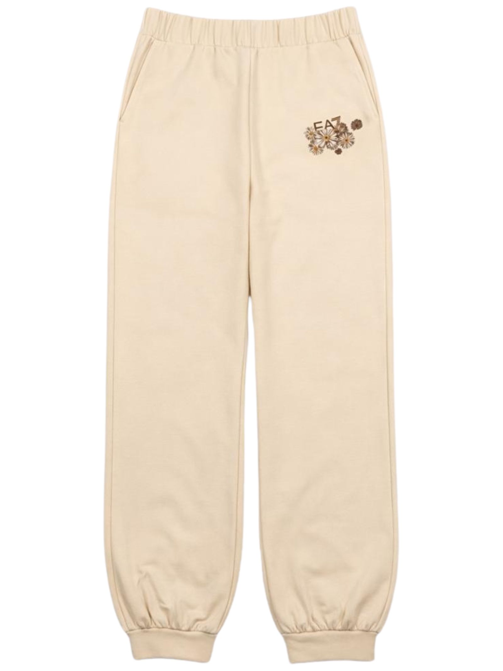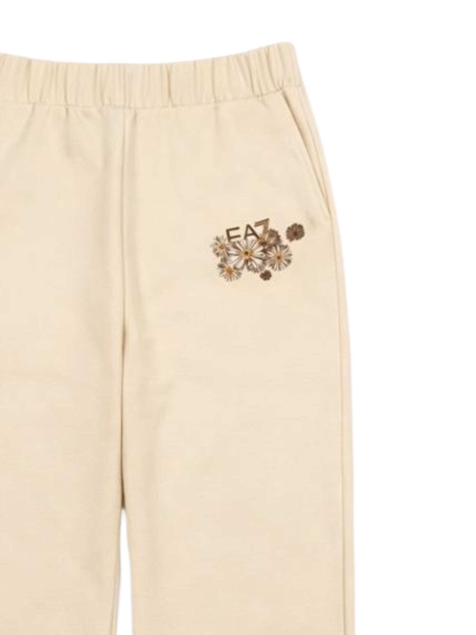 Emporio Armani Junior pantalone di colore sabbia, modello con elastico in vita e alle caviglie, stampa a contrasto con logo, due tasche laterali, vestibilità ampia. Composizione: 98% Cotone 2% Elastan