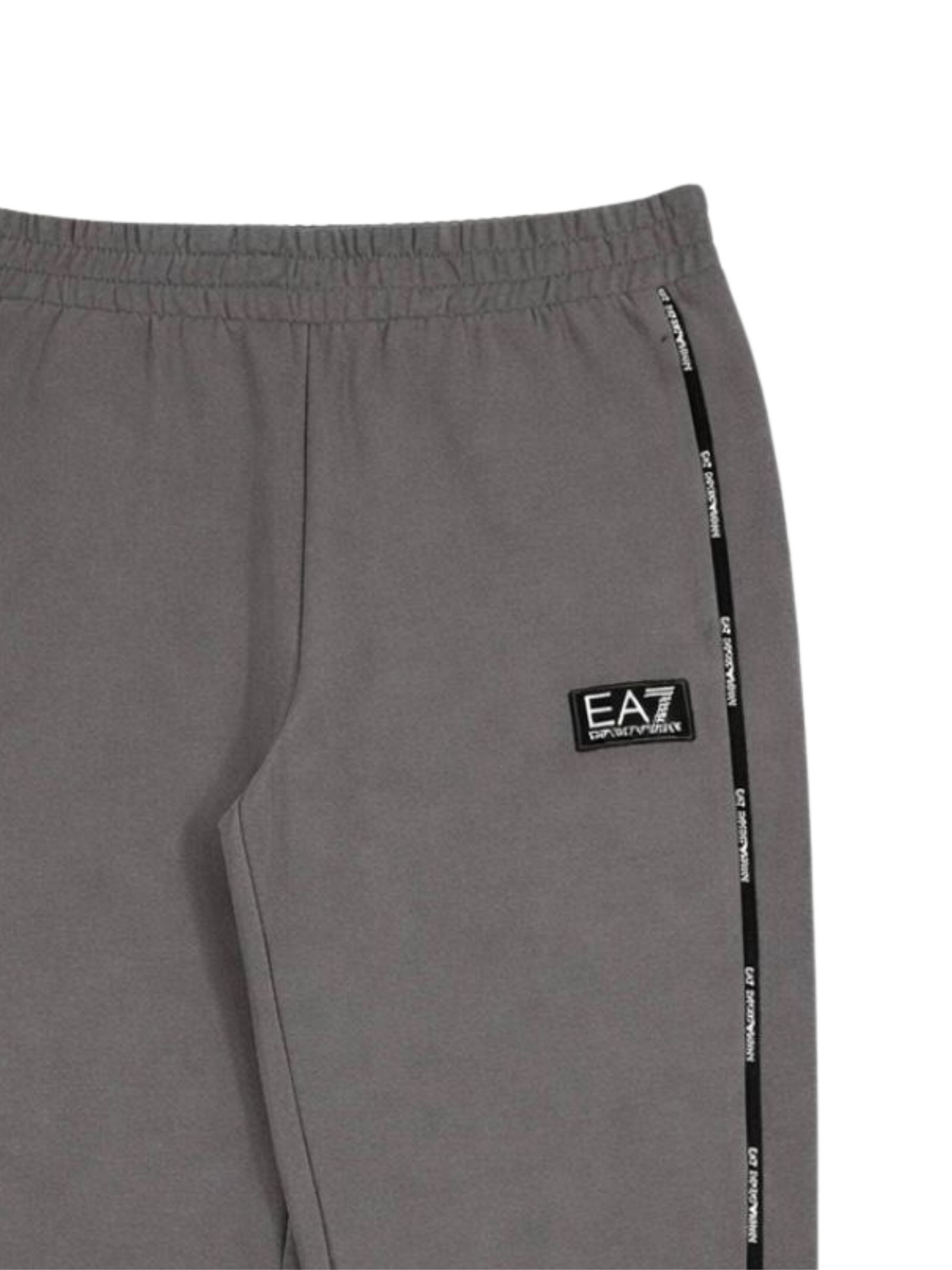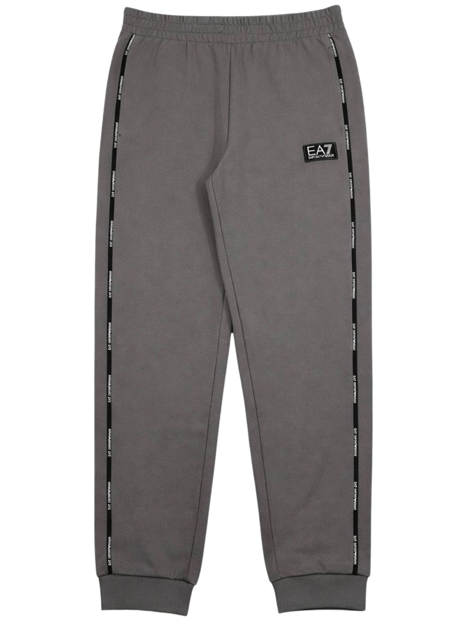 Emporio Armani Junior pantalone di colore grigio, modello con elastico in vita, due tasche laterali, banda sottile con logo a contrasto su entrambi i lati, vestibilità regolare. Composizione: 88% cotone 12% poliestere