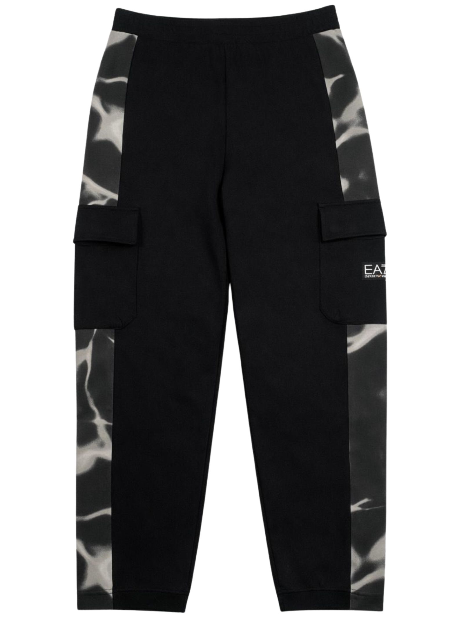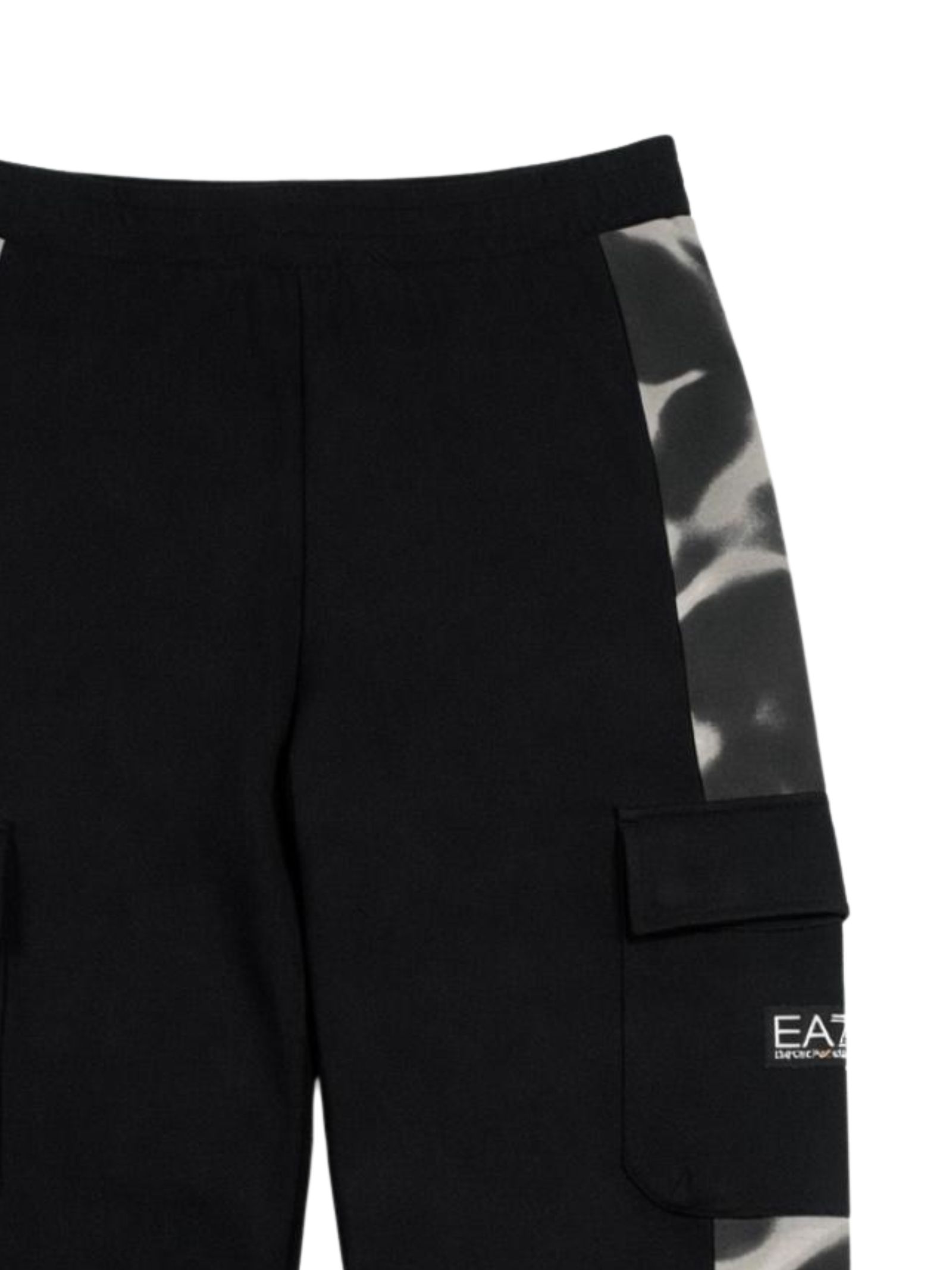 Emporio Armani Junior pantalone di colore nero, dettagli laterali a contrasto, modello con elastico in vita e coulisse interna, due tasche laterali, logo a contrasto, due tasconi cargo, vestibilità regolare. Composizione: 63% Cotone 37% poliestere