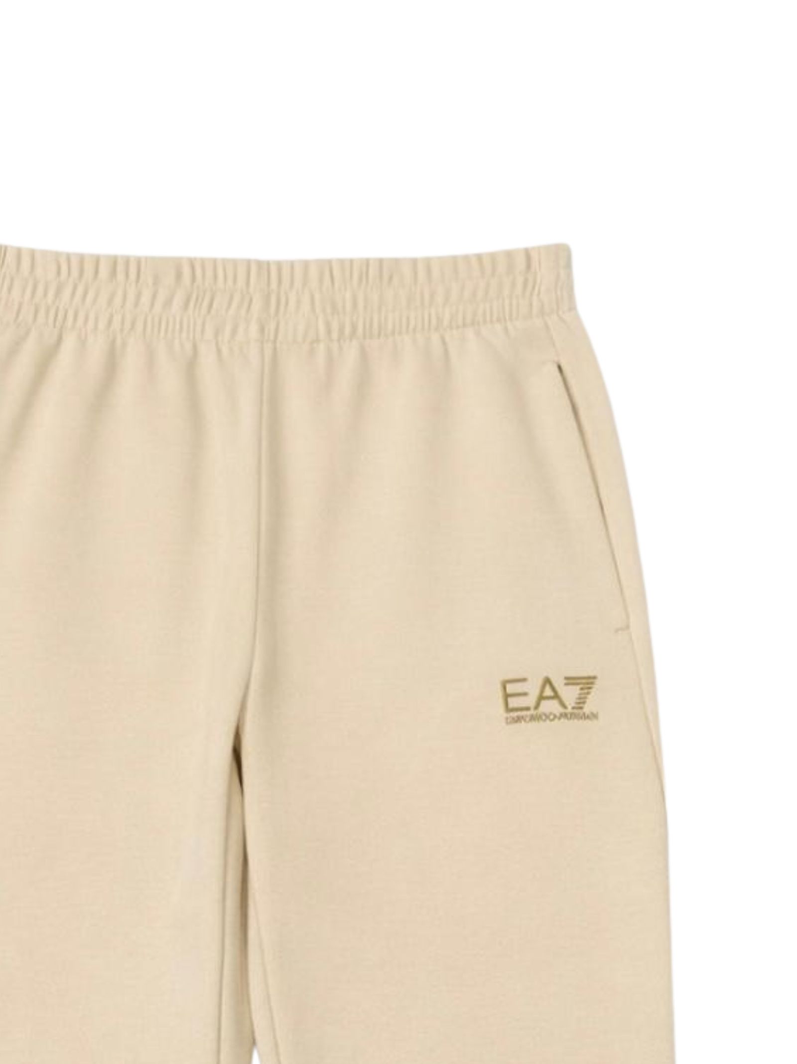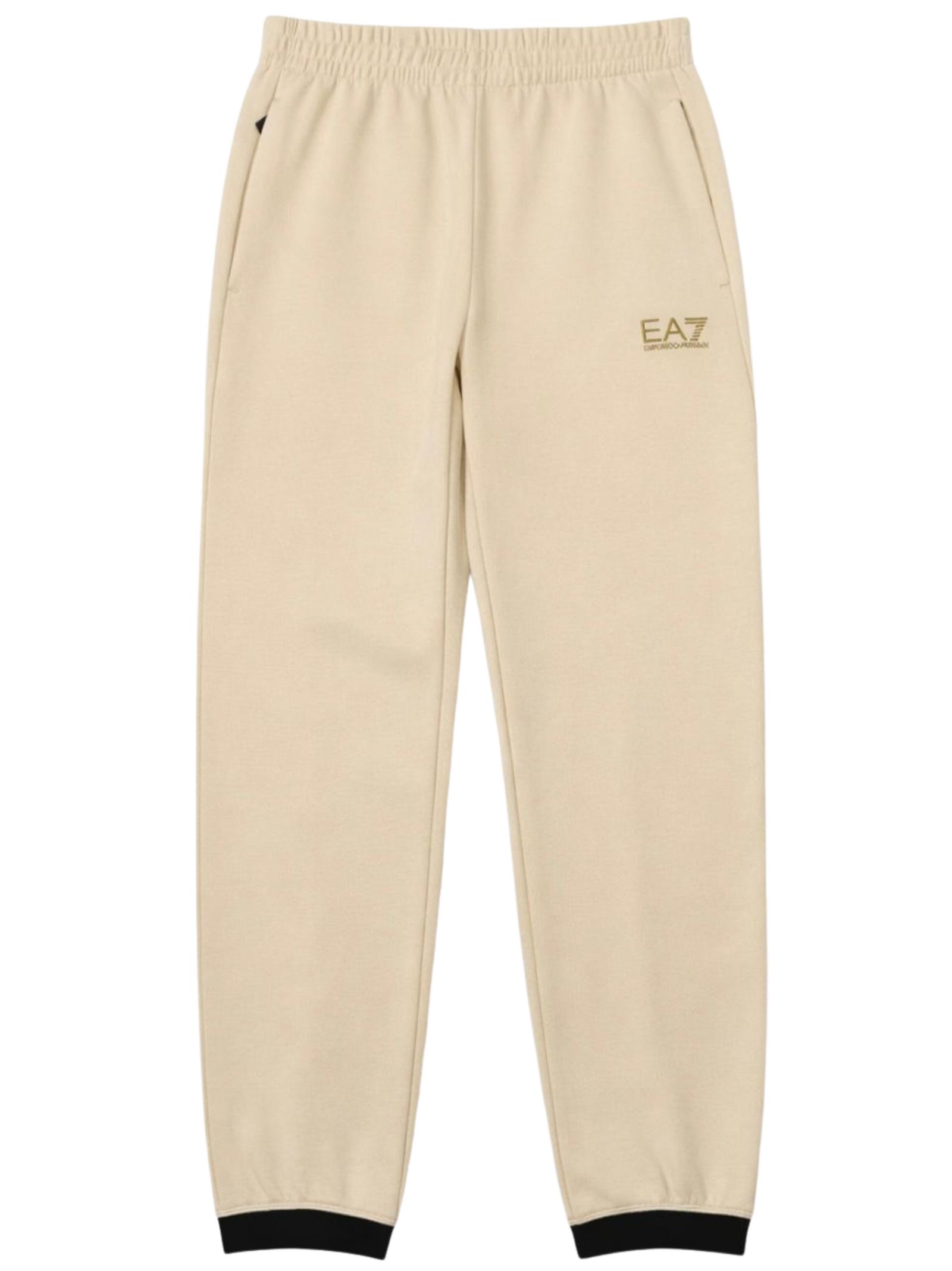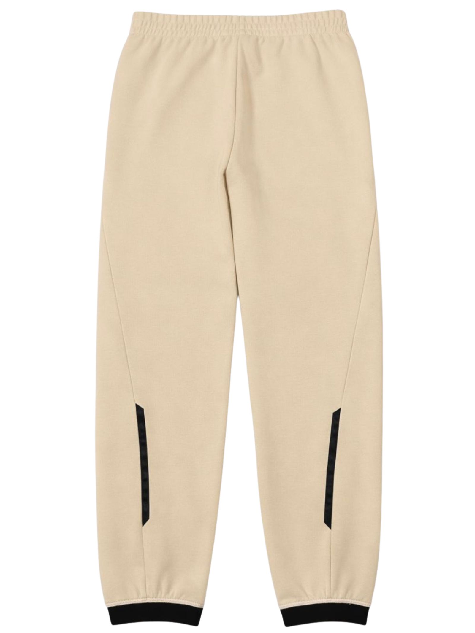 Emporio Armani Junior pantalone di colore sabbia, dettagli a contrasto nero, modello con elastico in vita e alle caviglie, due tasche laterali con zip, logo a contrasto, vestibilità regolare. Composizione: 65% Cotone 35% poliestere