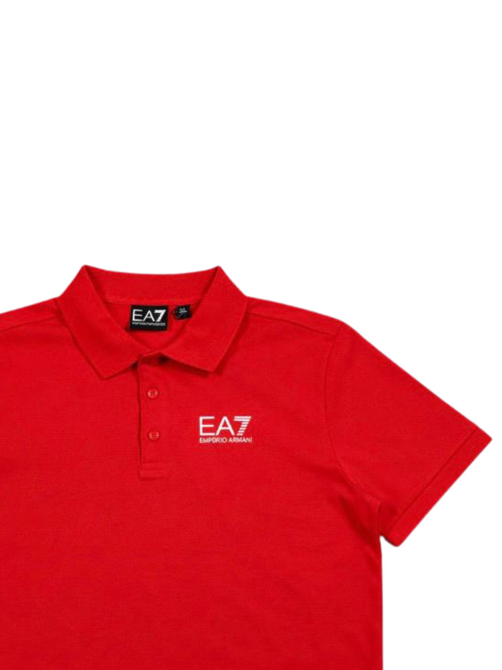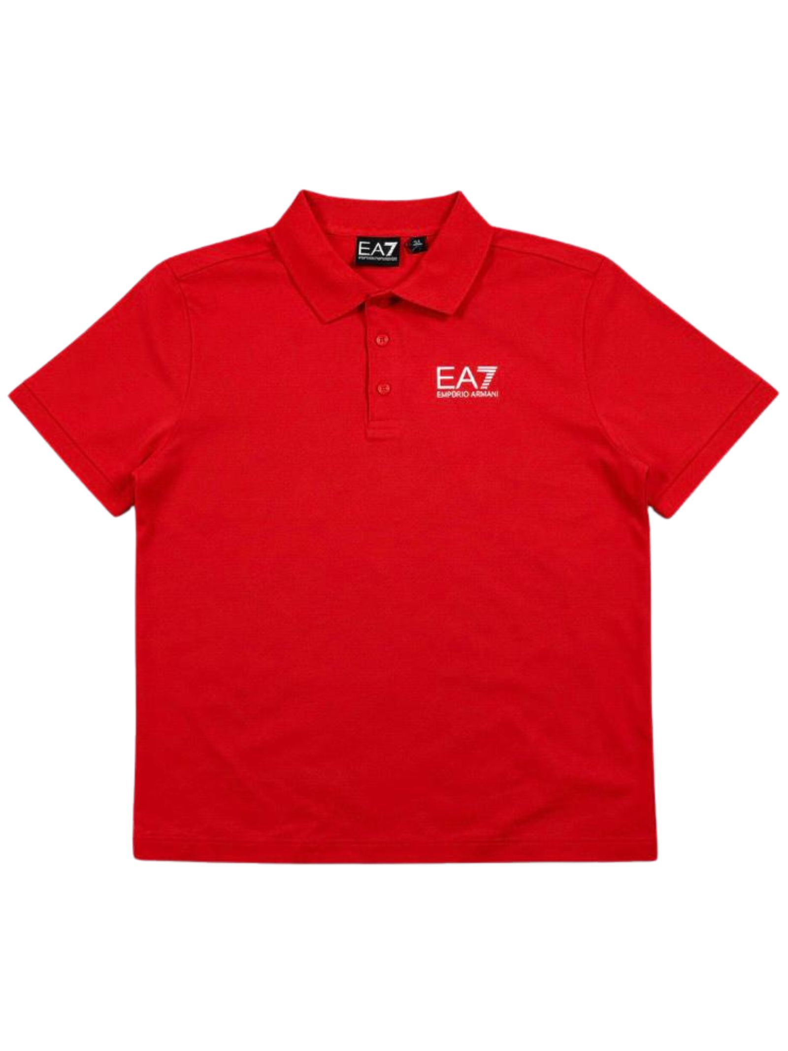 Emporio Armani Junior polo di colore rosso, modello mezza manica, logo a contrasto sul petto, vestibilità regolare. Composizione: 100% cotone