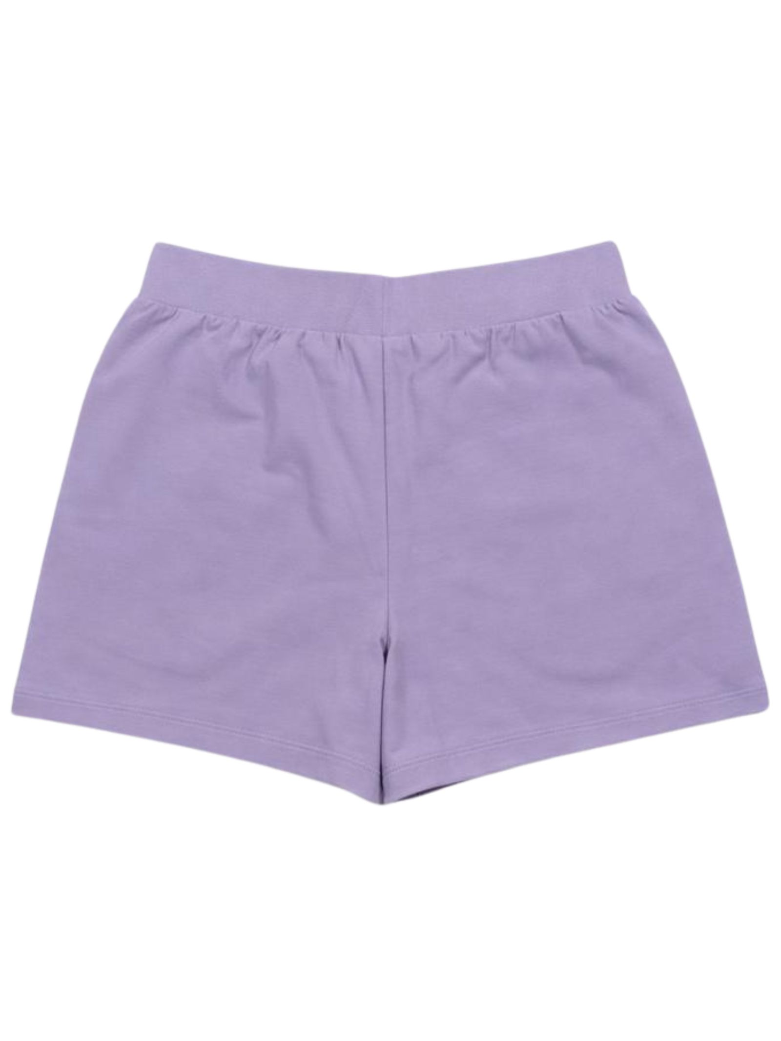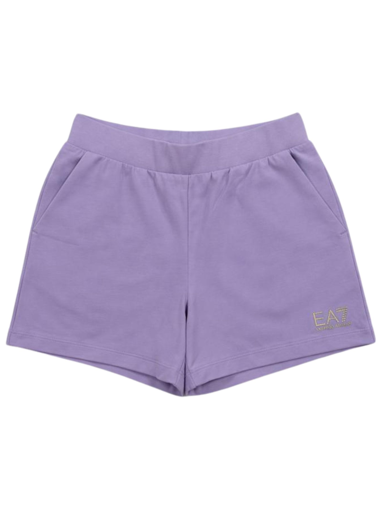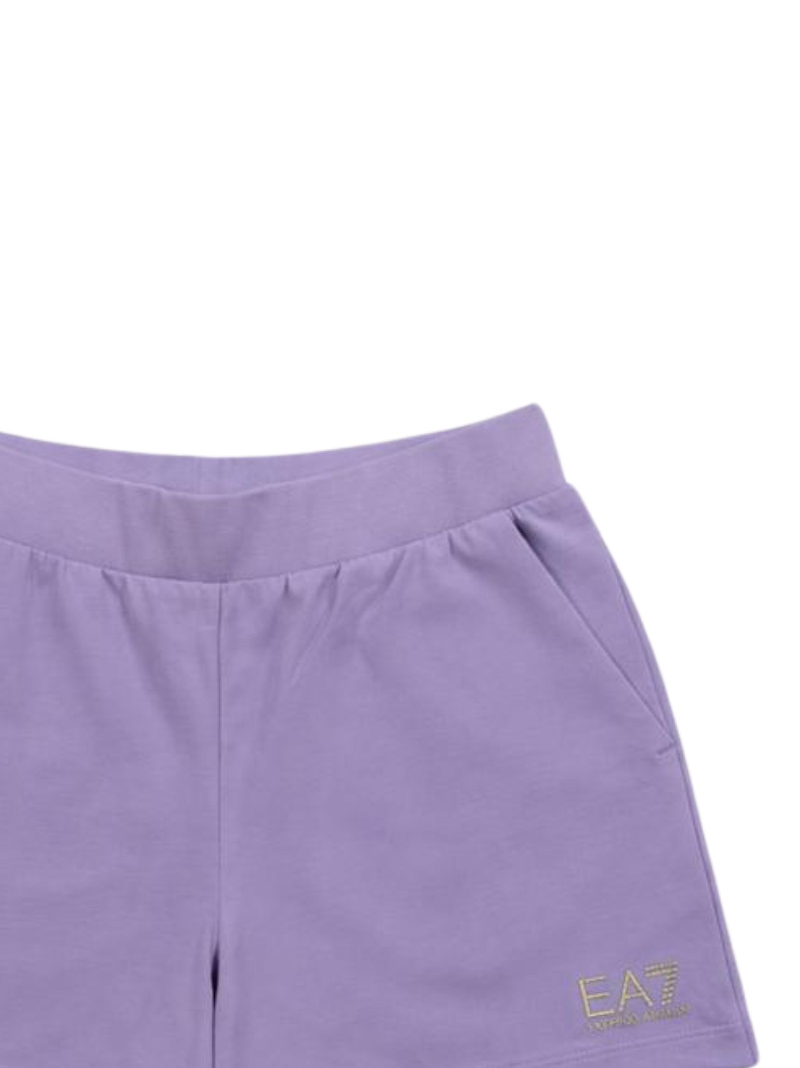 Emporio Armani Junior shorts di colore lilla, modello con elastico in vita, due tasche laterali, stampa logo a contrasto oro laminato, vestibilità regolare. Composizione: 95% cotone 5% elastan