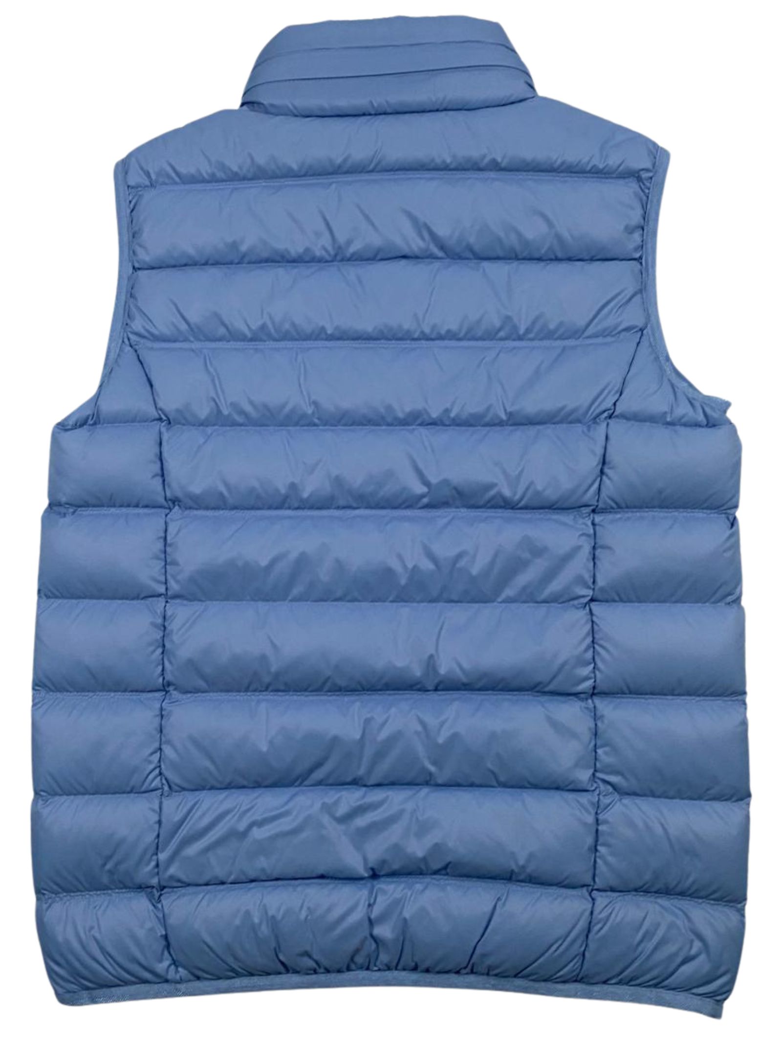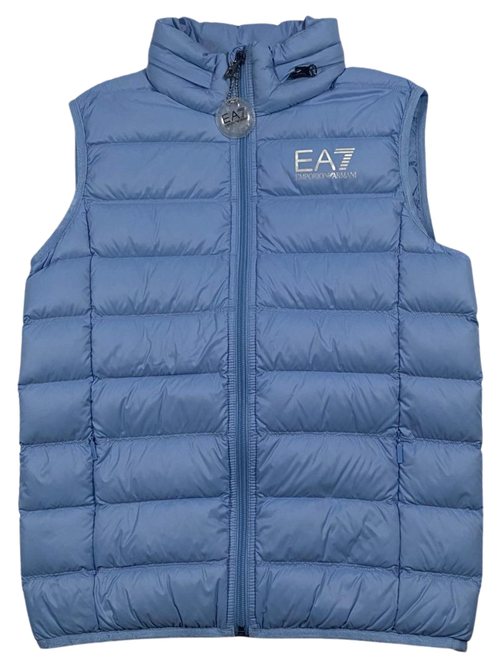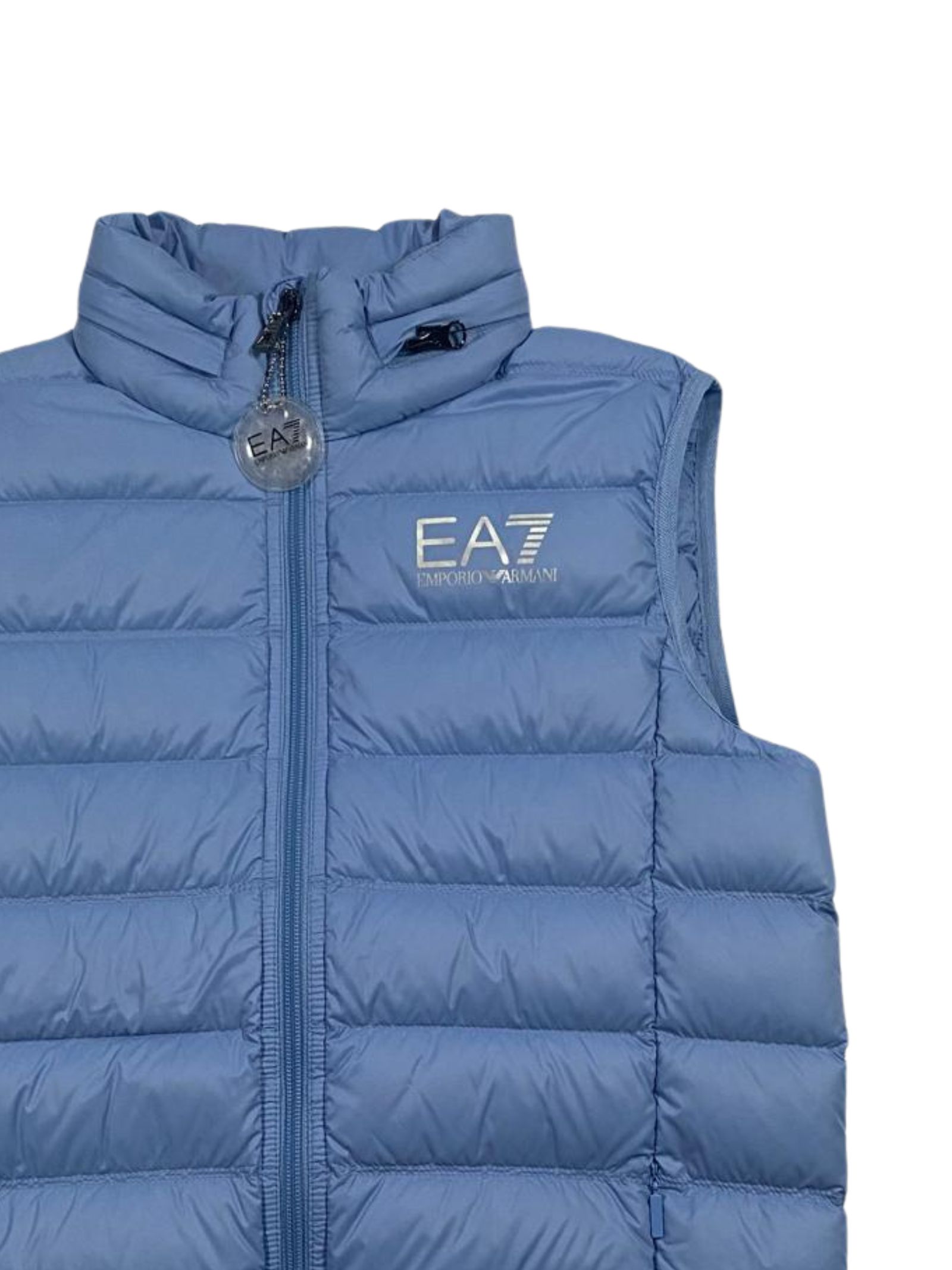 Emporio Armani Kids smanicato di colore azzurro, modello con collo alto caratterizzato da cappuccio all'interno, trapuntato, due tasche laterali con zip, stampa logo a contrasto sul petto, vestibilità regolare. Composizione: 100% poliammide. Imbottitura: 90% piumino 10% piuma