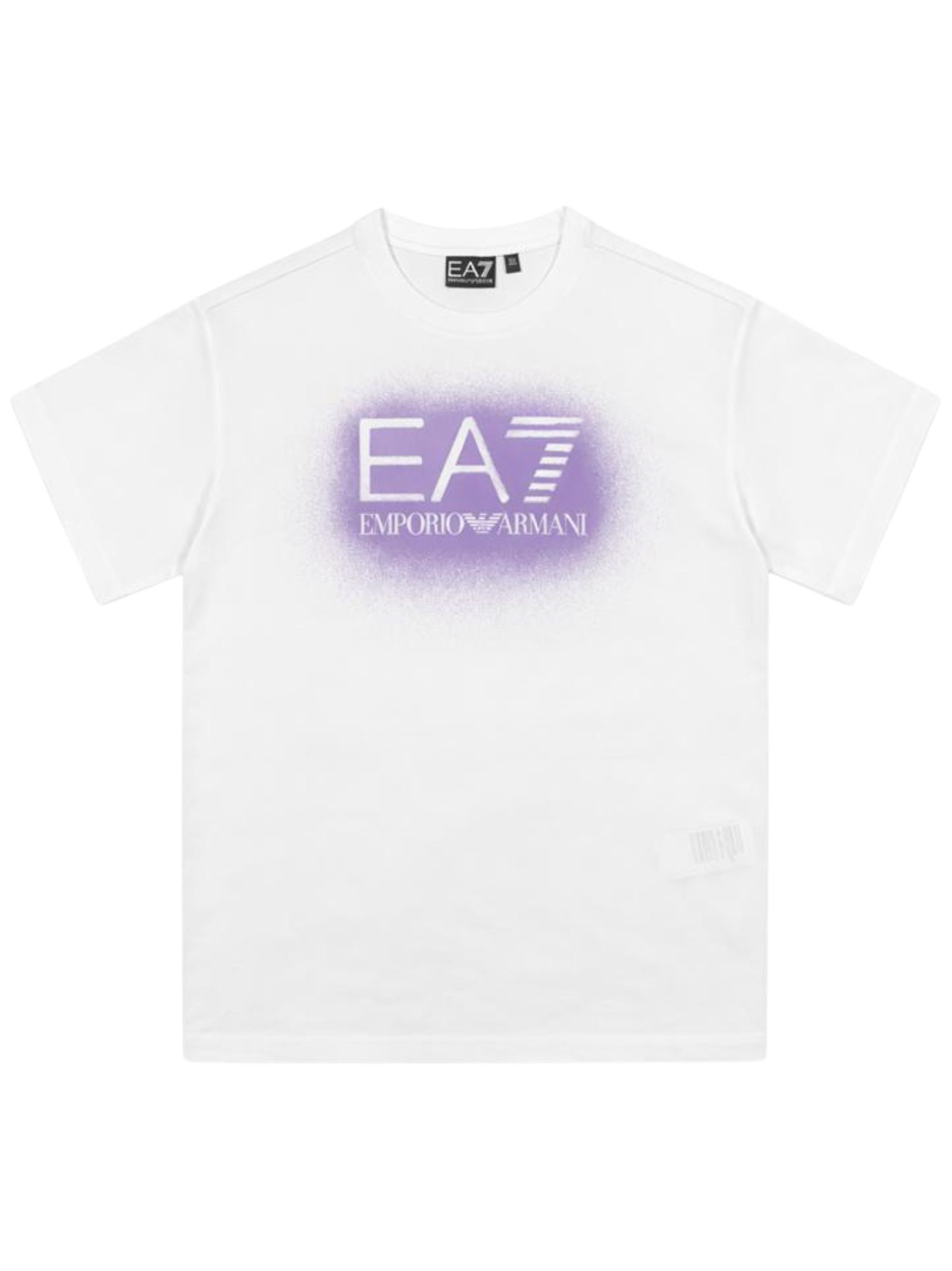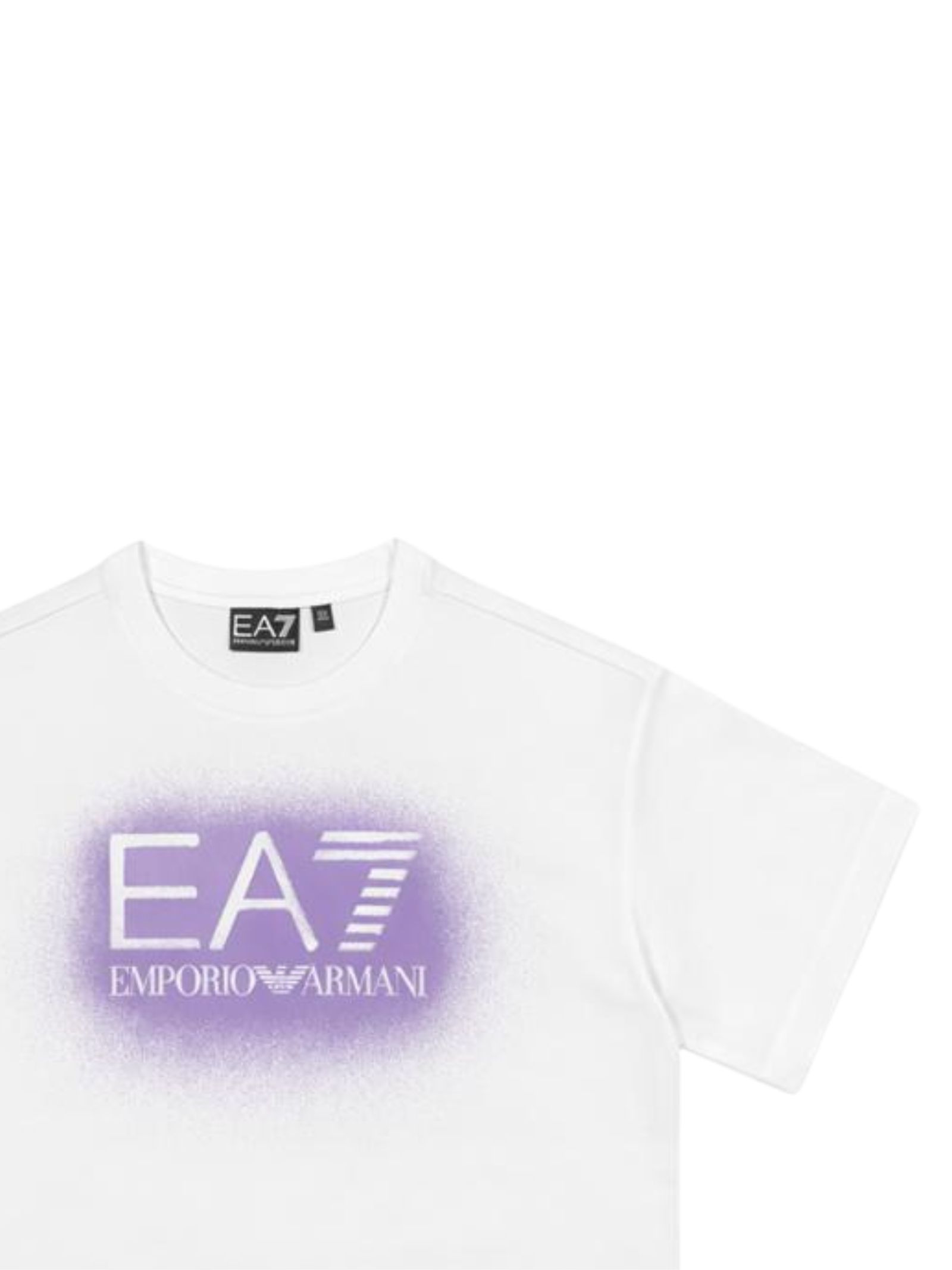 Emporio Armani Junior t-shirt di colore bianco, modello girocollo, mezza manica, stampa logo frontale a contrasto lilla, vestibilità regolare. Composizione: 100% cotone