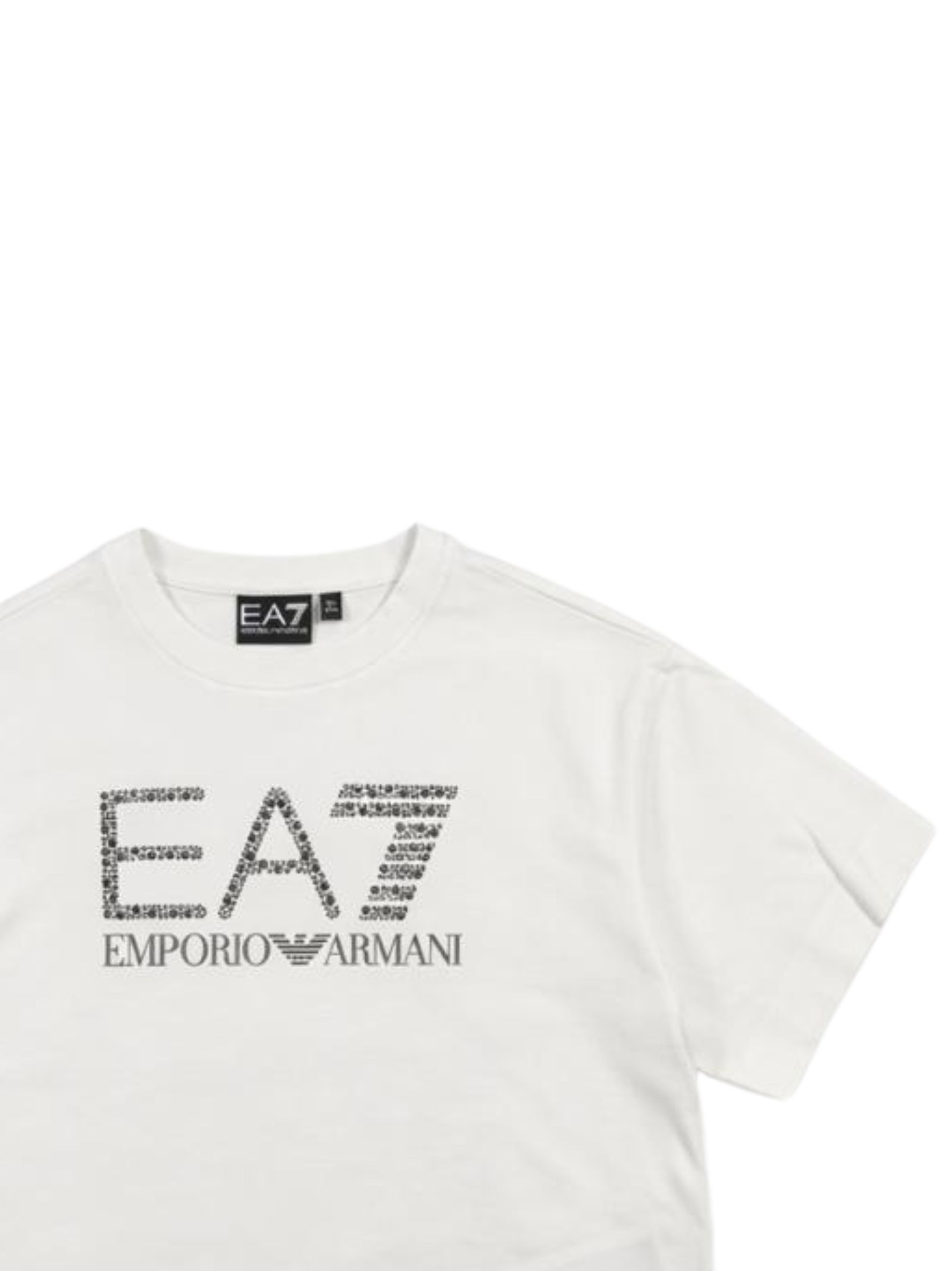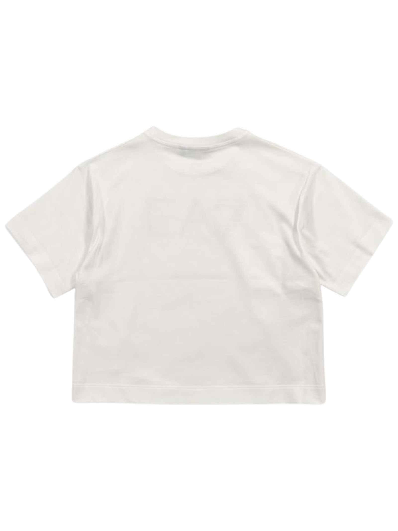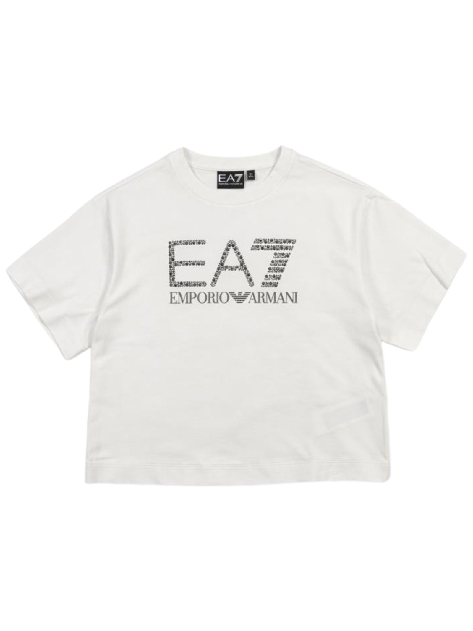 Emporio Armani Junior t-shirt di colore ghiaccio, design cropped, modello girocollo, mezza manica, dettaglio centrale con logo a contrasto argento decorato da borchie, vestibilità ampia. Composizione: 95% cotone 5% elastan