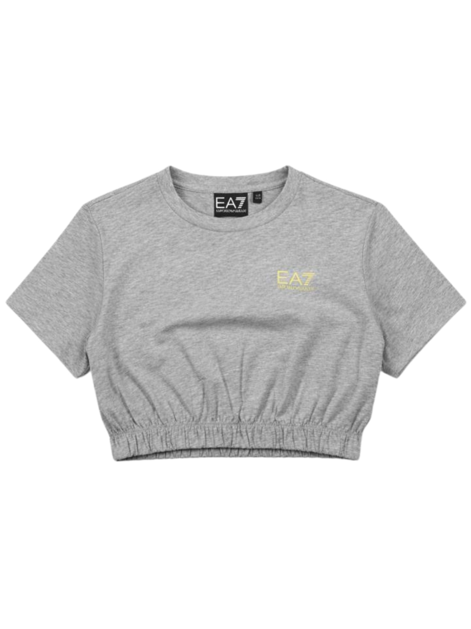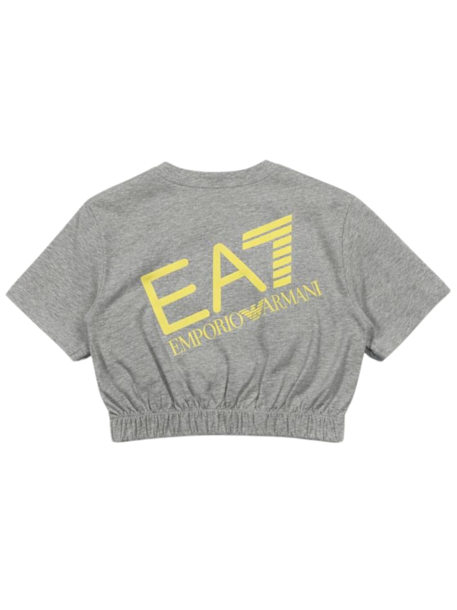 Emporio Armani Junior t-shirt di colore grigio, modello girocollo, mezza manica, logo a contrasto, orlo con elastico, vestibilità ampia. Composizione: 100% cotone
