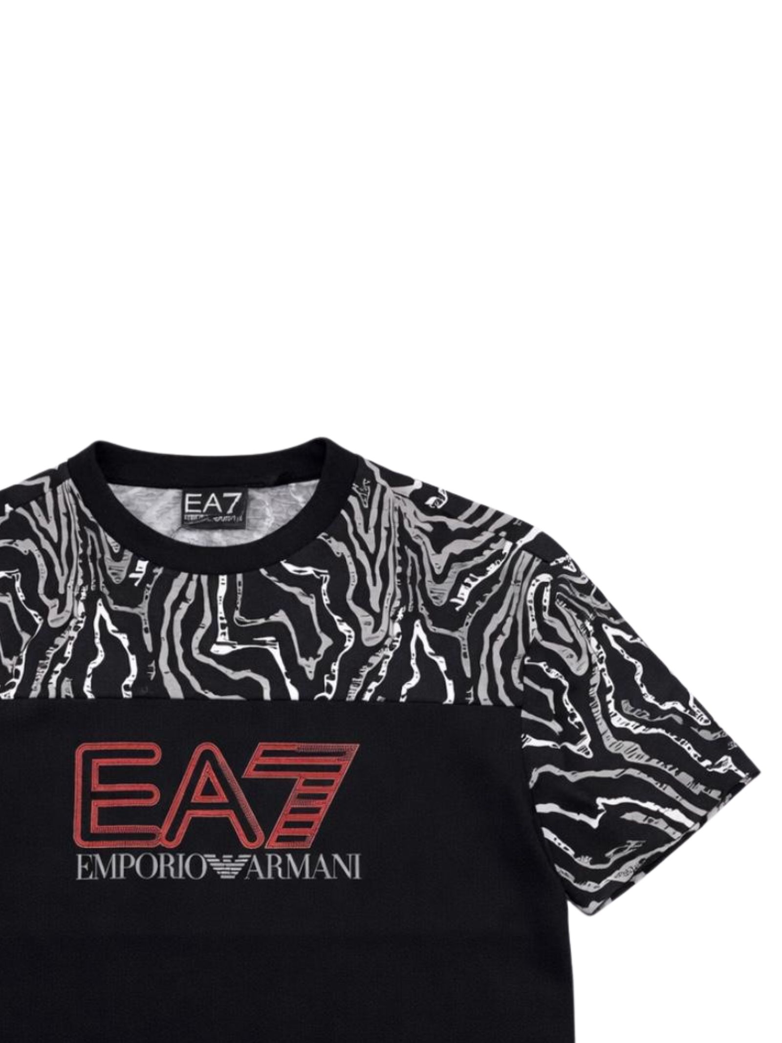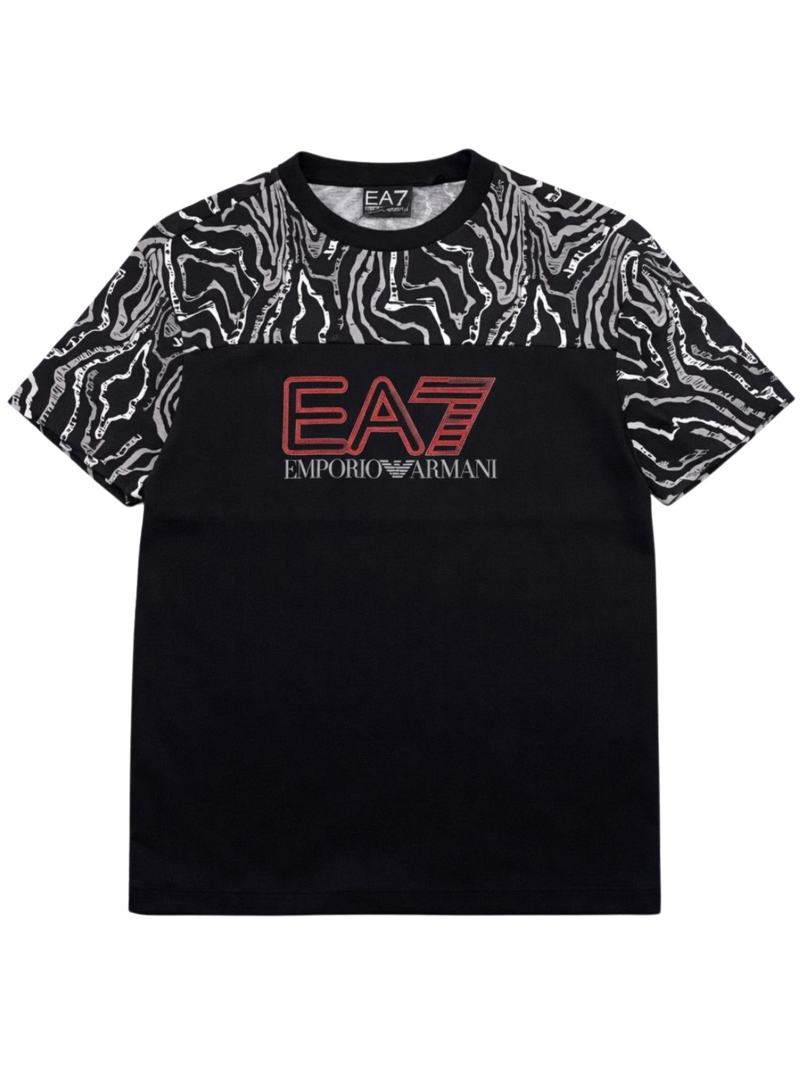 Emporio Armani Junior t-shirt di colore nero, dettagli a contrasto sulla parte superiore, modello girocollo, mezza manica, stampa logo centrale a contrasto rosso, vestibilità regolare. Composizione: 100% cotone