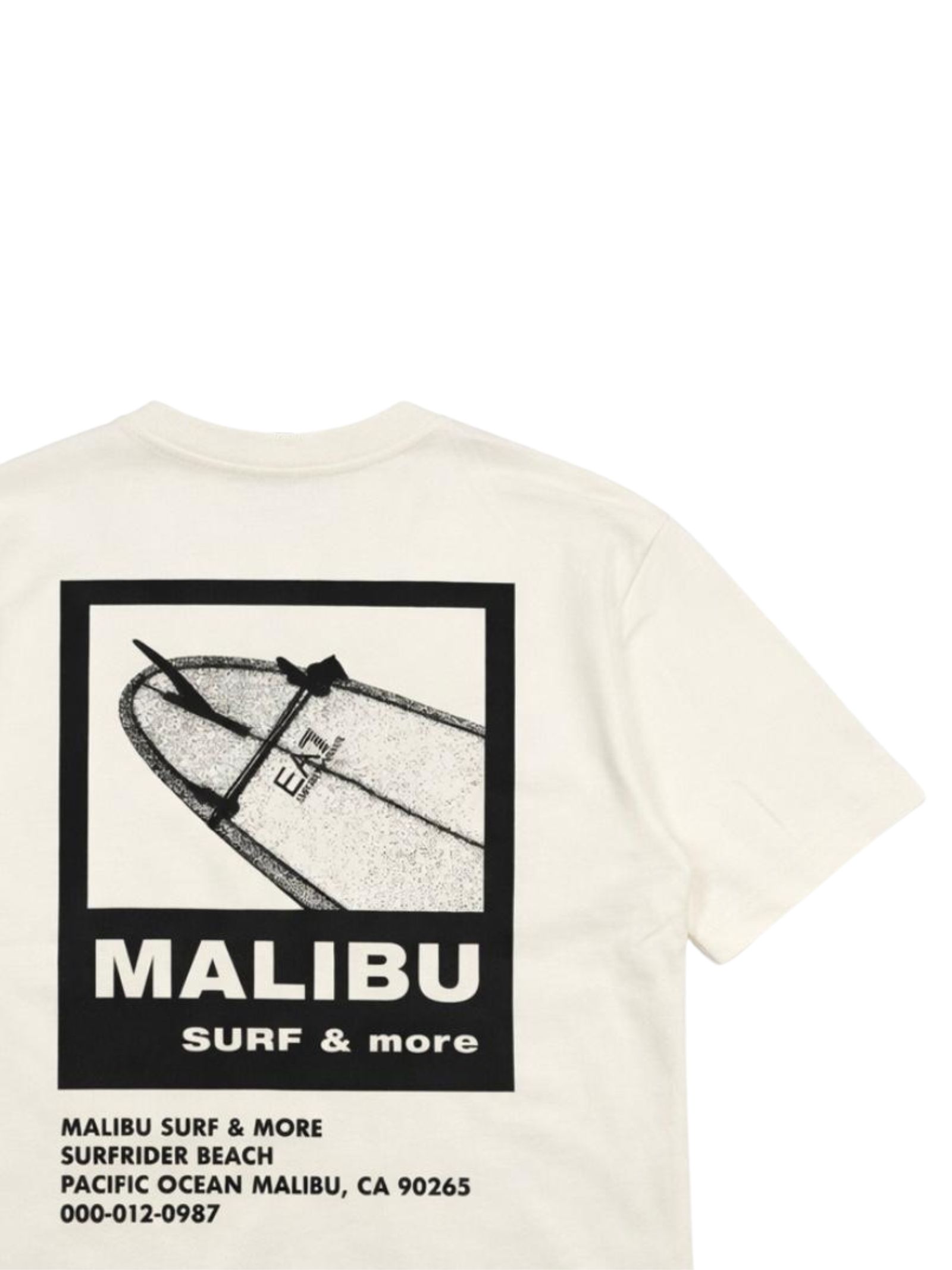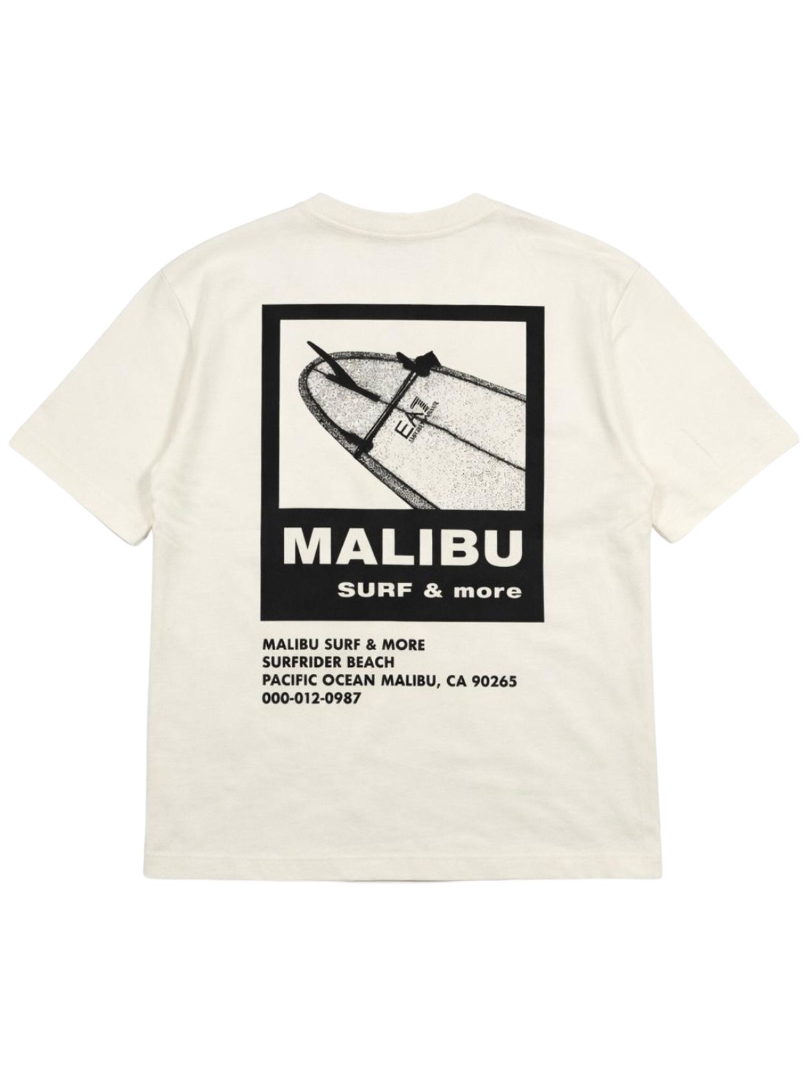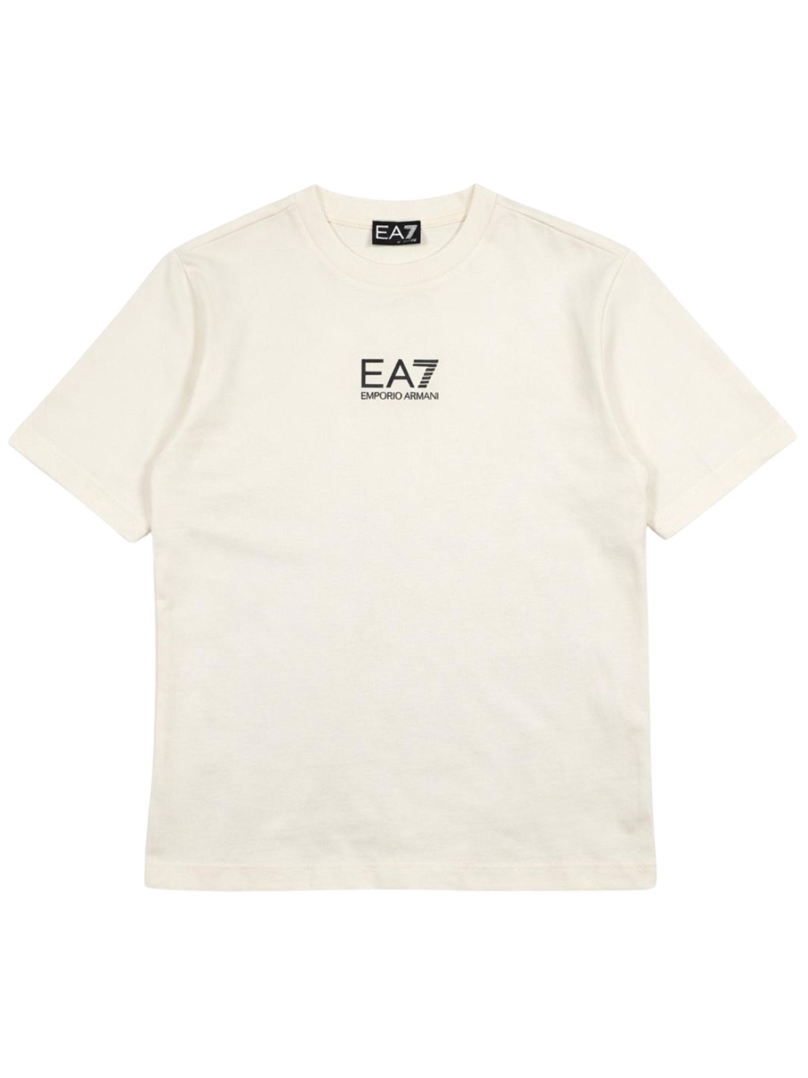 Emporio Armani Junior t-shirt di colore panna, modello girocollo, mezza manica, stampa sul retro e logo a contrasto nero, vestibilità regolare. Composizione: 100% cotone