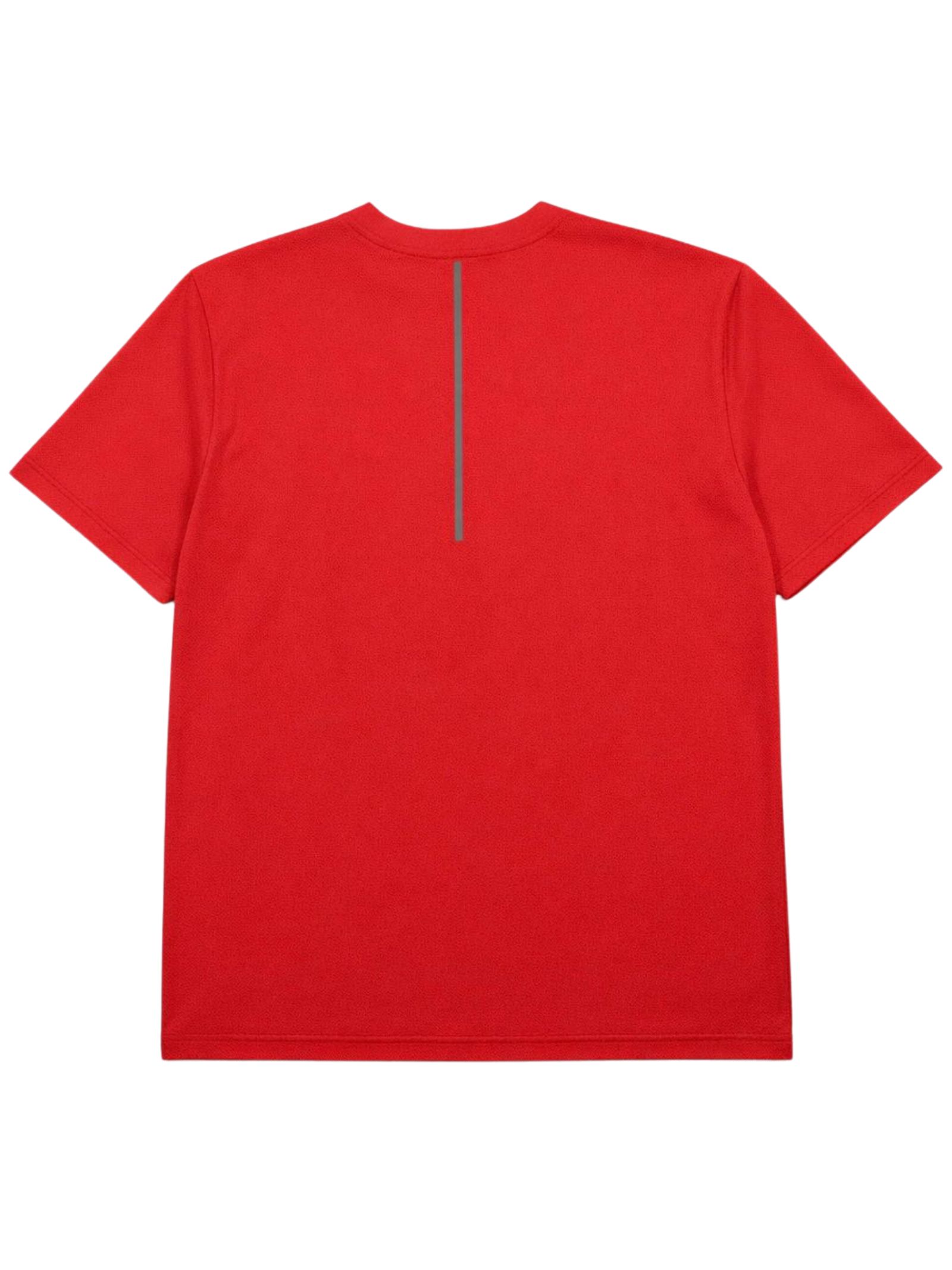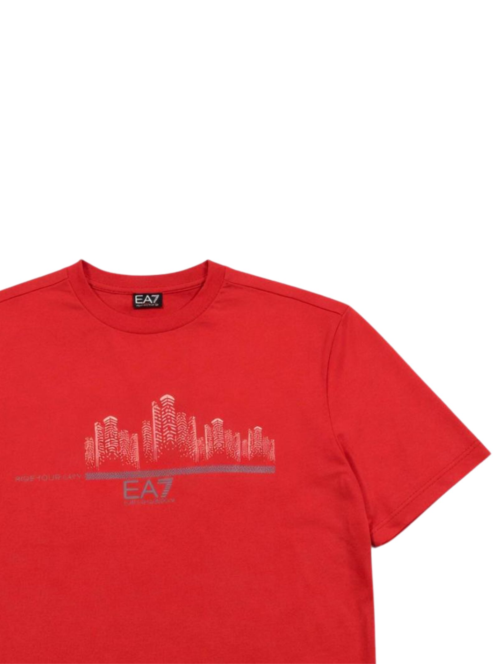 Emporio Armani Junior t-shirt di colore rosso, modello girocollo, mezza manica, stampa centrale con logo a contrasto, vestibilità regolare. Composizione: 92% poliammide 8% elastan