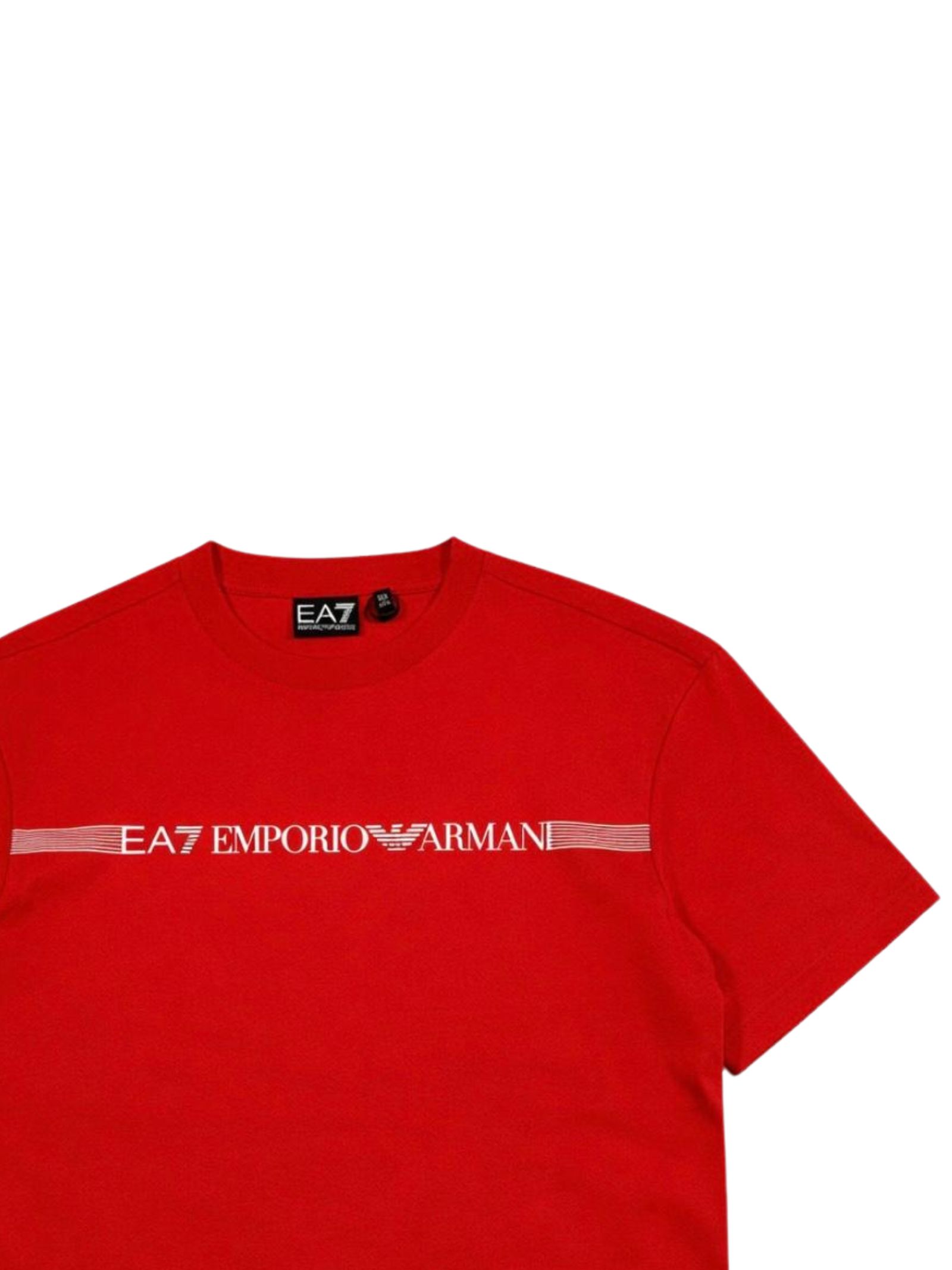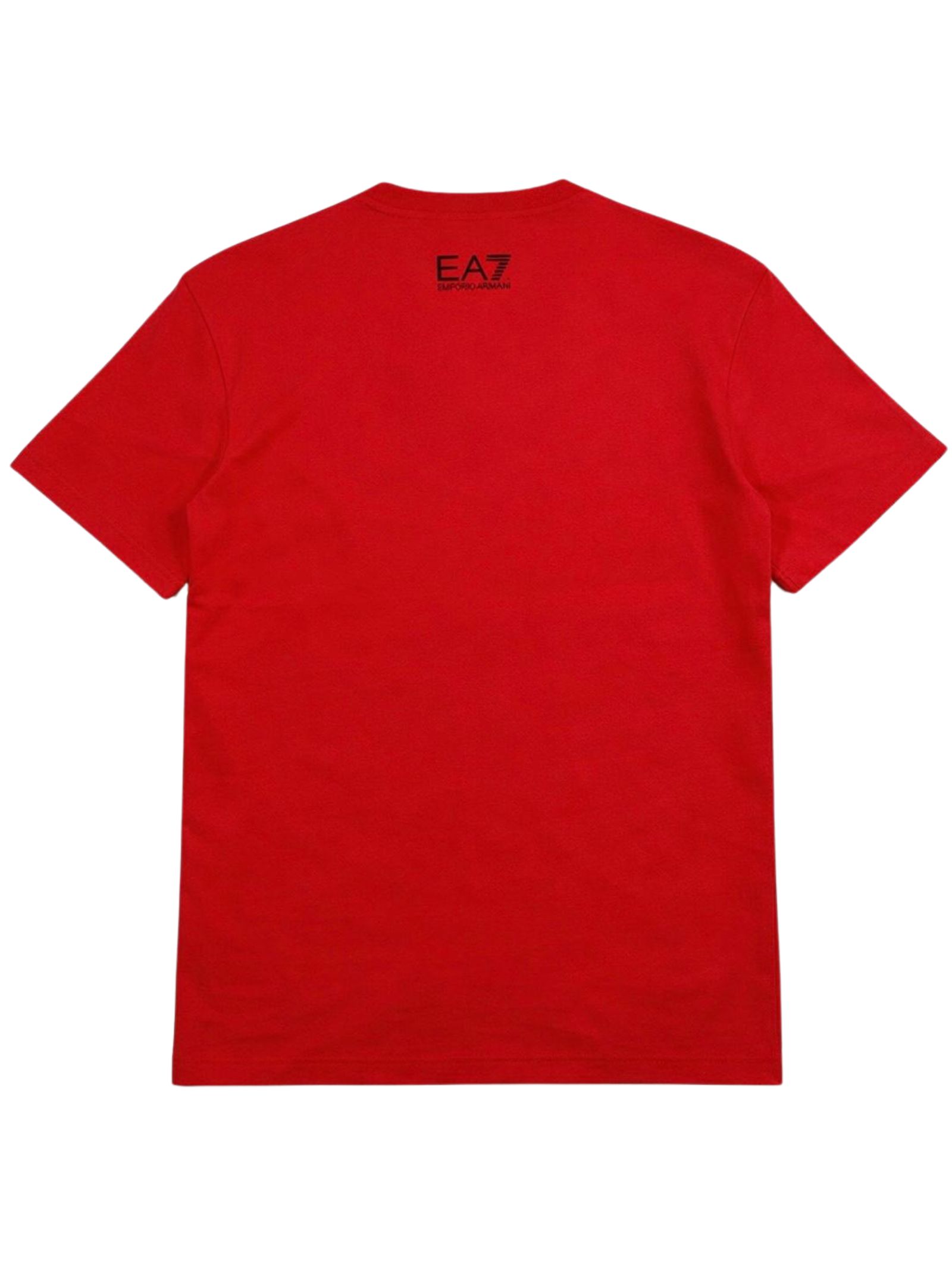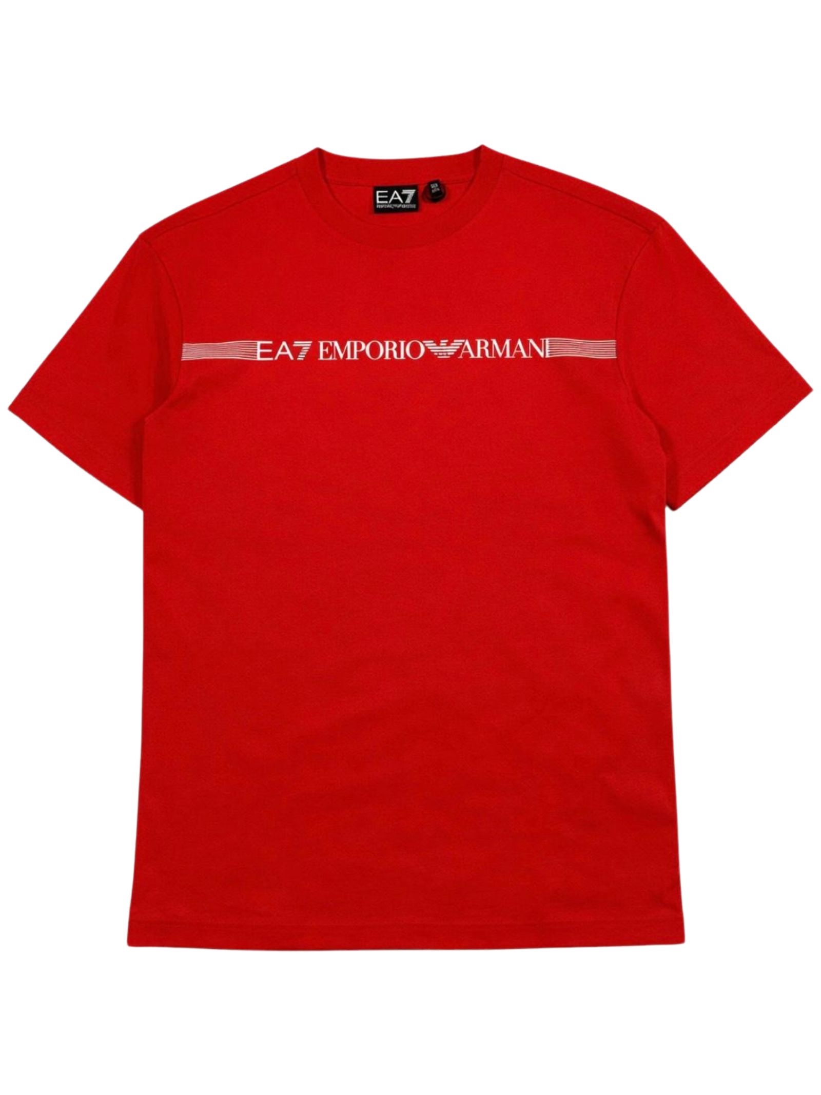 Emporio Armani Junior t-shirt di colore rosso, modello girocollo, mezza manica, logo frontale a contrasto, vestibilità regolare. Composizione: 100% cotone