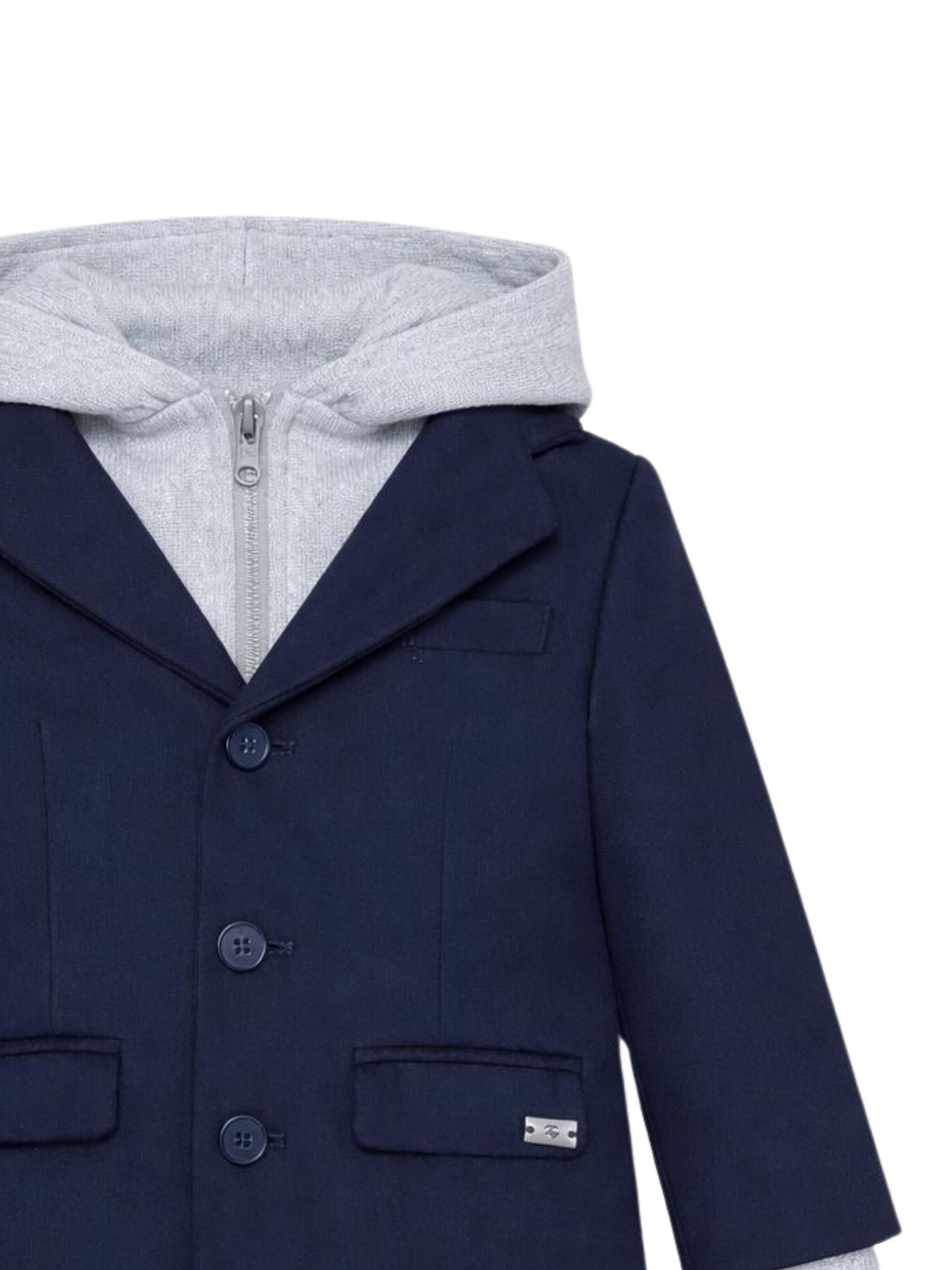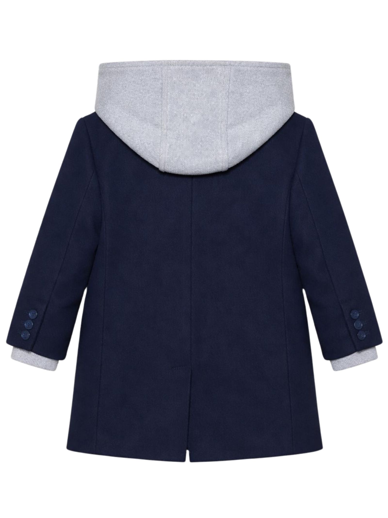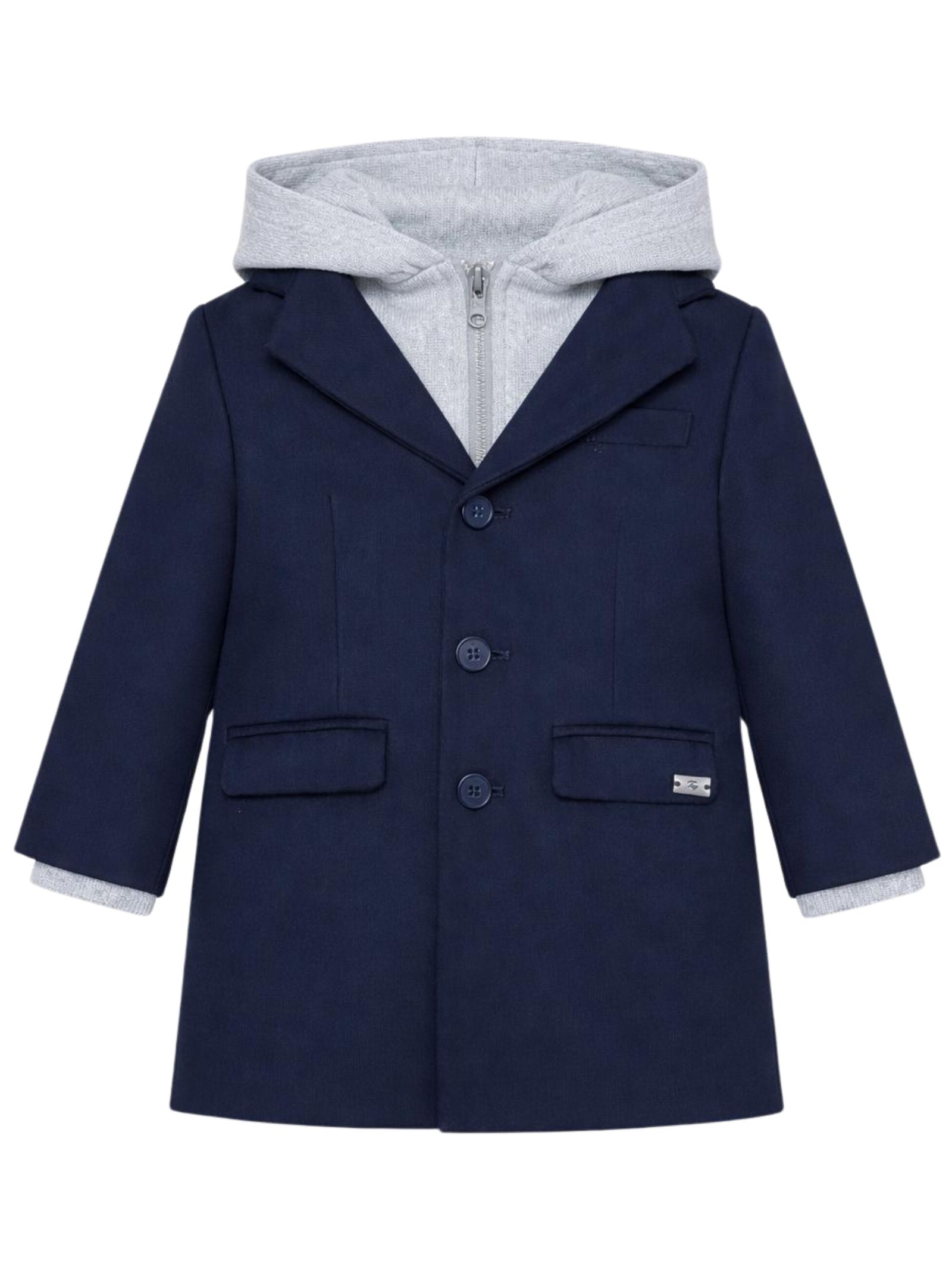 Fay Junior cappotto di colore blu, modello monopetto in panno, applicazione logo in metallo, modello con cappuccio effetto felpa a contrasto grigio, bottoni, zip, multitasche. Composizione: 80% lana 15% Poliammide 5% Cashmere
