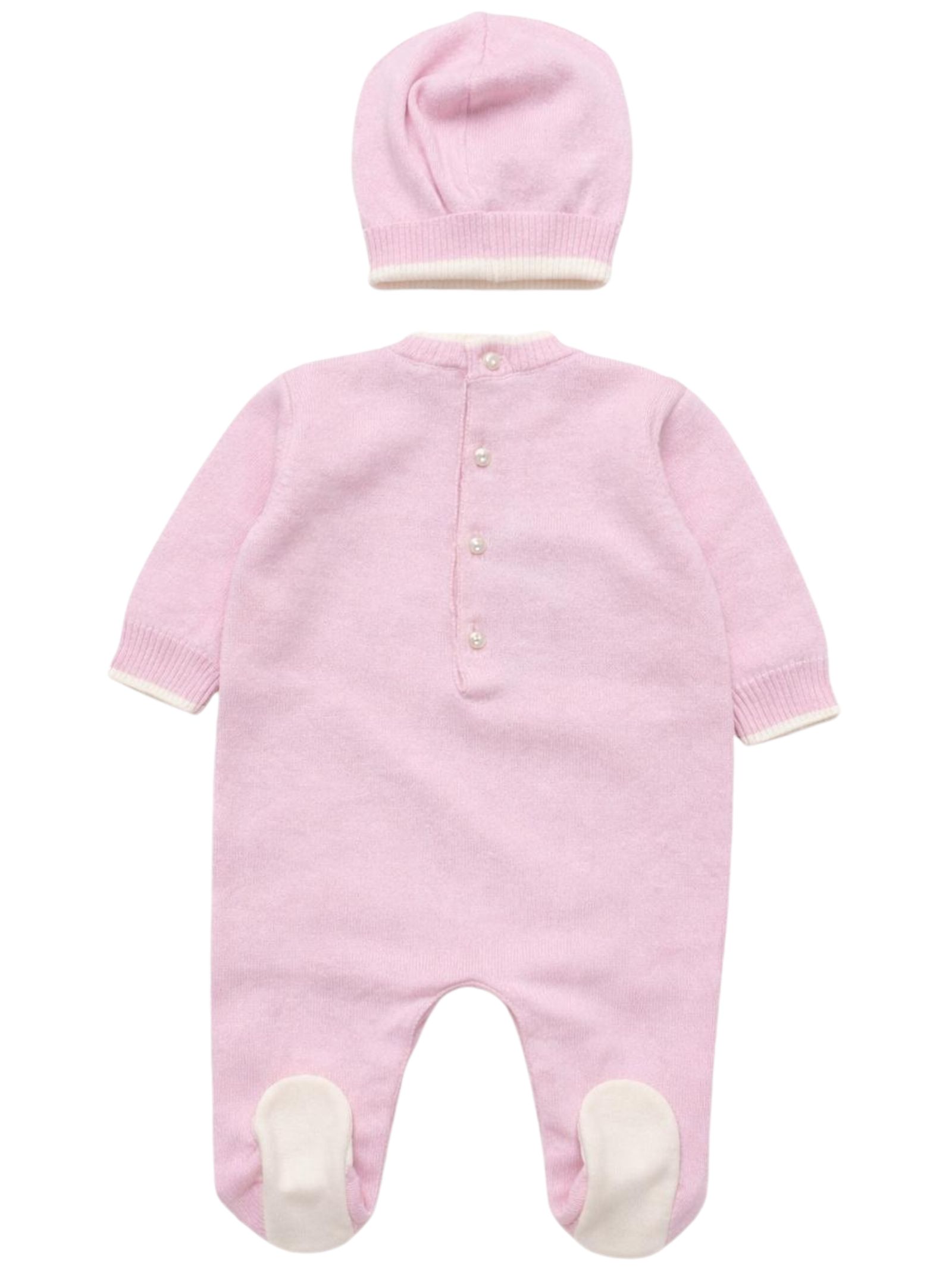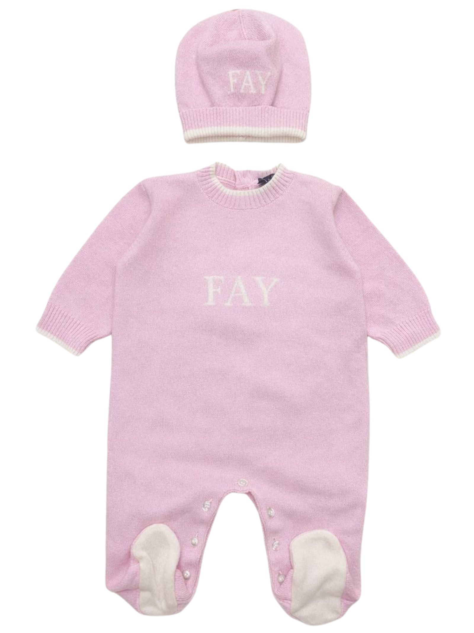 Fay Kids completo in maglia rasata di colore rosa, modello girocollo, logo intarsiato sul torace, maniche lunghe con polsini a costine, chiusura sul retro con bottoni, finale con copripiedi, chiusura sul fondo con bottoni; cappello abbinato con risvolto a costine, logo intarsiato sul davanti. Composizione: 90% Lana 10% cashmere. Made in Italy