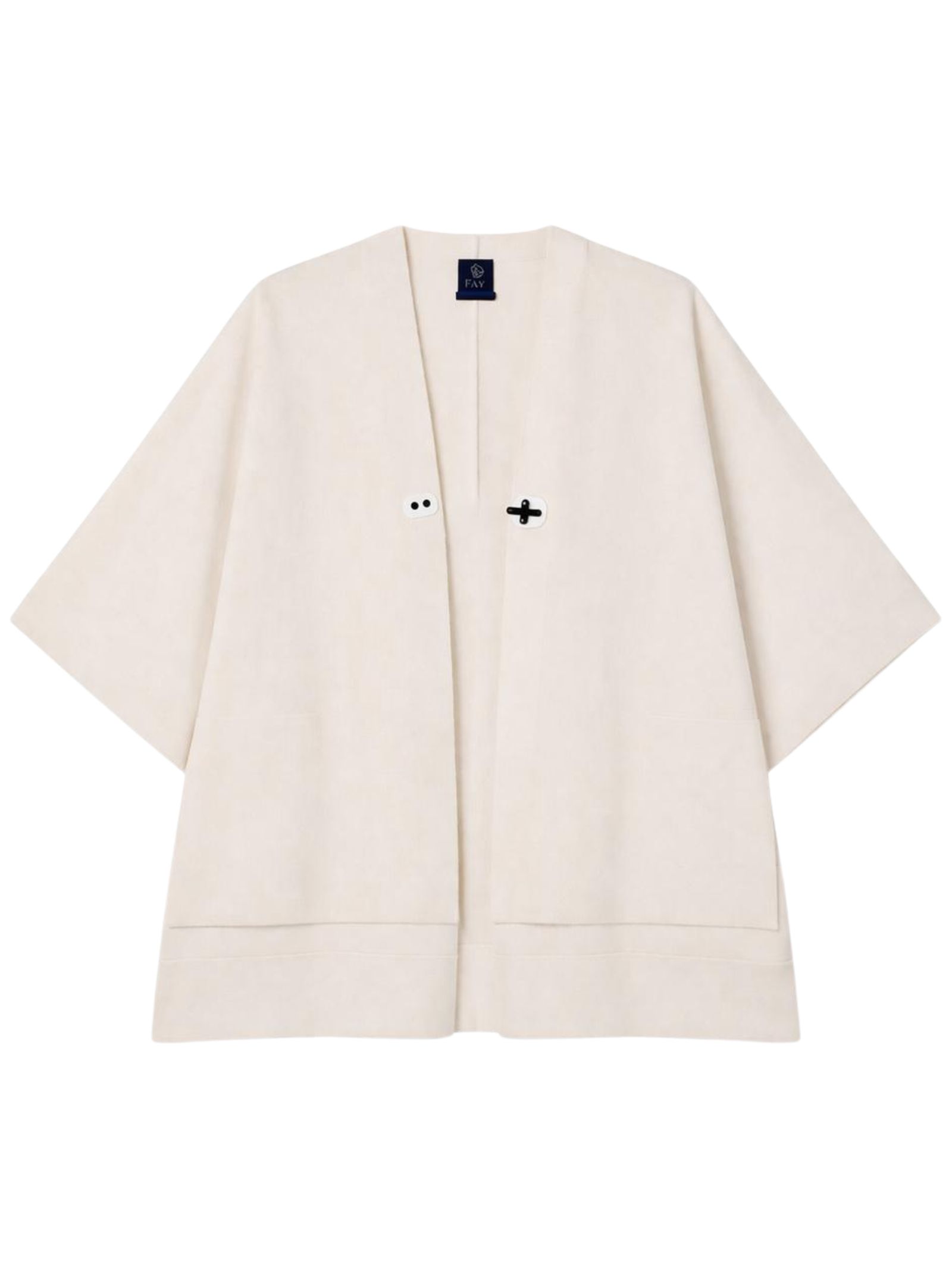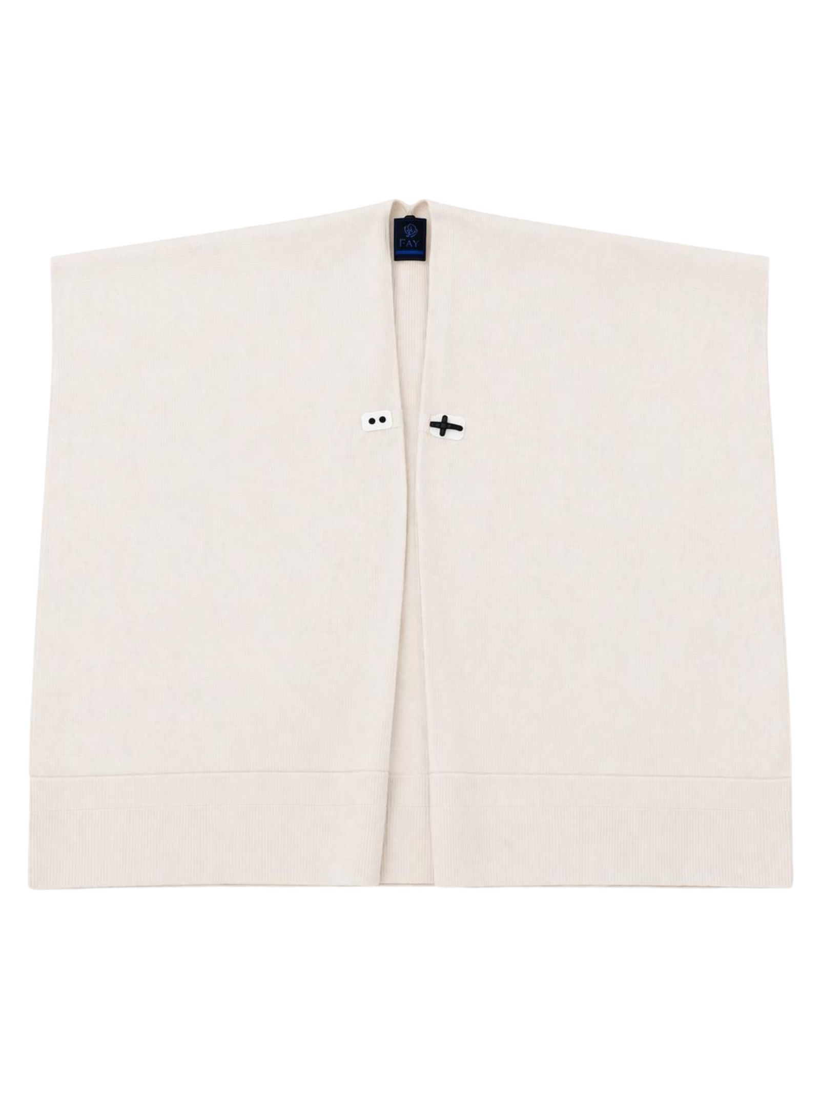 Fay Kids mantella di colore panna, chiusura con l'iconico gancio Fay sul petto, maniche corte con apertura e orlo asimmetrico, lavorazione in maglia fine con rifinitura a coste. Composizione: 90% lana, 10% cashmere. Made in Italy