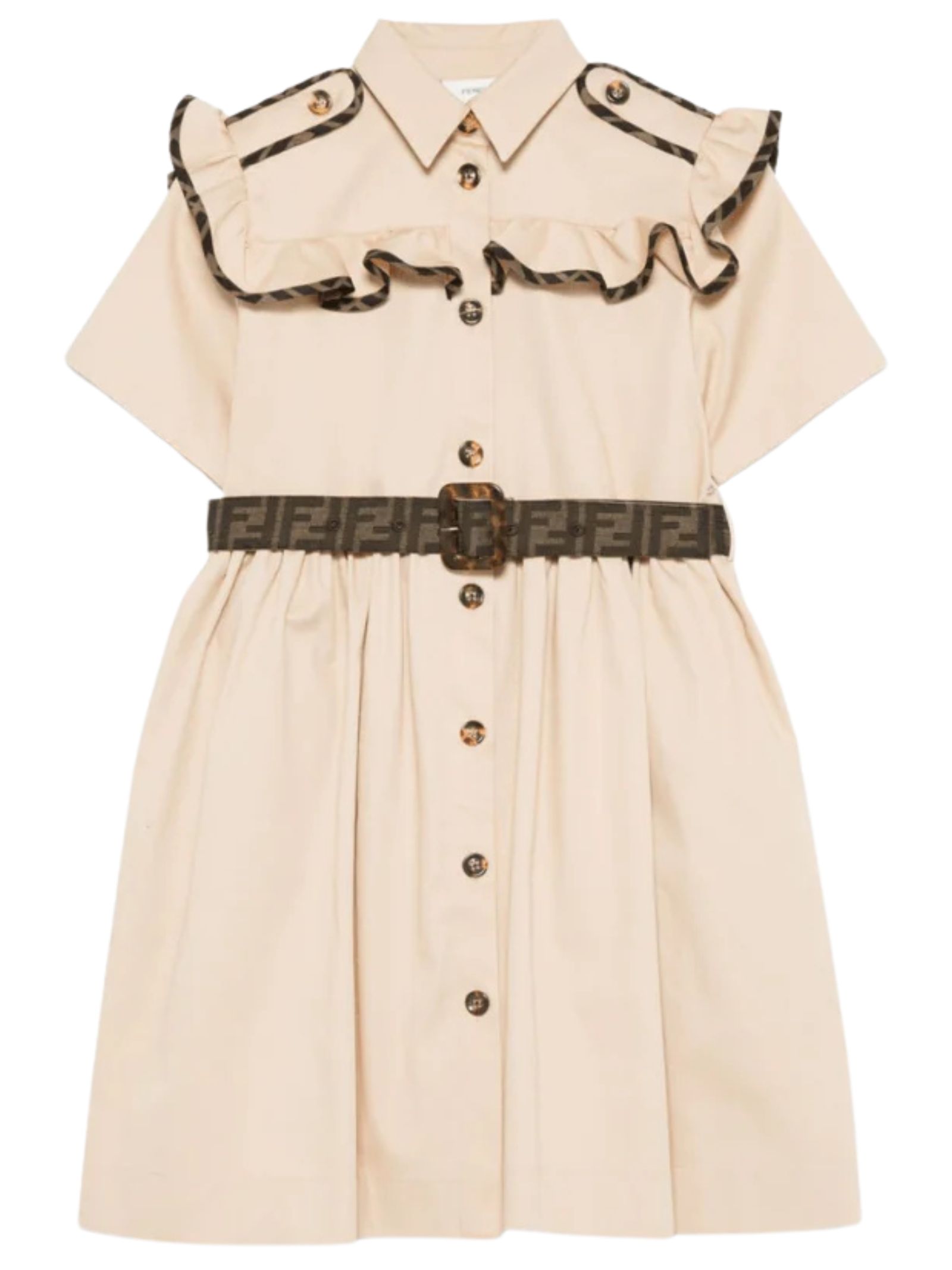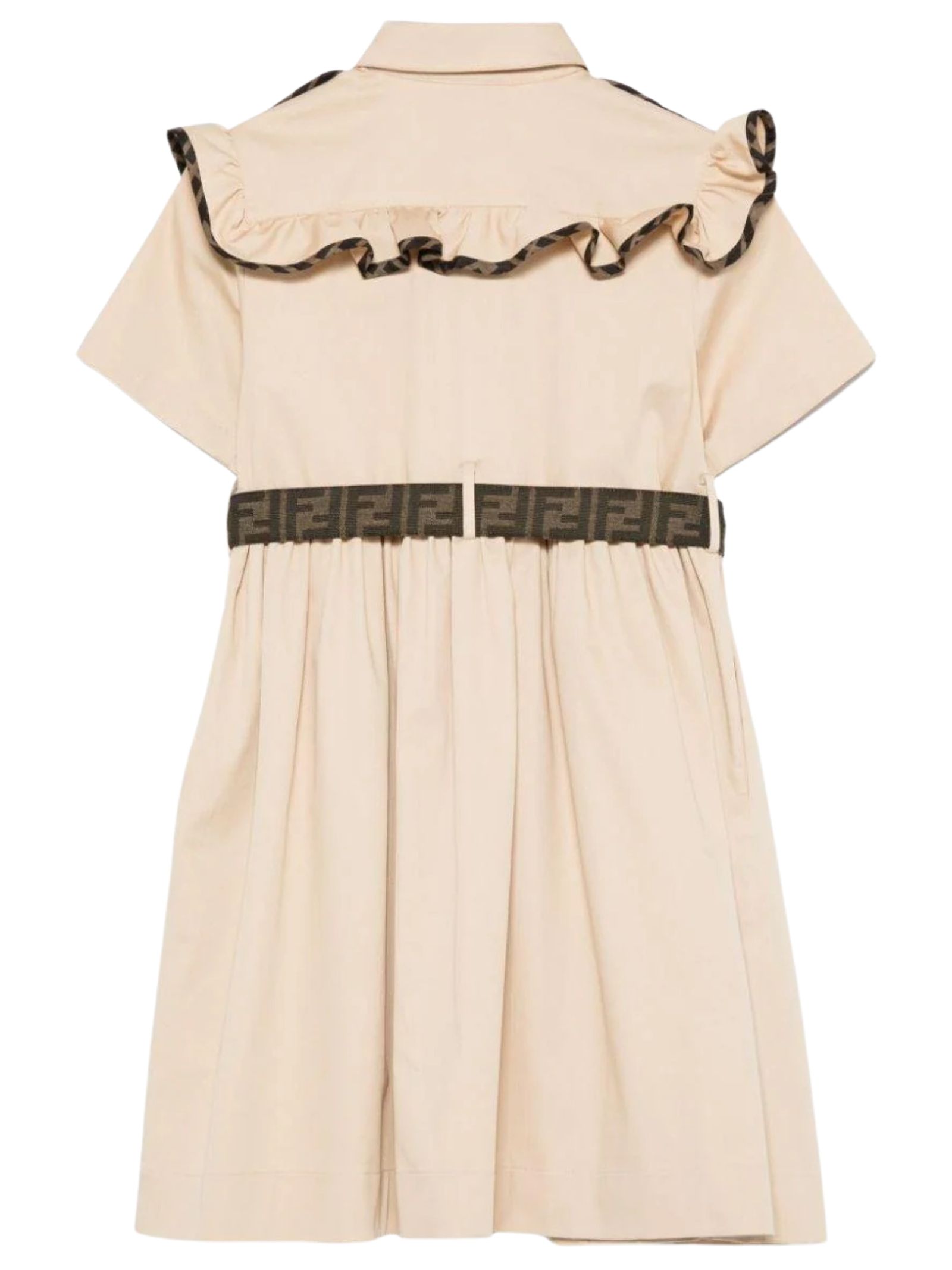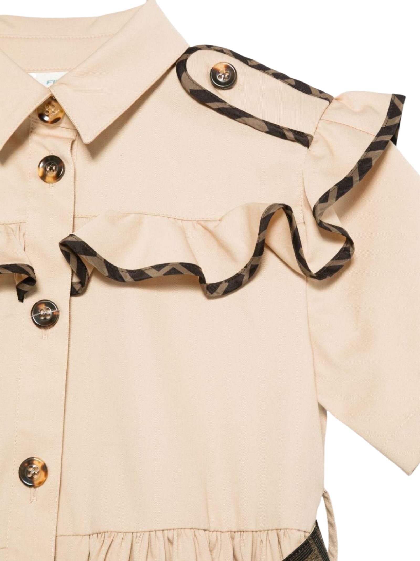Fendi Kids abito di colore beige realizzato in gabardina, apertura con bottoncini, rouches con bordino con logo FF color tabacco e cintura in vita con logo FF all-over, vestibilità regolare. Composizione: 97% cotone 3% elastan. Made in Italy