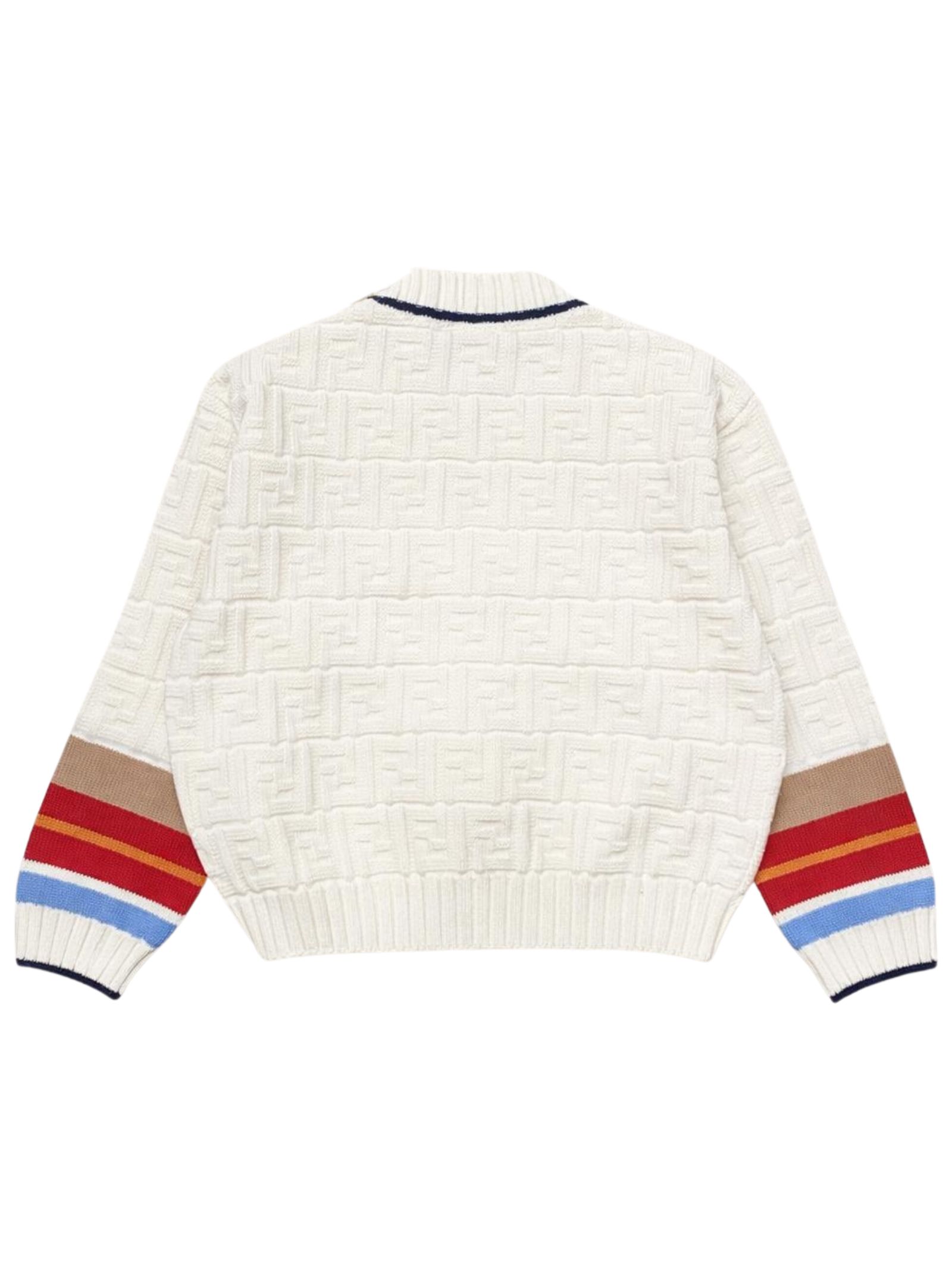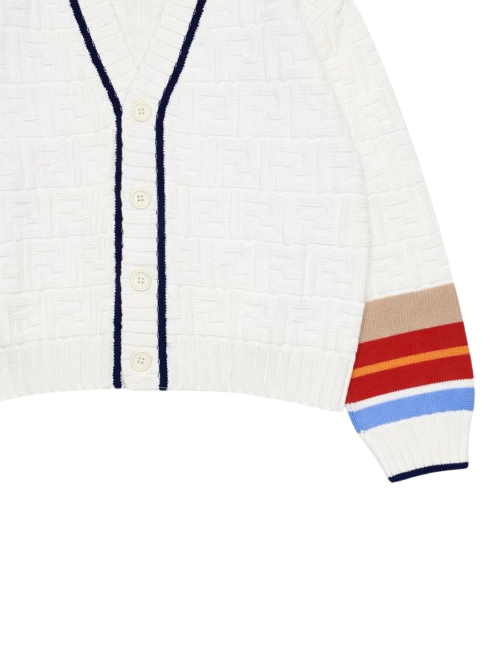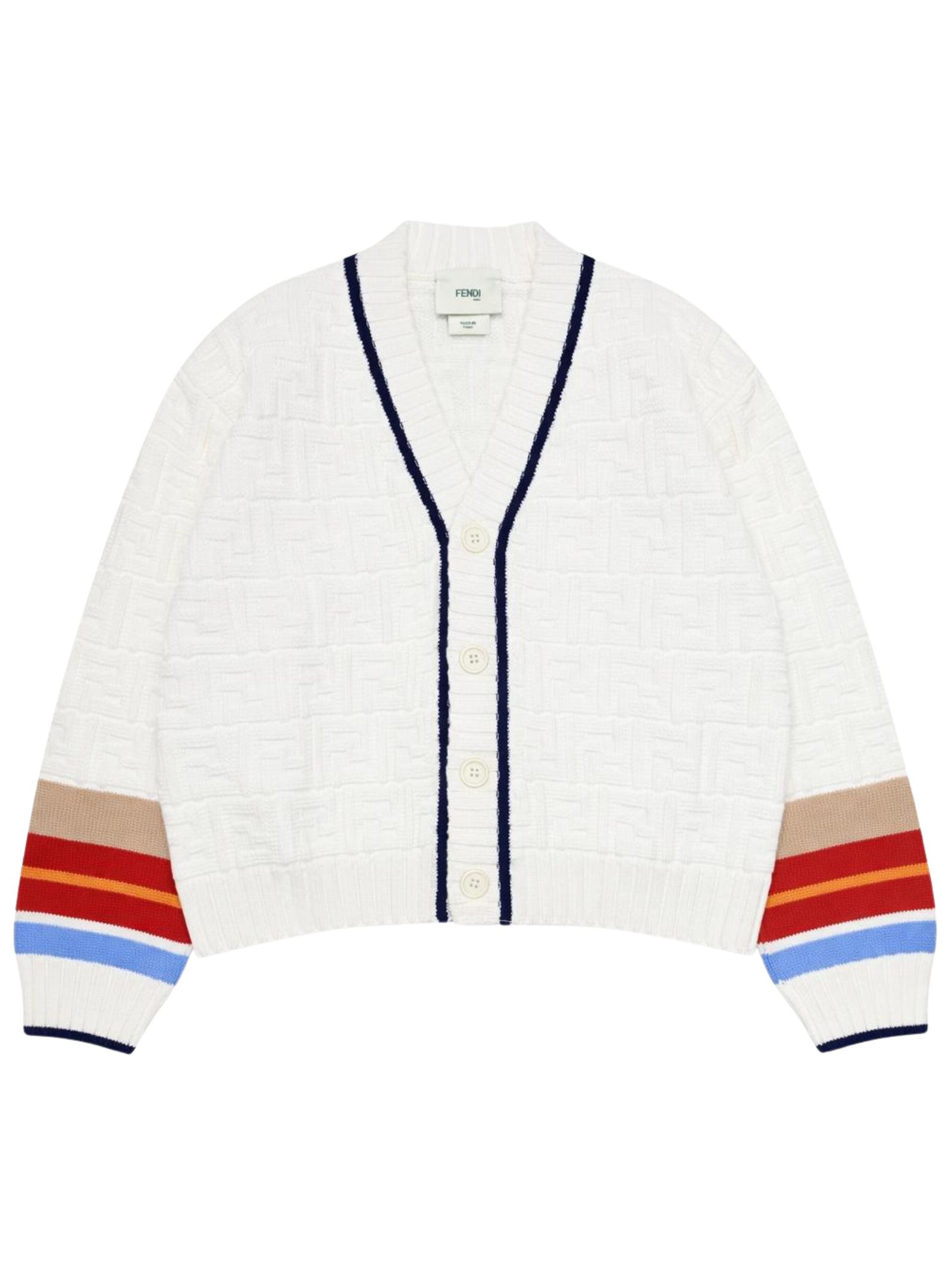 Fendi Kids cardigan di colore bianco con logo FF intarsiato su tutta la superficie, modello con maniche lunghe, scollo a V, dettagli a contrasto multicolor, chiusura centrale con bottoni, orli a costine. Composizione: 100% cotone. Made in Italy