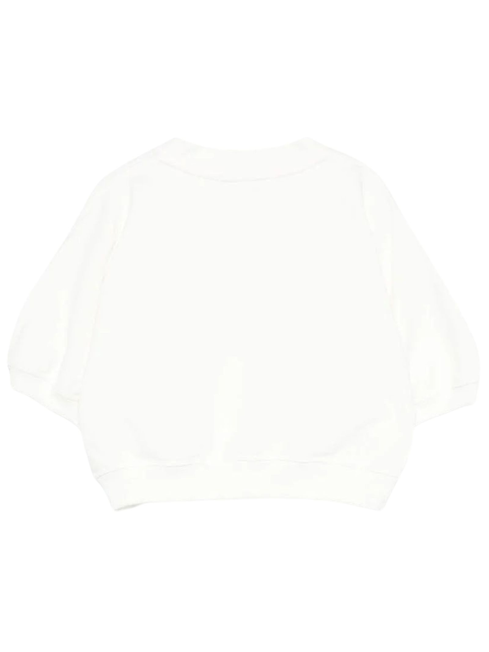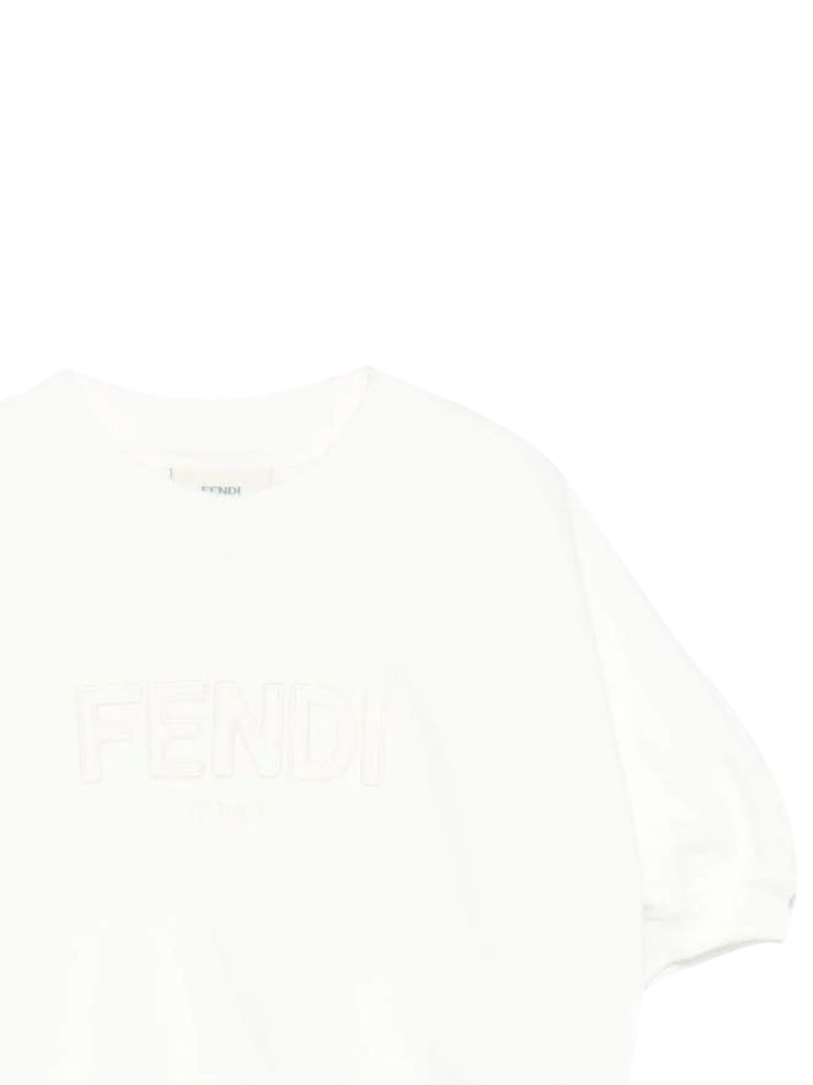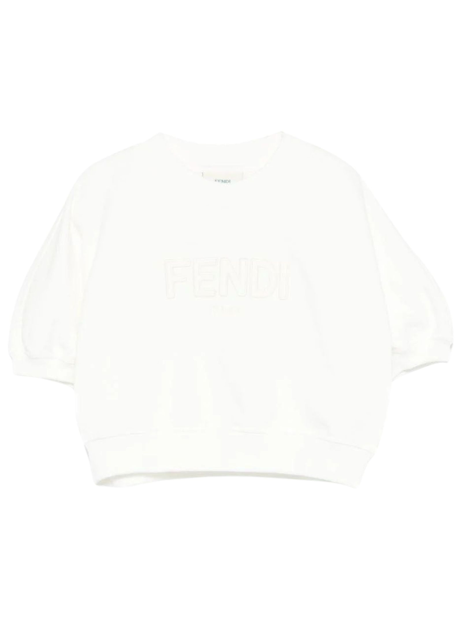 Fendi Kids felpa di colore bianco, modello cropped, mezze maniche con spalle scese, logo centrale su tinta, orli a costine. Composizione: 100% cotone