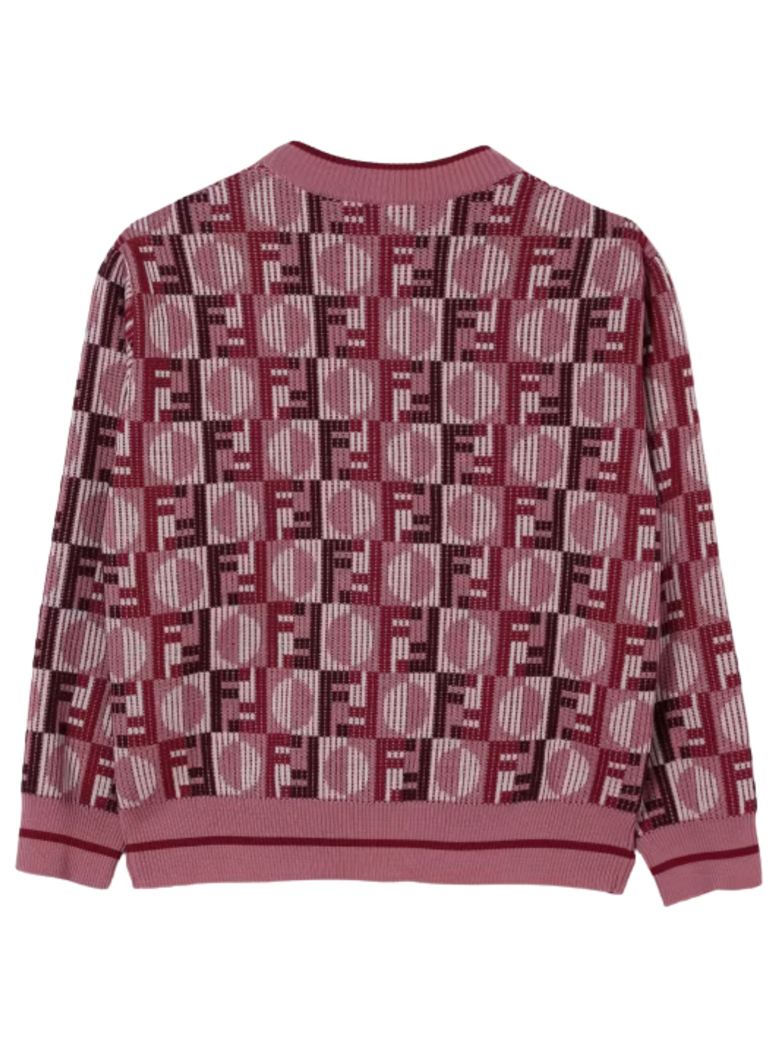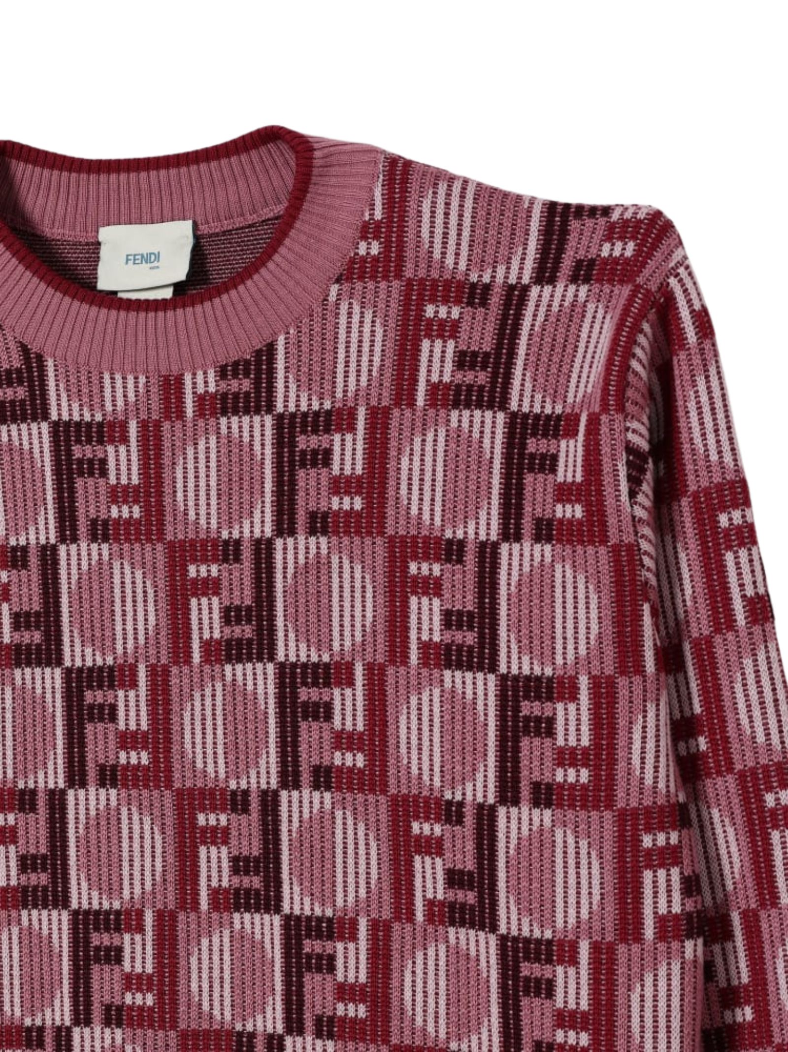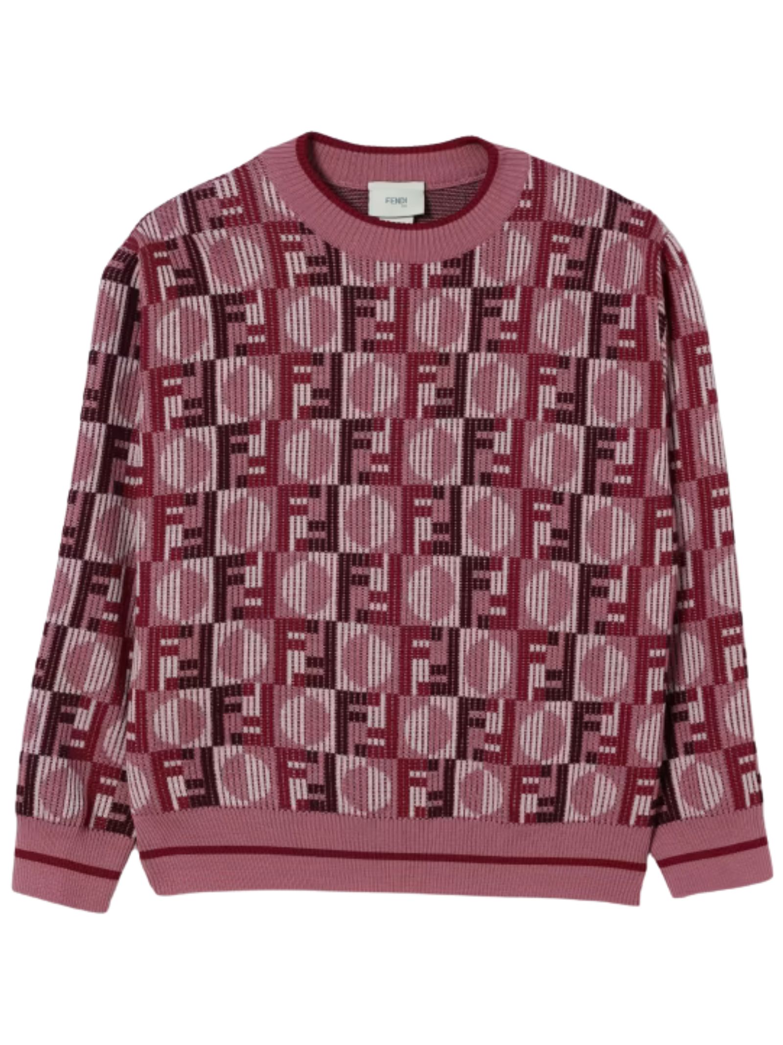 FENDI Kids maglione di colore rosa, modello girocollo, maniche lunghe, realizzato in maglia, logo intarsiato a contrasto bordeau su tutta la superficie, finiture a costine. Composizione: 100% Lana. Made in Italy