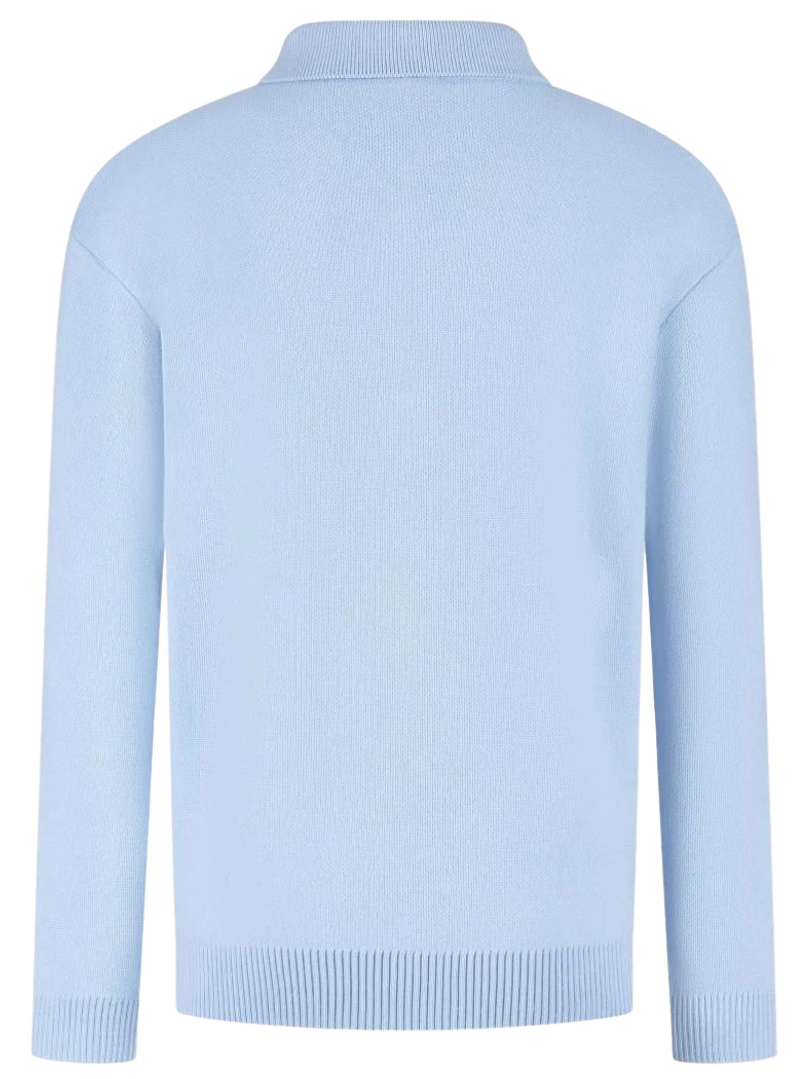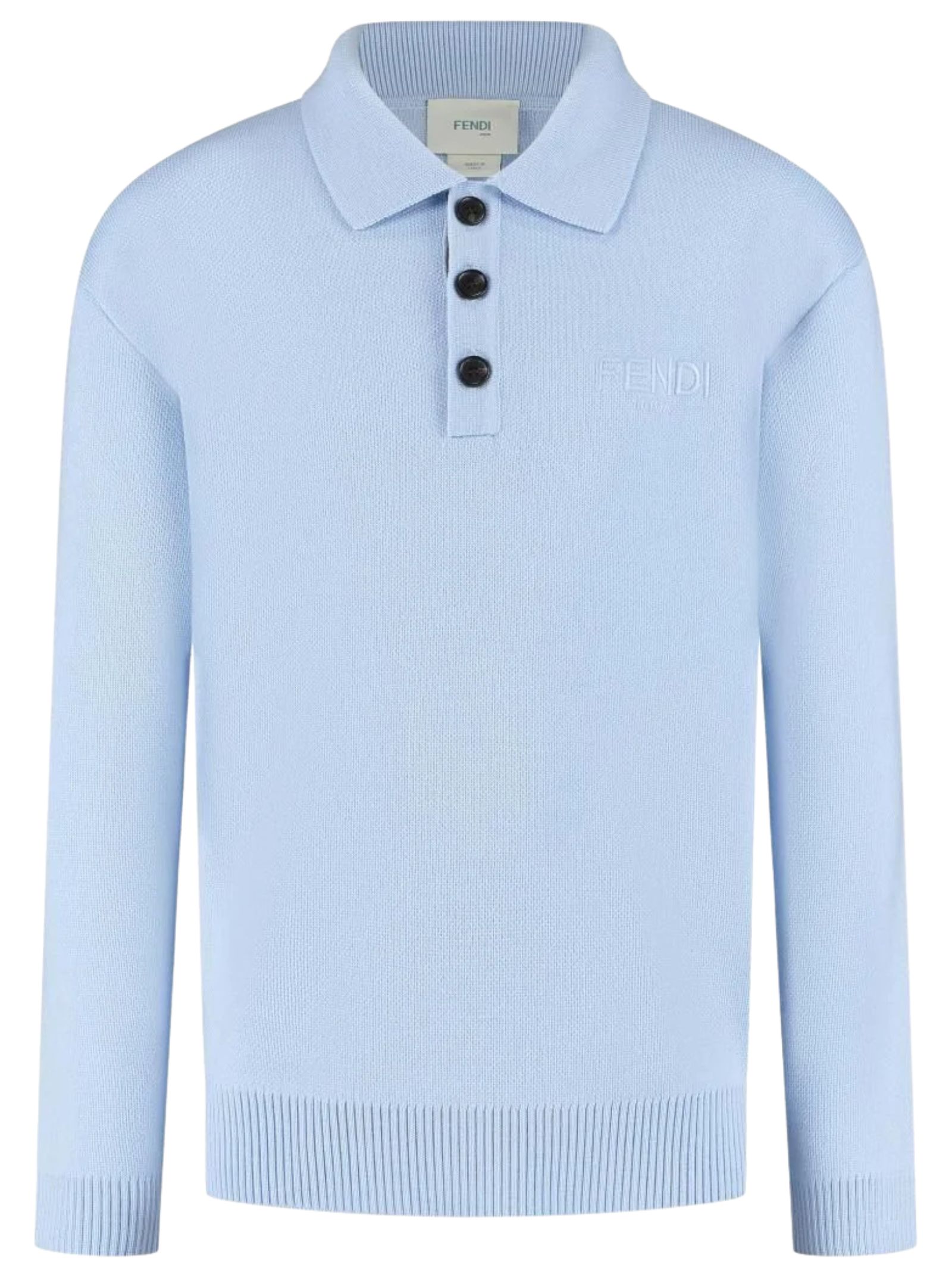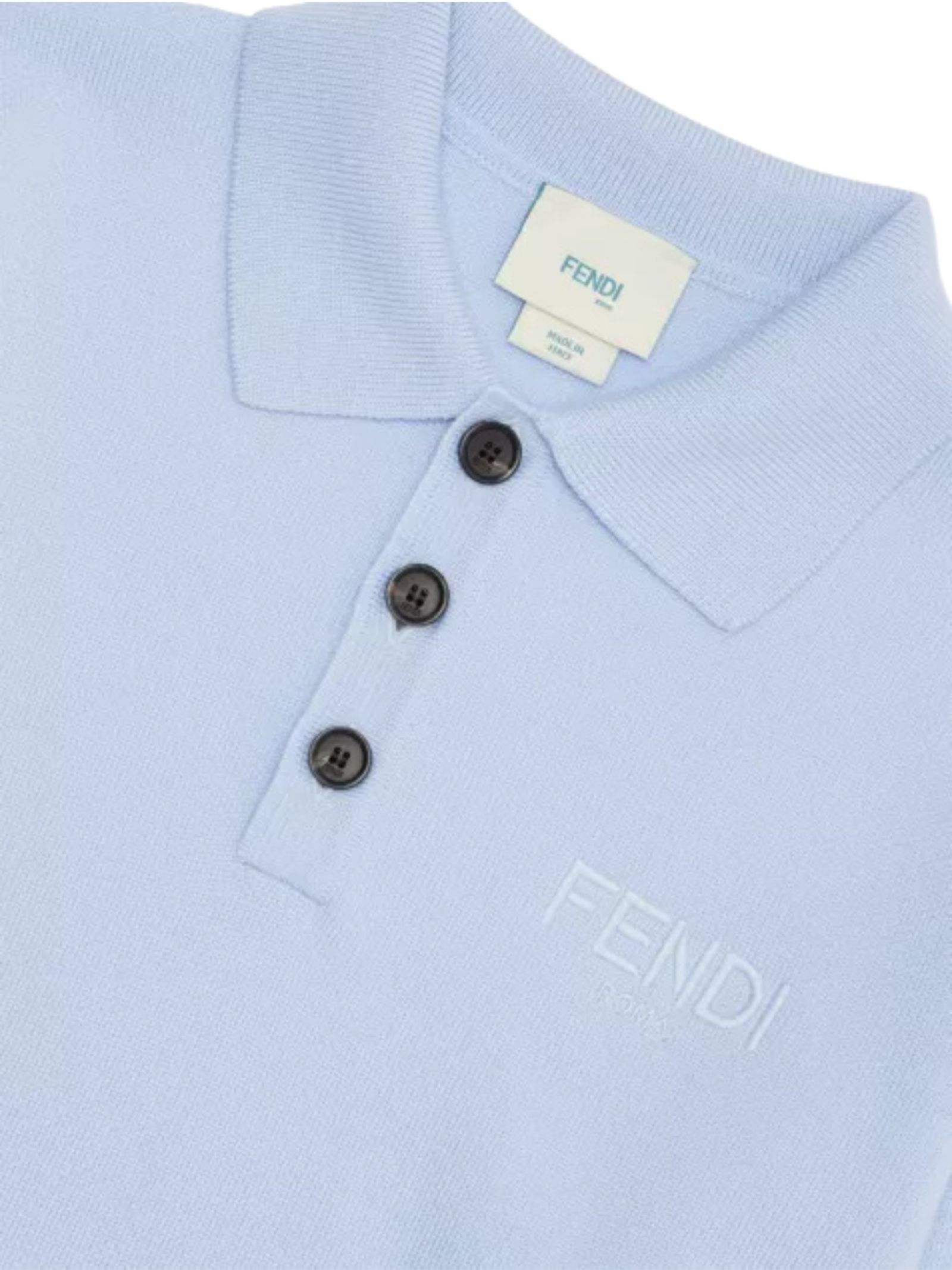 FENDI Kids polo di colore azzurro, modello con maniche lunghe, realizzato in maglia, logo intarsiato sul petto, finiture a costine. Composizione: 100% Lana. Made in Italy