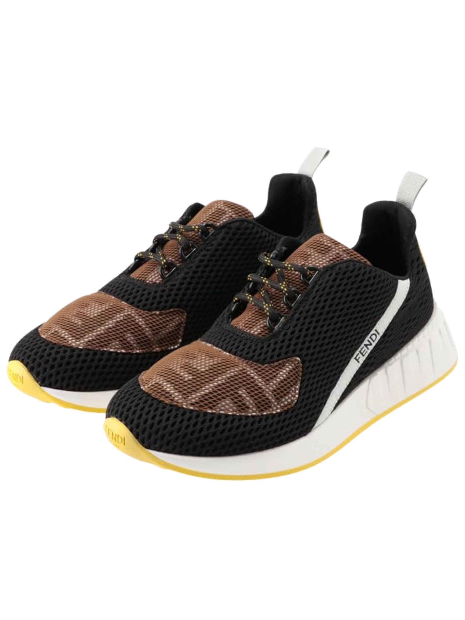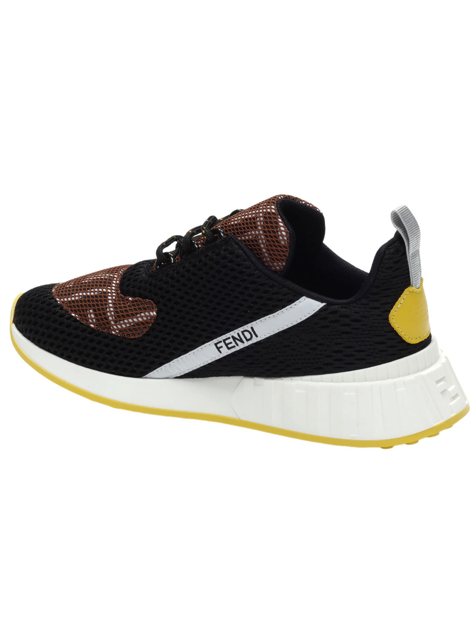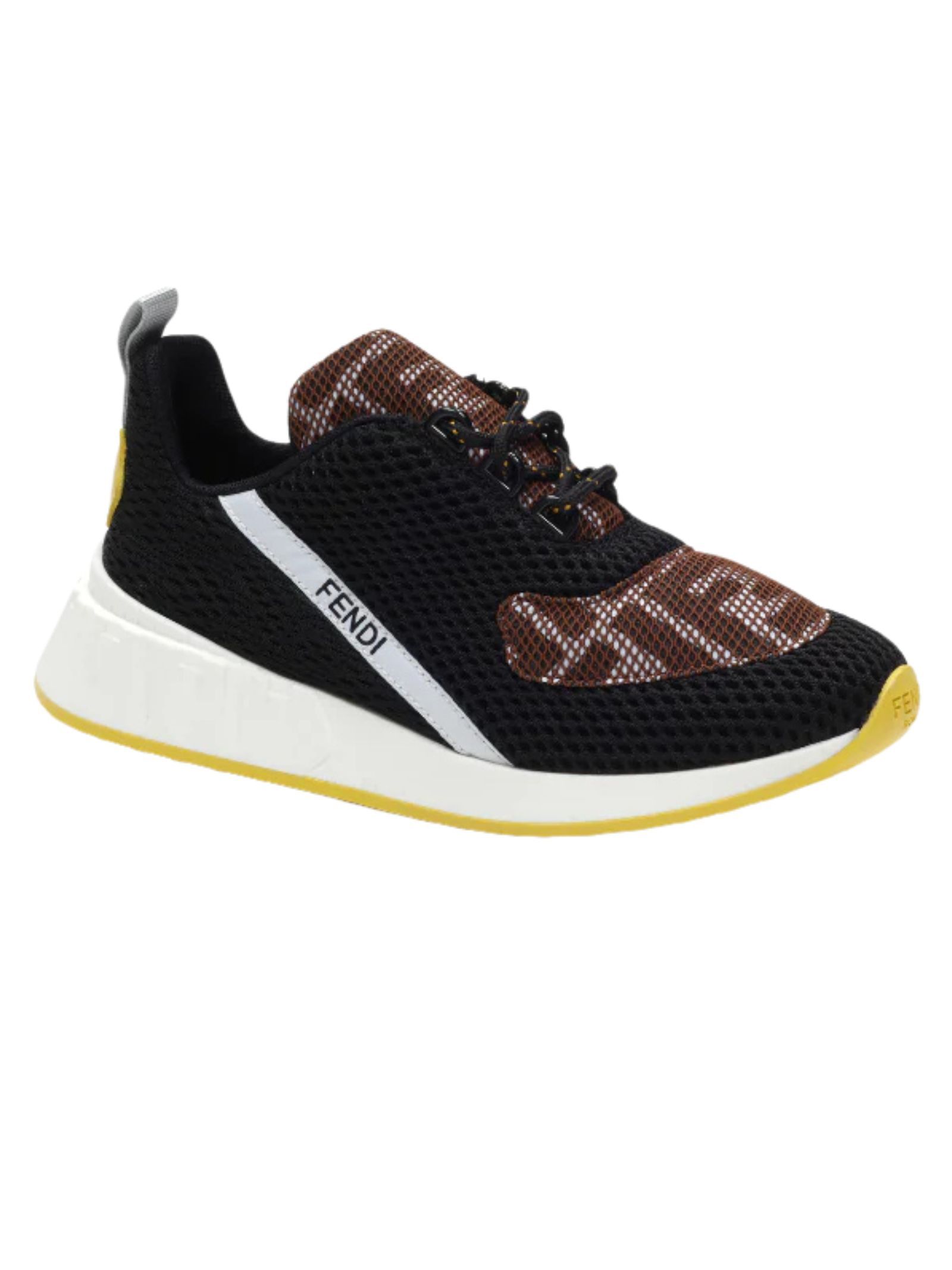 FENDI Kids scarpe in tela elastica, stringate, realizzate in rete, di colore nero con tomaia in mesh per un'impressione sportiva, parti in giallo e marrone, applicazione logo sul retro e sul laterale. Made in Italy