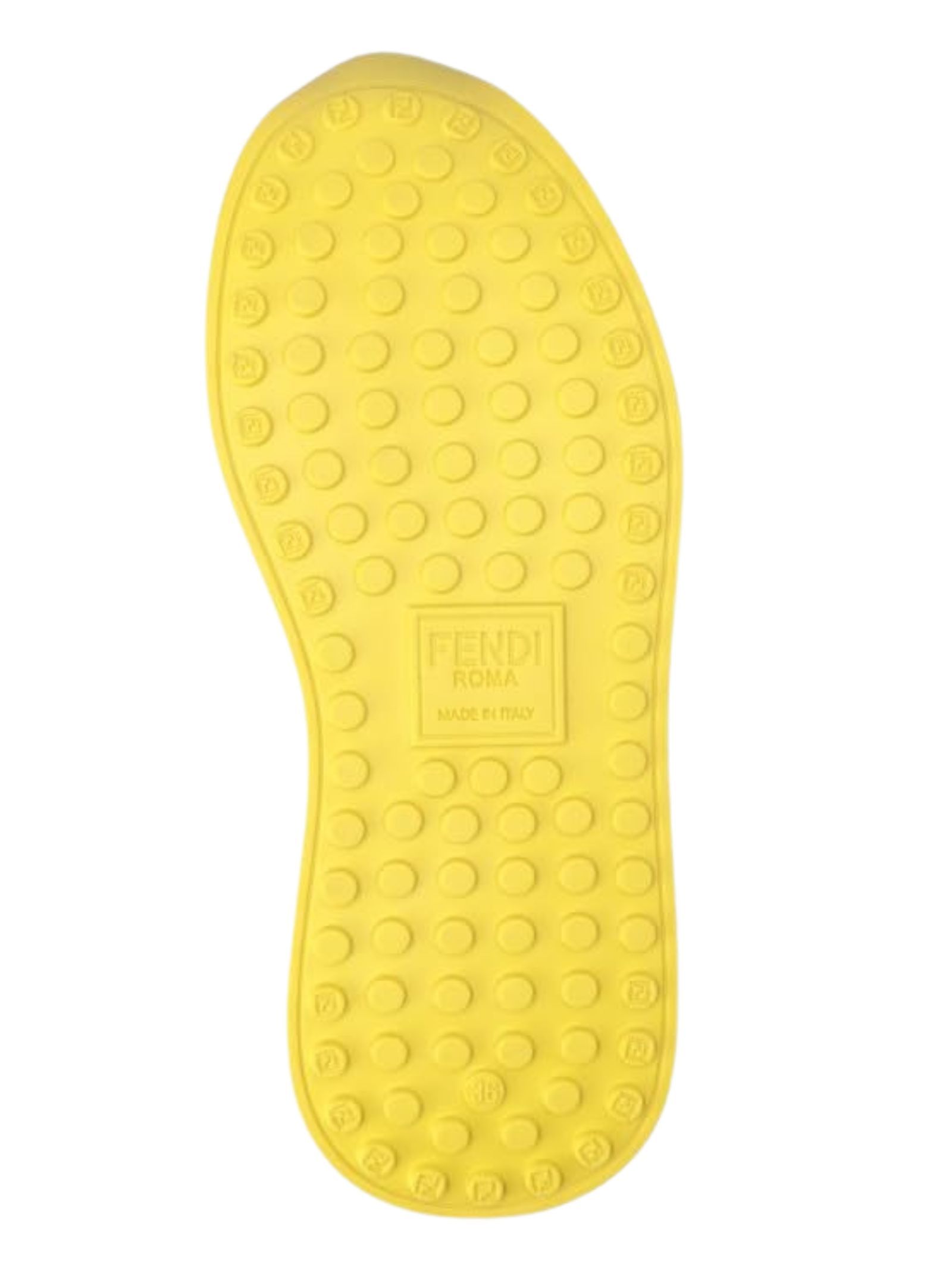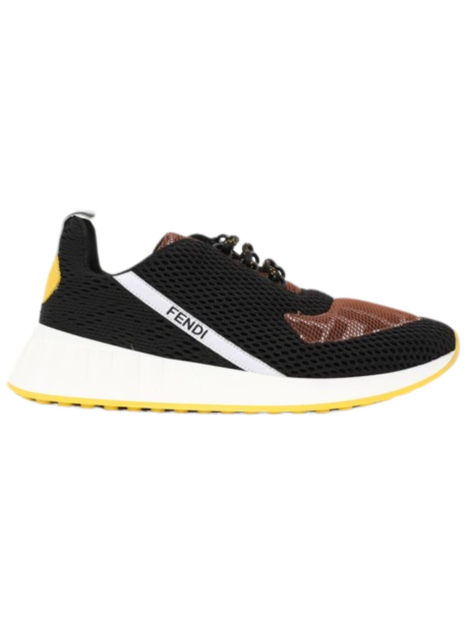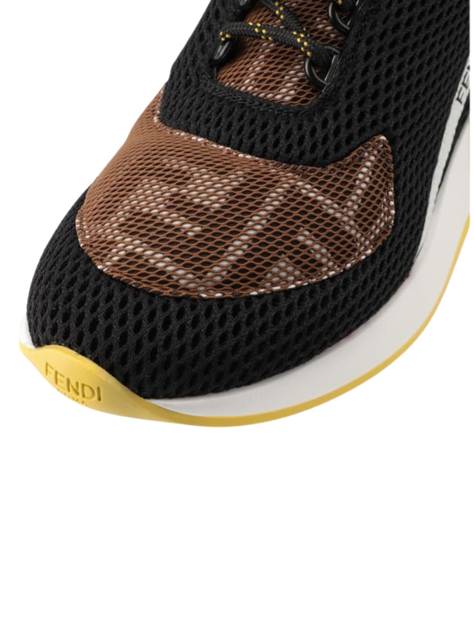 FENDI Kids scarpe in tela elastica, stringate, realizzate in rete, di colore nero con tomaia in mesh per un'impressione sportiva, parti in giallo e marrone, applicazione logo sul retro e sul laterale. Made in Italy